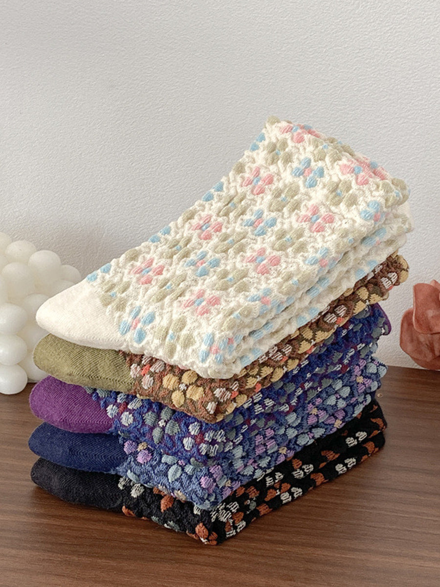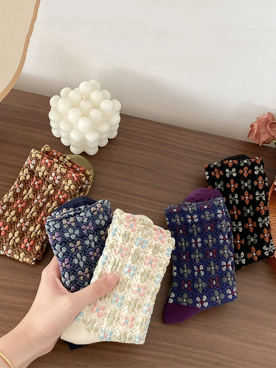 5 Pairs Women Vintage Floral Embossing Cotton Socks