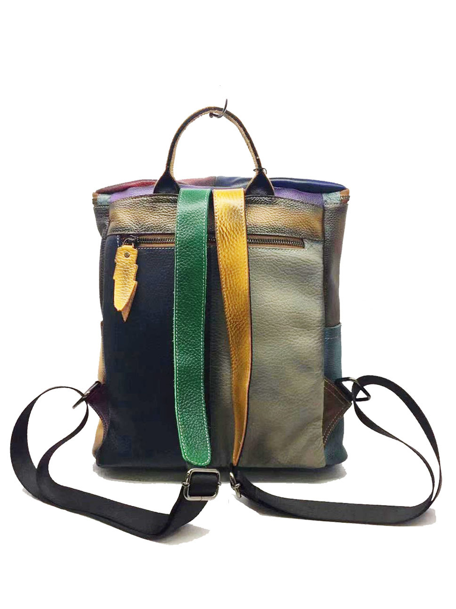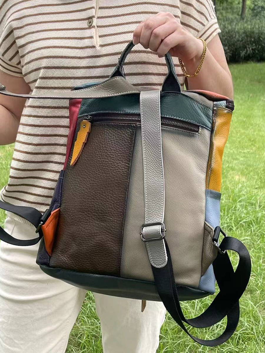 Retro Genunie Leather Colorblock Large Capacity Backpack