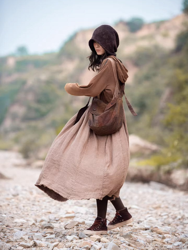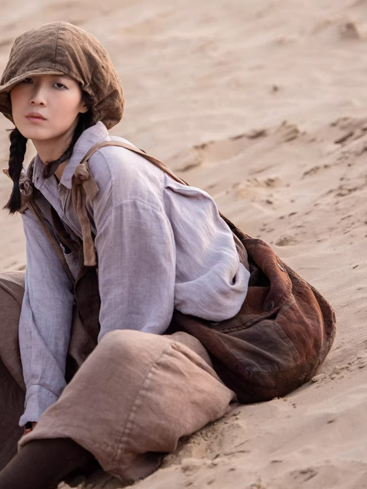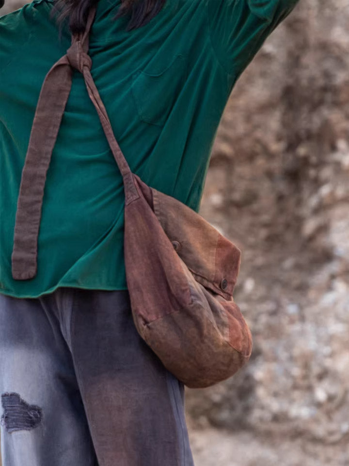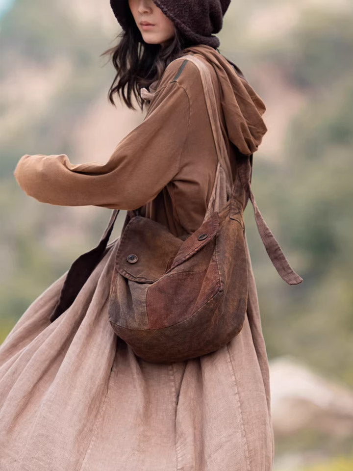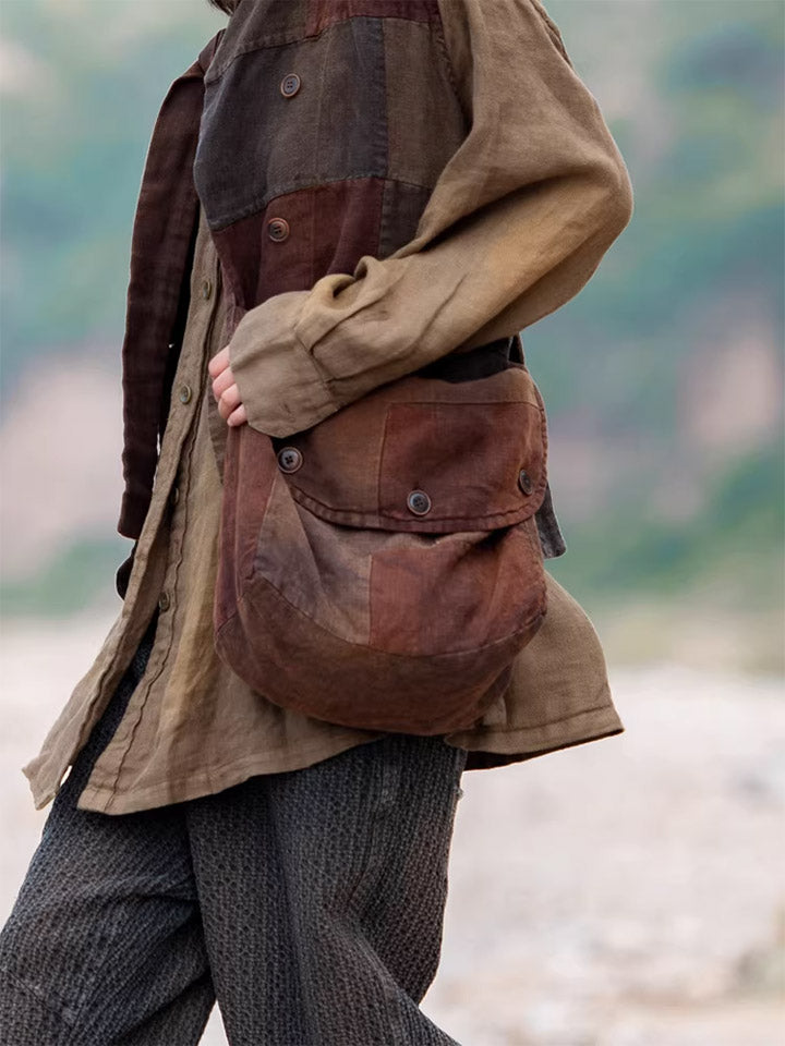 Vintage Brown Plant-dyed Linen Patchwork Messenger Bag
