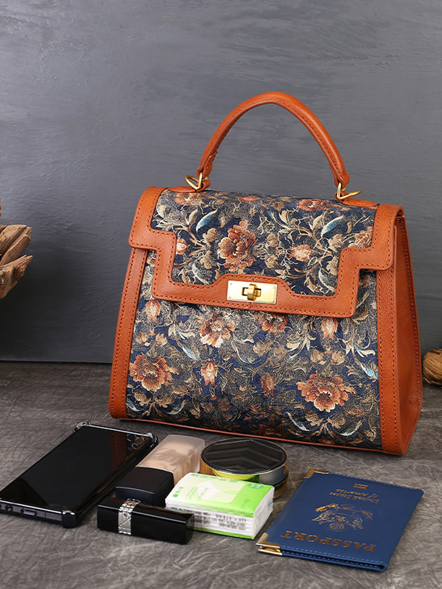This vintage floral embroidered tote bag combines top-grain cowhide leather with hand-painted gold embroidery. Featuring traditional couture stitching and fine gold thread details, it exudes luxury and craftsmanship. The vegetable-tanned leather adds a timeless, elegant touch with natural textures, making it a perfect blend of sophistication and vintage charm.