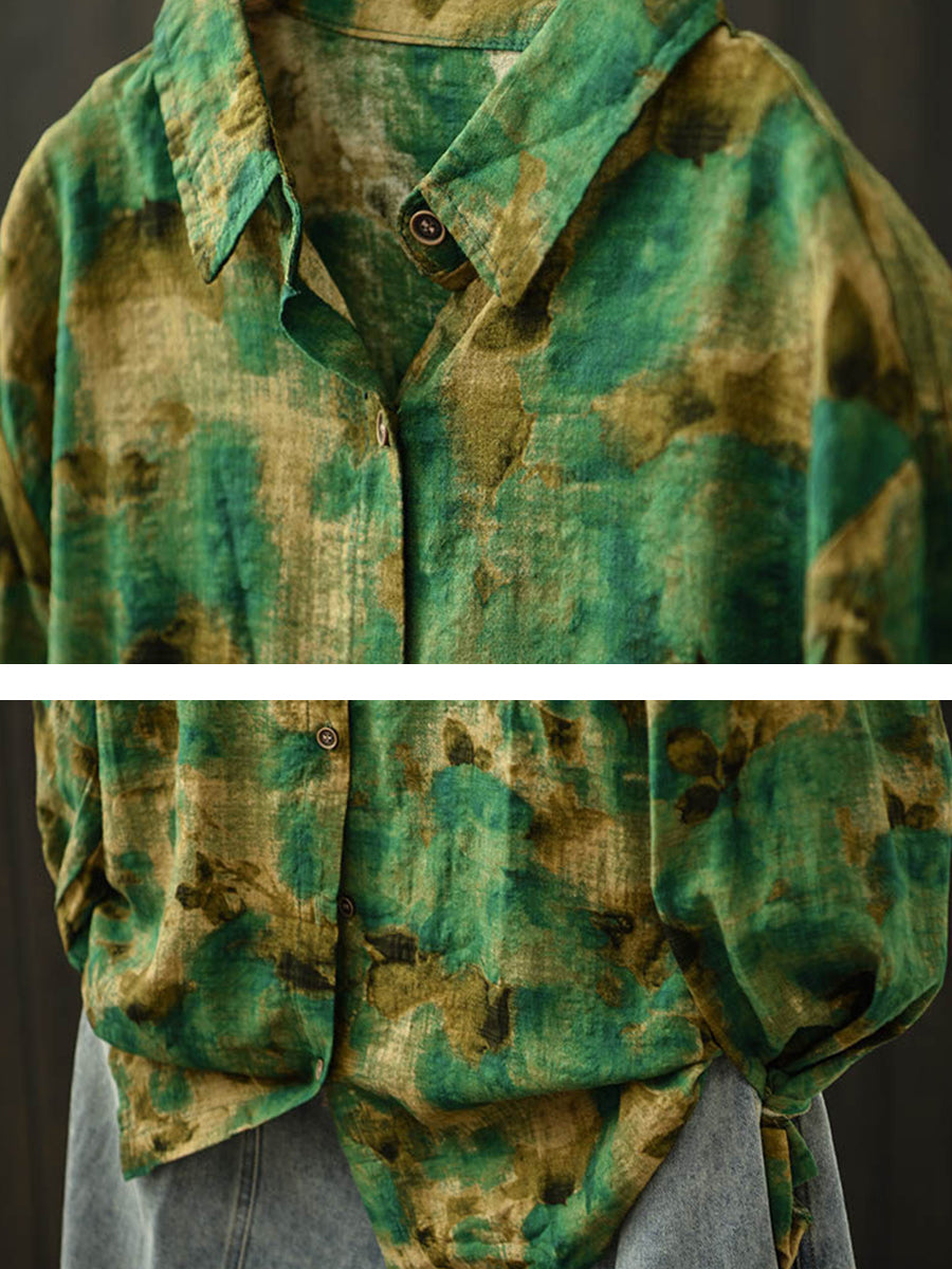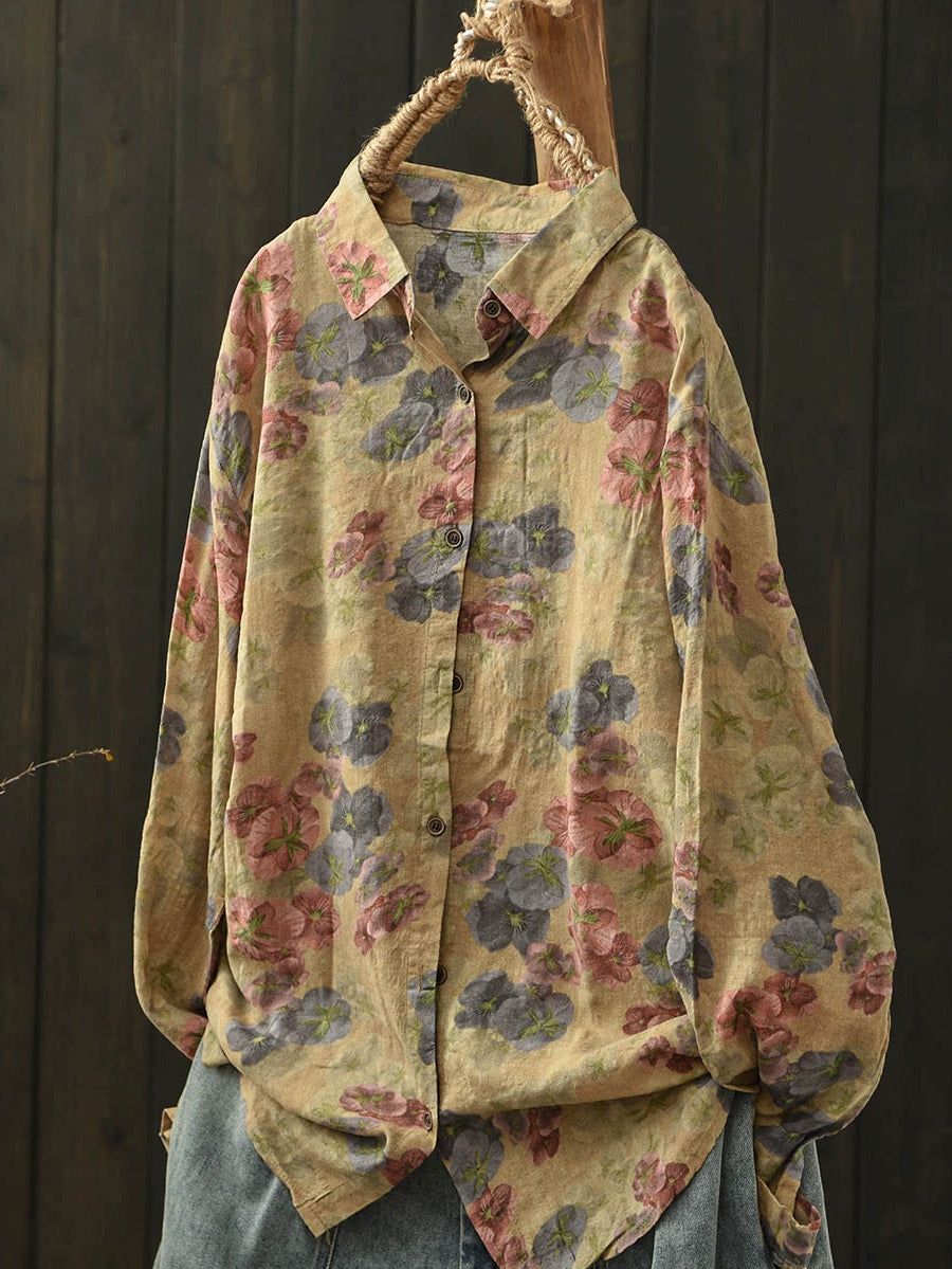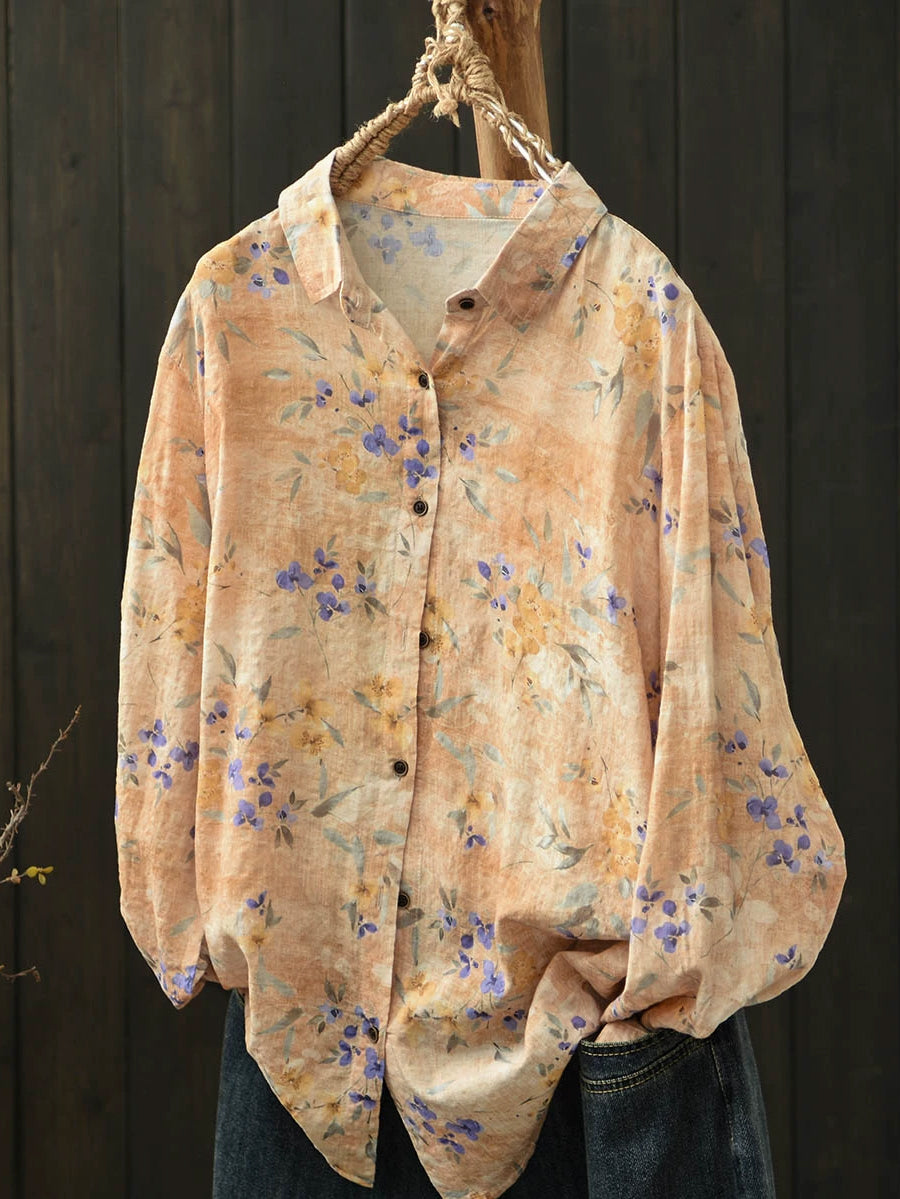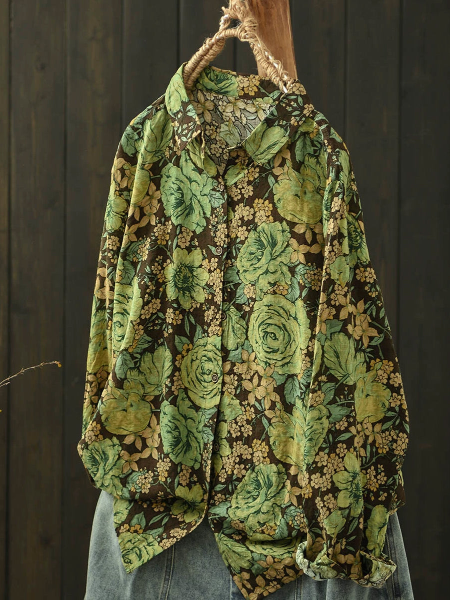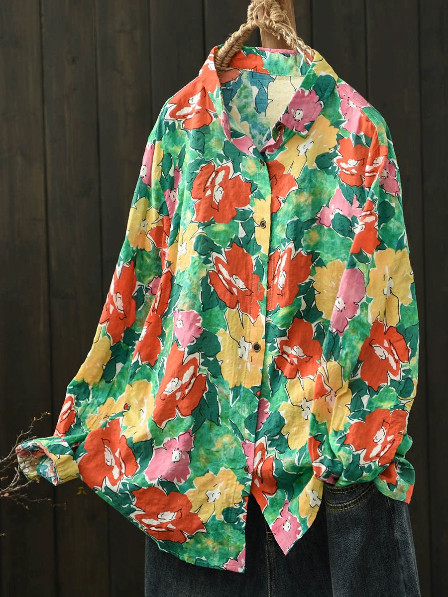 Women Artsy Spring Flower Turn-down Collar Cotton Blouse