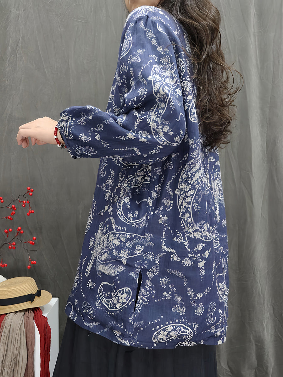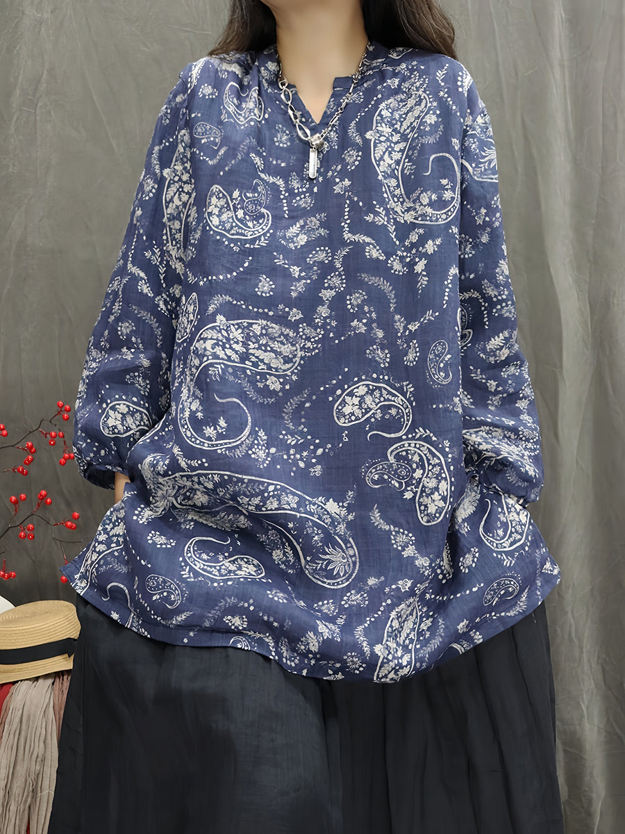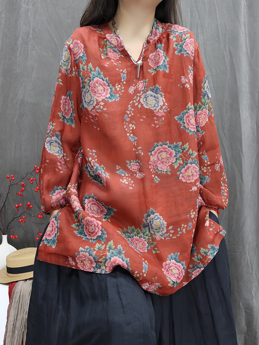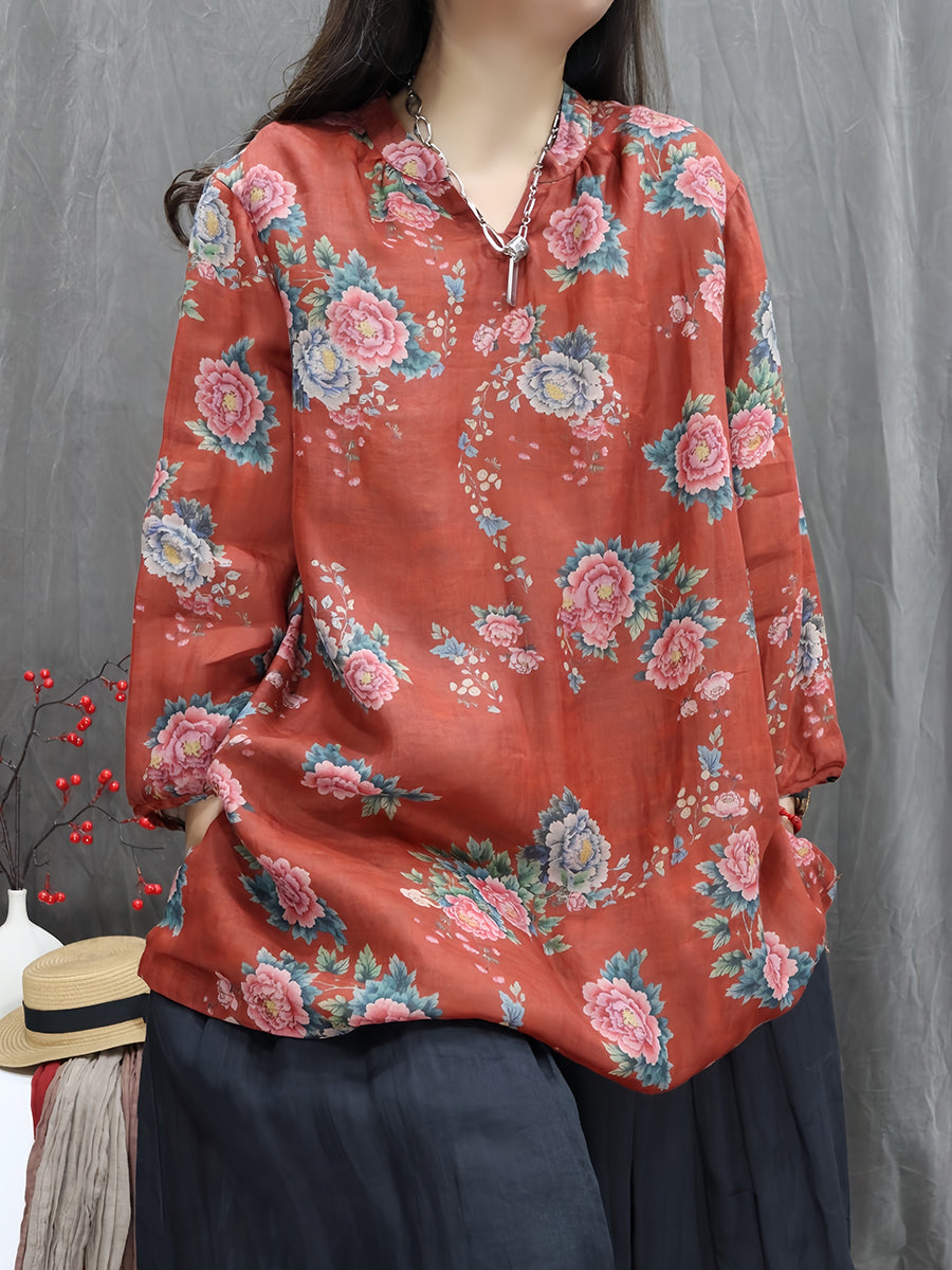 Women Artsy Spring Flower V-Neck 100%Ramie Blouse