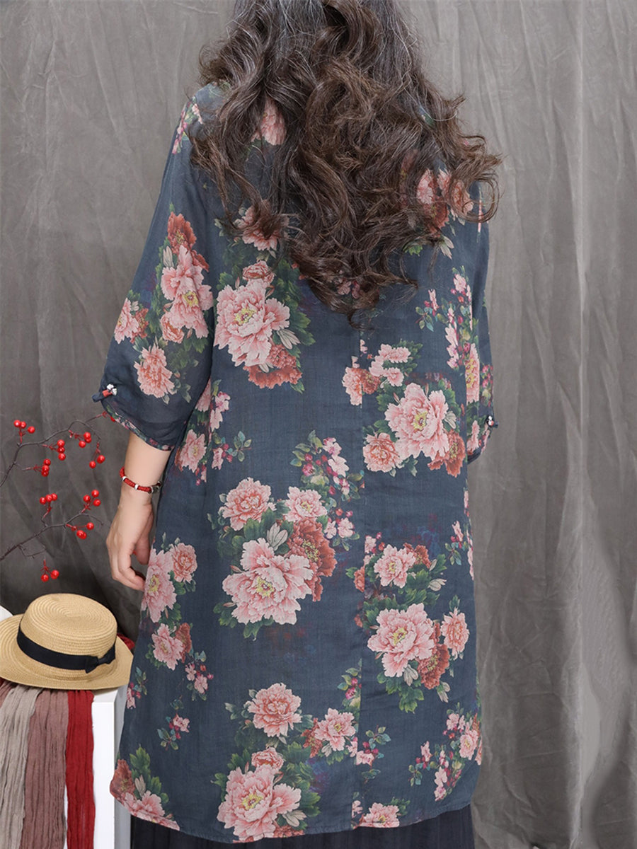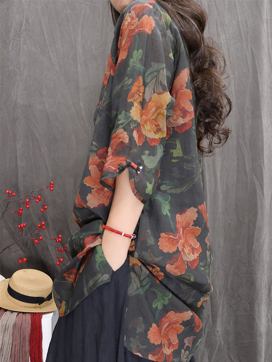 Women Artsy Summer Flower V-Neck 100%Ramie Blouse