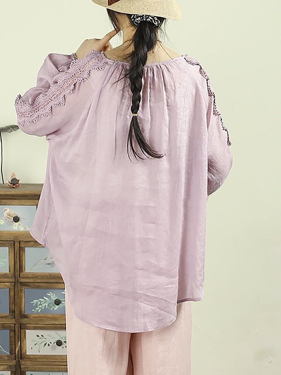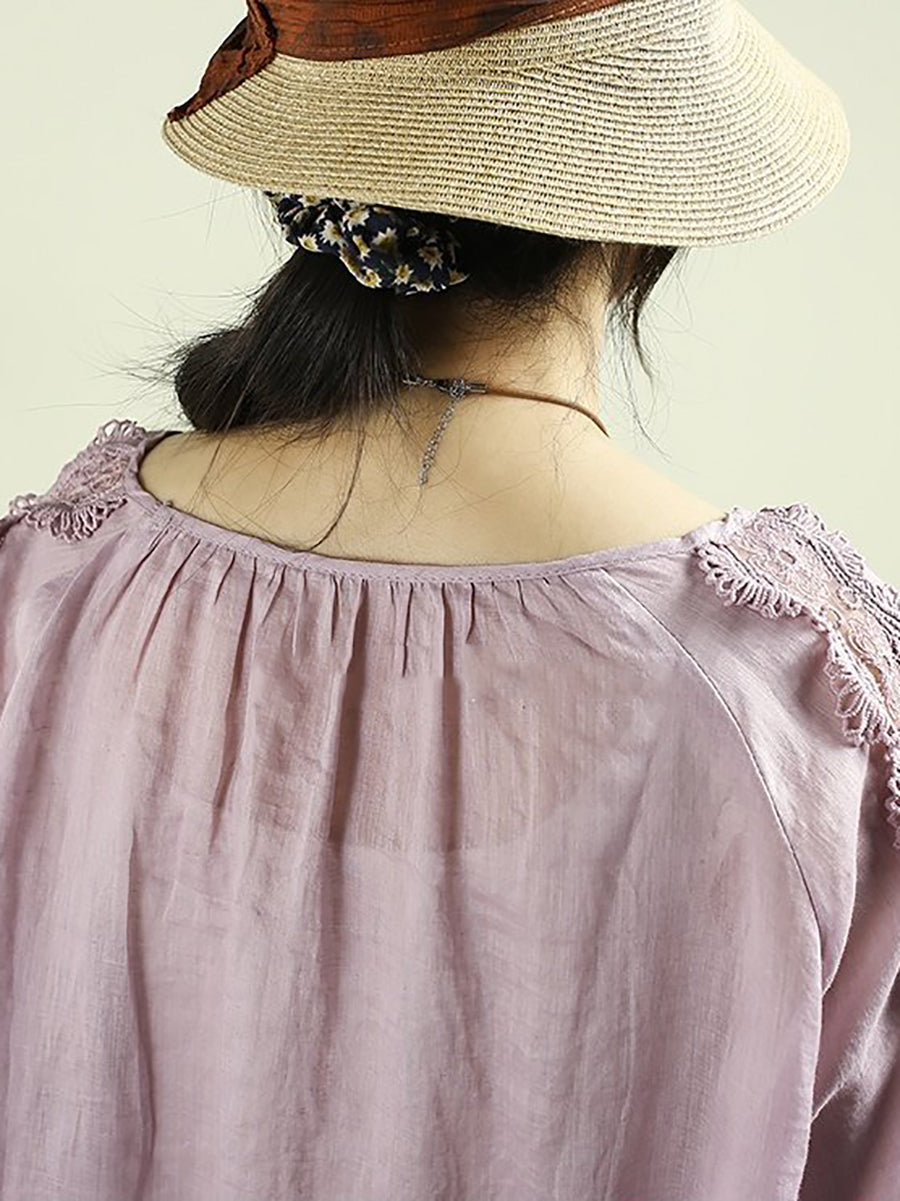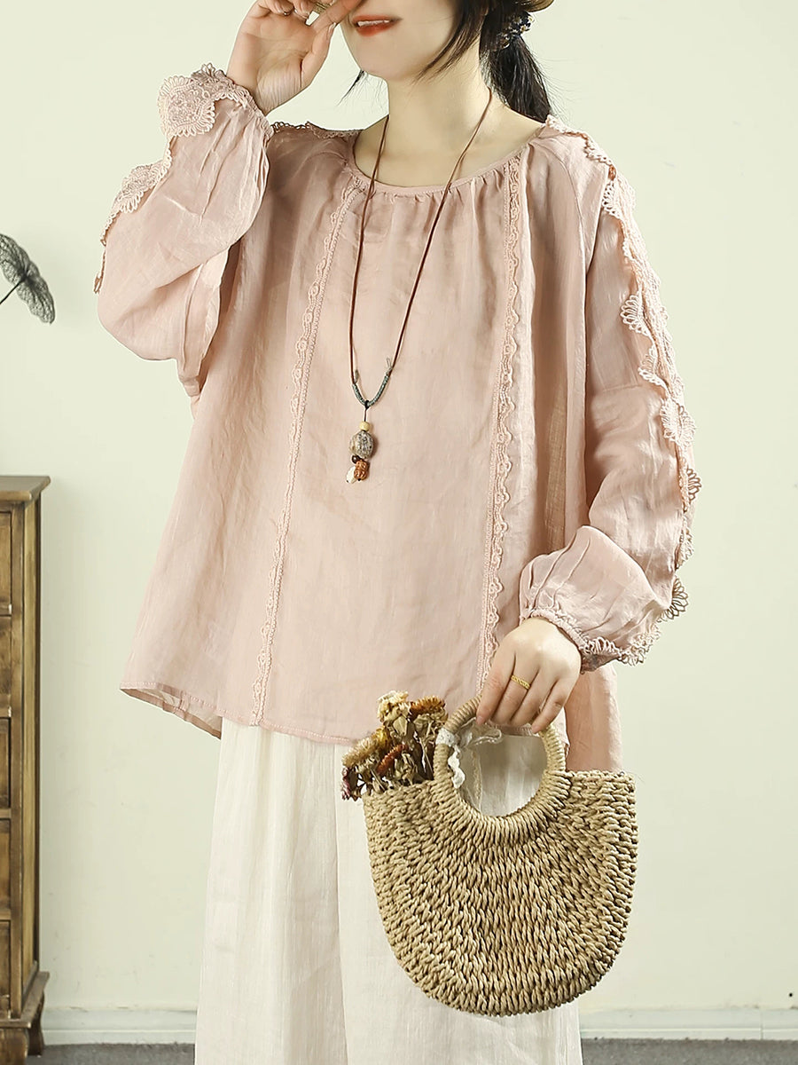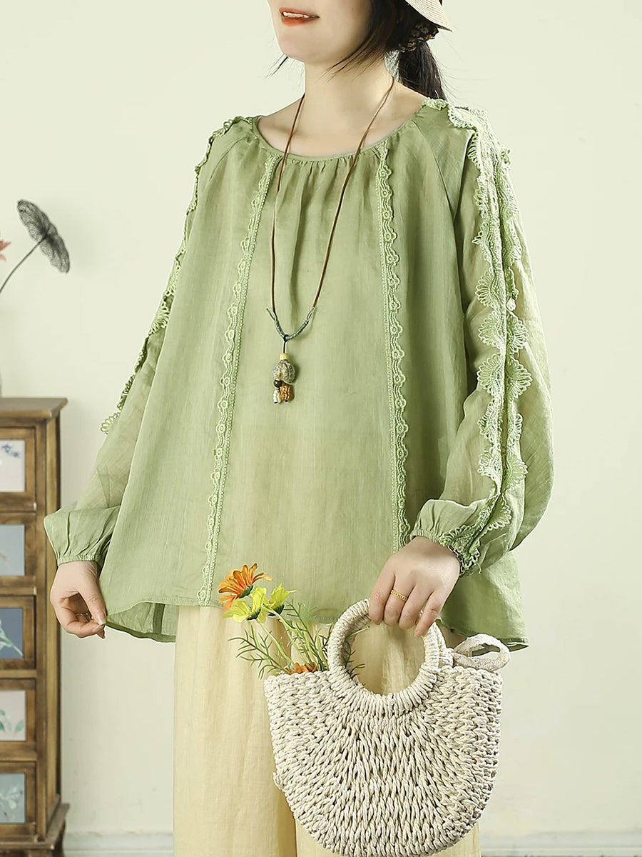 Women Artsy Spring Lace Spliced O-Neck 100%Ramie Shirt