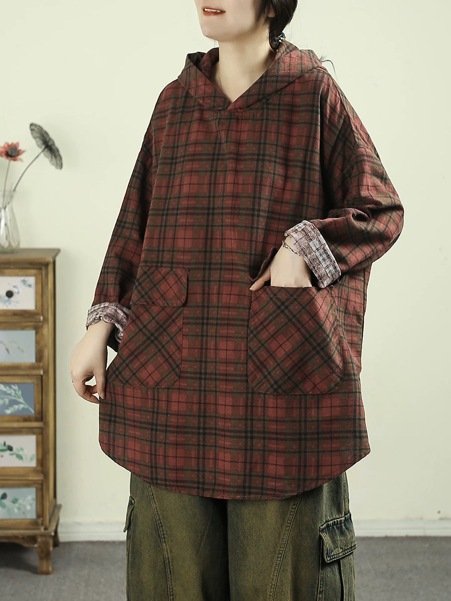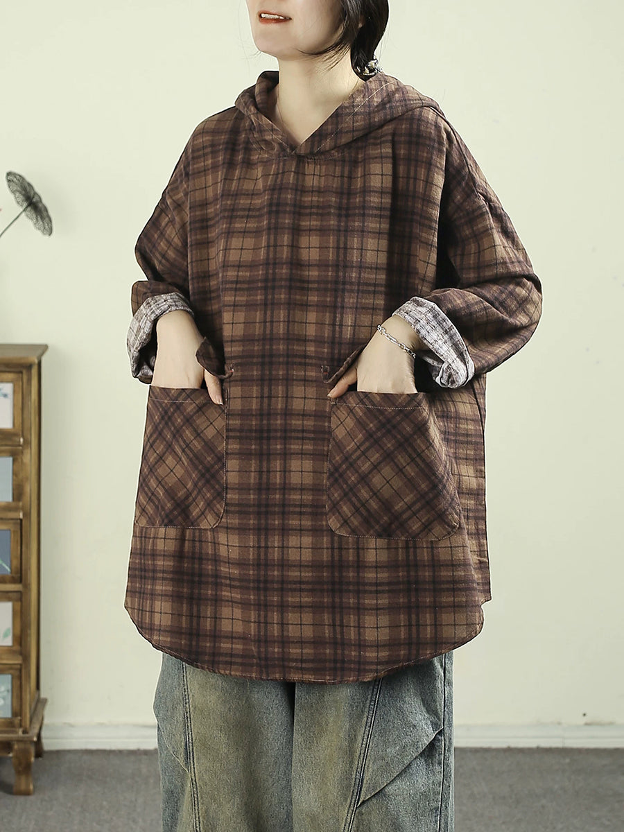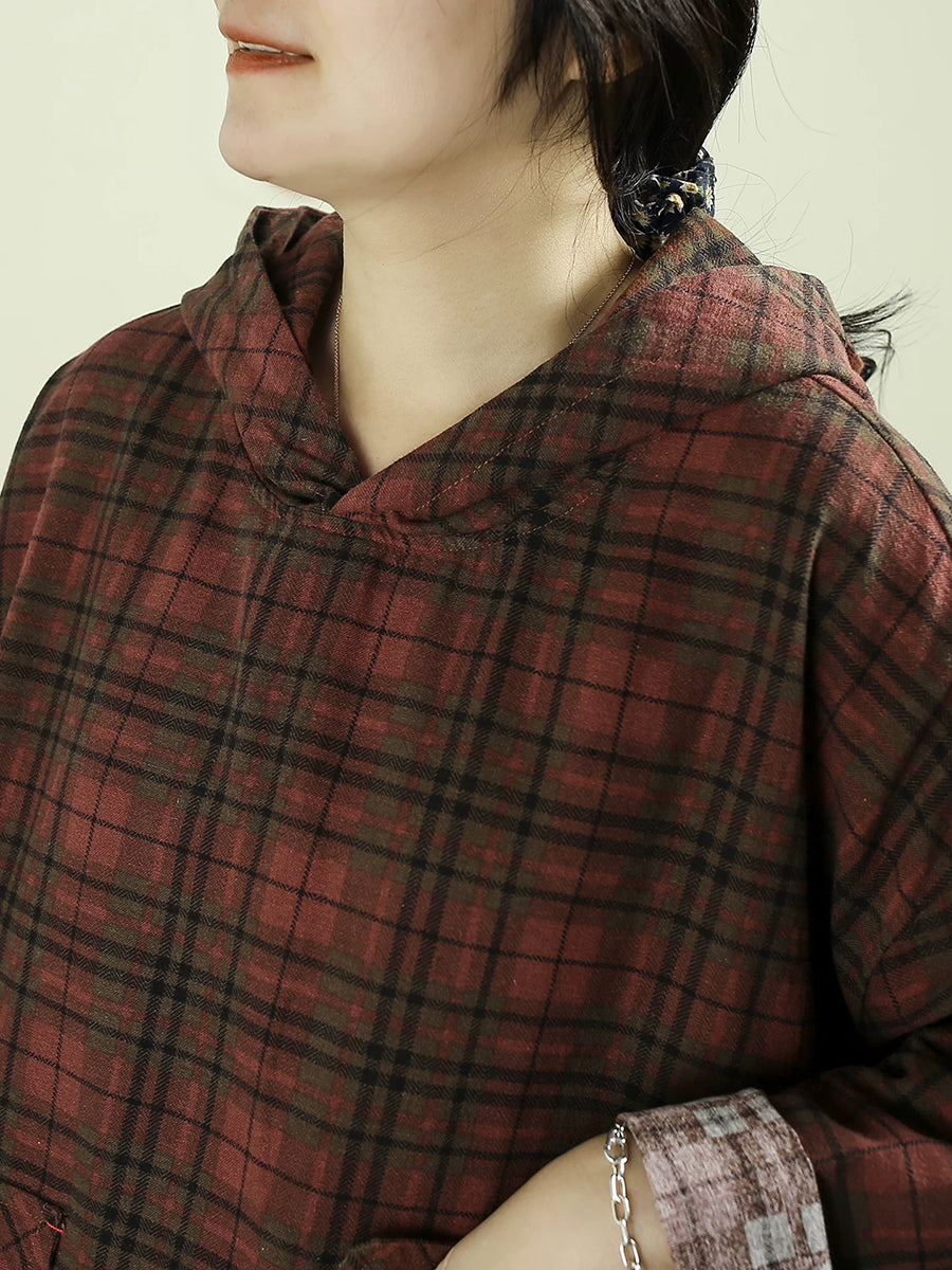 Women Artsy Spring Plaid Cotton Hoodie