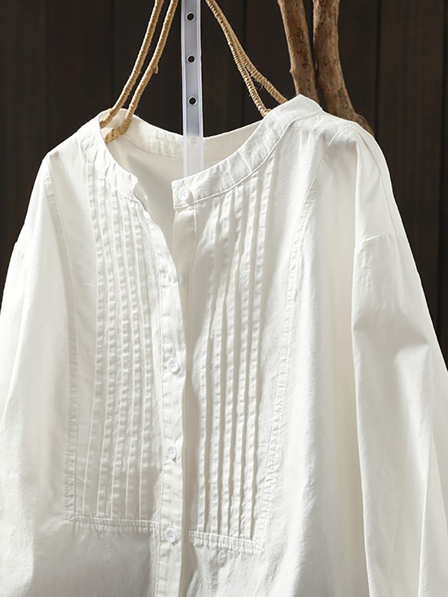 Women Artsy Spring Shirred Stand Collar 100%Cotton Shirt