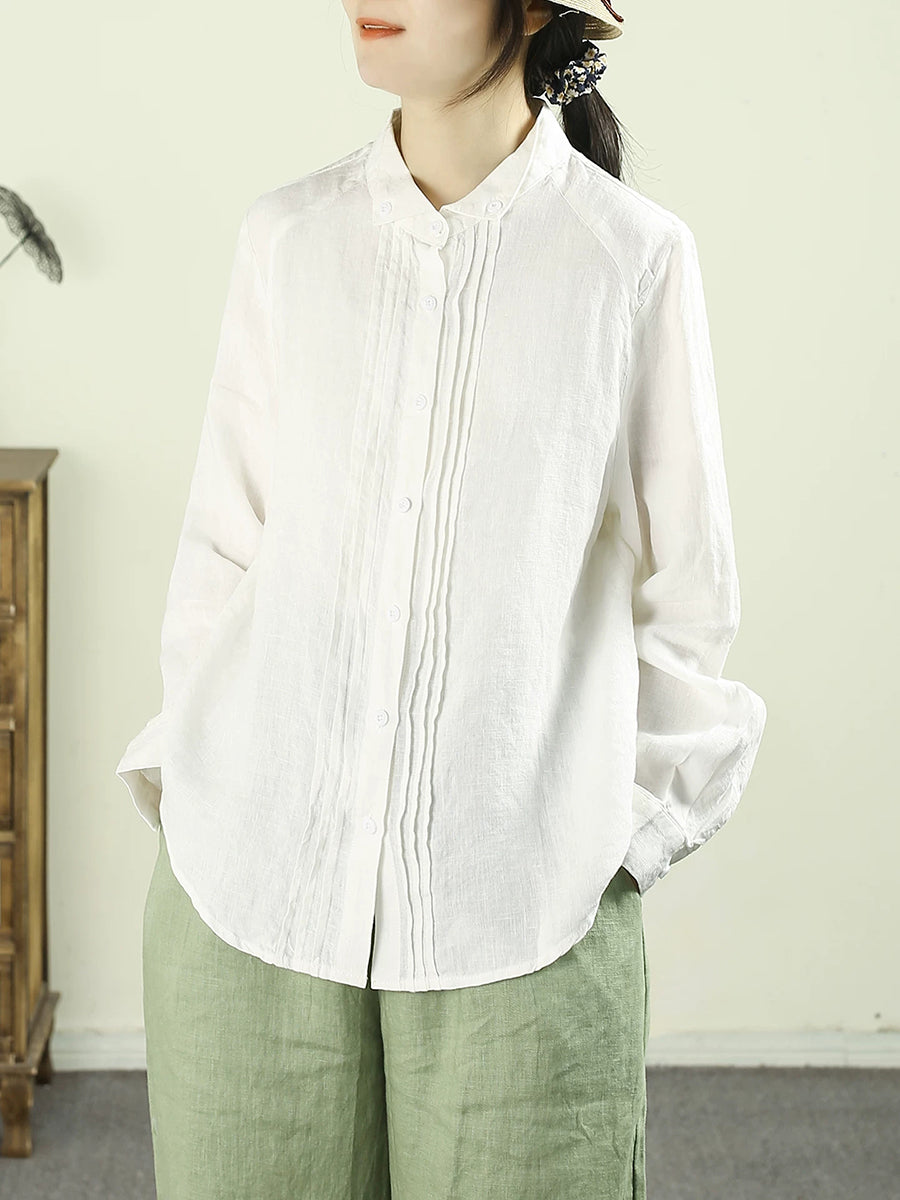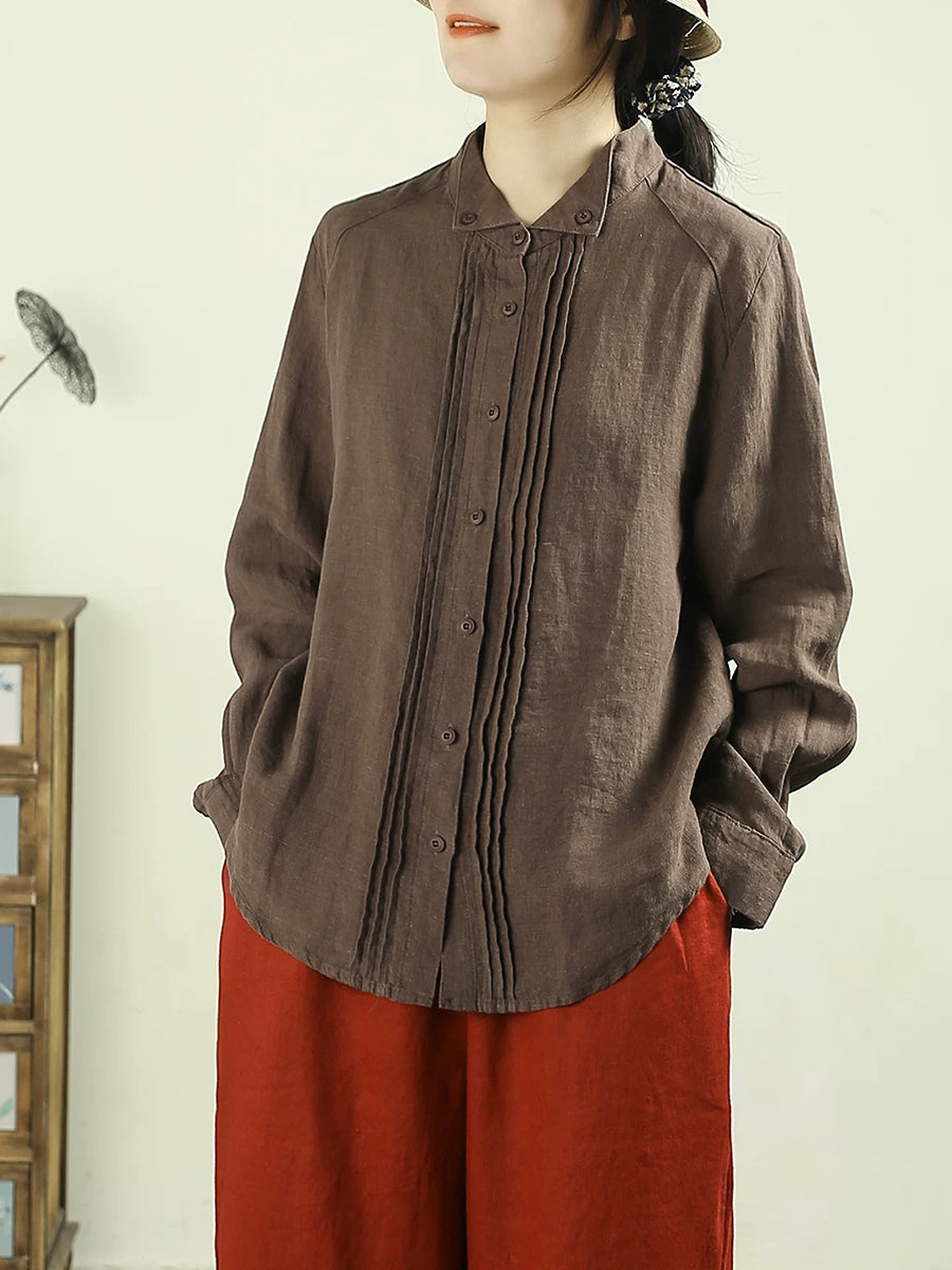 Women Artsy Spring Shirred Pure Color 100%Linen Shirt