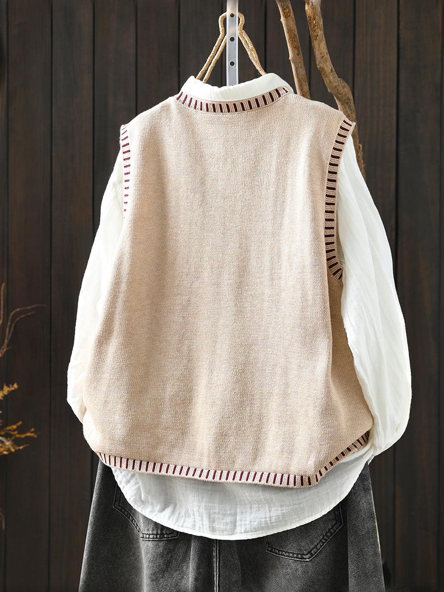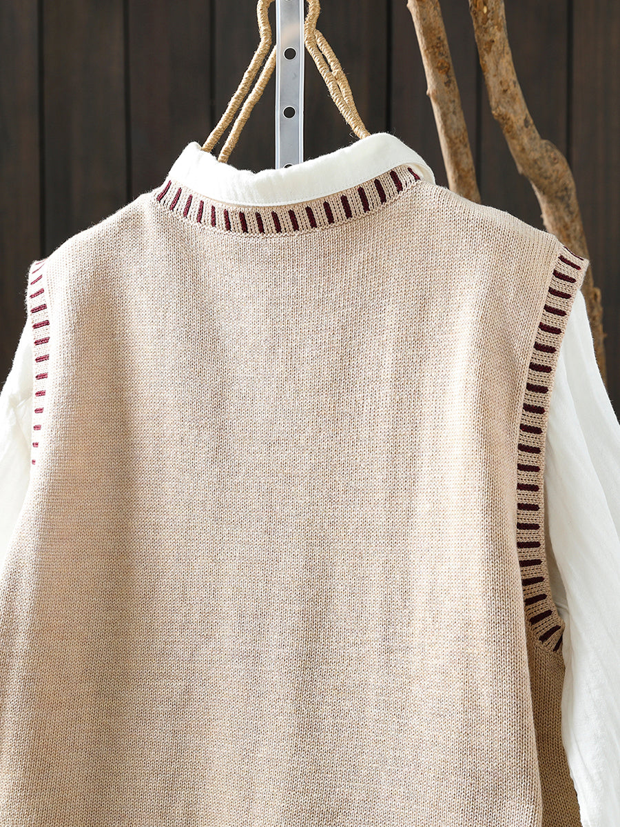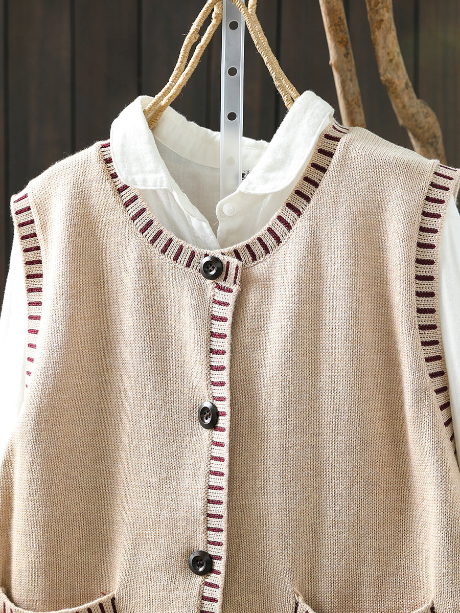 This knitted vest combines functionality with timeless design through its thoughtfully balanced fiber composition of 55% cotton and 45% acrylic. The round neckline and retro-inspired silhouette offer sophisticated styling options for layering during autumn and winter months. The knit structure provides optimal temperature regulation and flexibility, making it a reliable wardrobe staple across seasonal transitions.