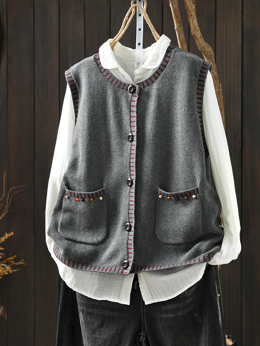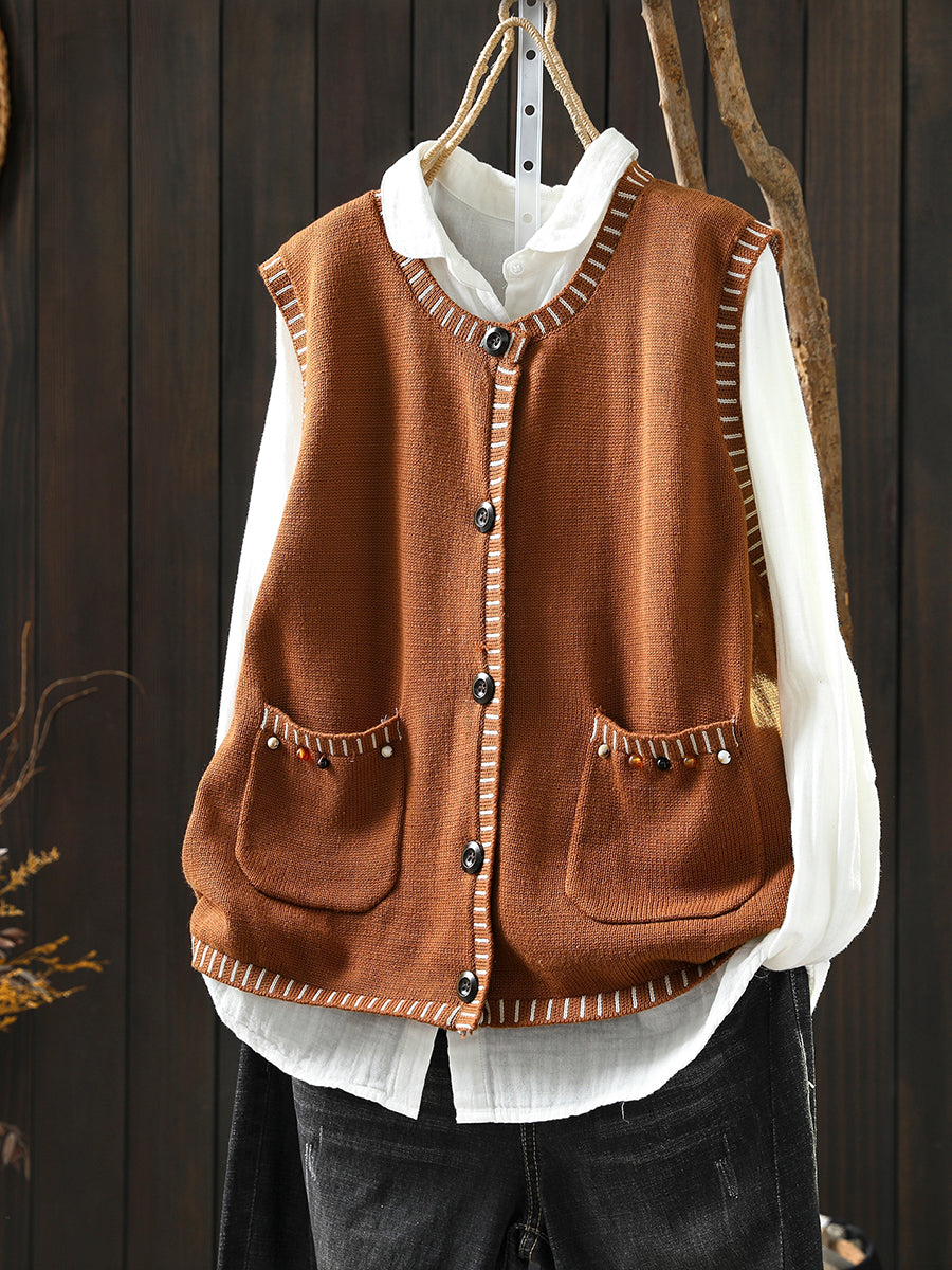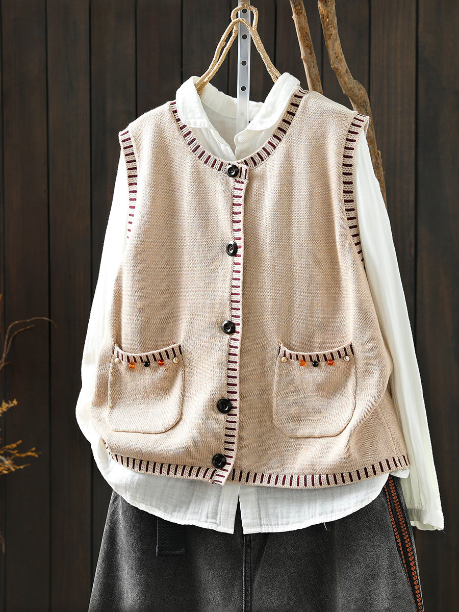 This knitted vest combines functionality with timeless design through its thoughtfully balanced fiber composition of 55% cotton and 45% acrylic. The round neckline and retro-inspired silhouette offer sophisticated styling options for layering during autumn and winter months. The knit structure provides optimal temperature regulation and flexibility, making it a reliable wardrobe staple across seasonal transitions.