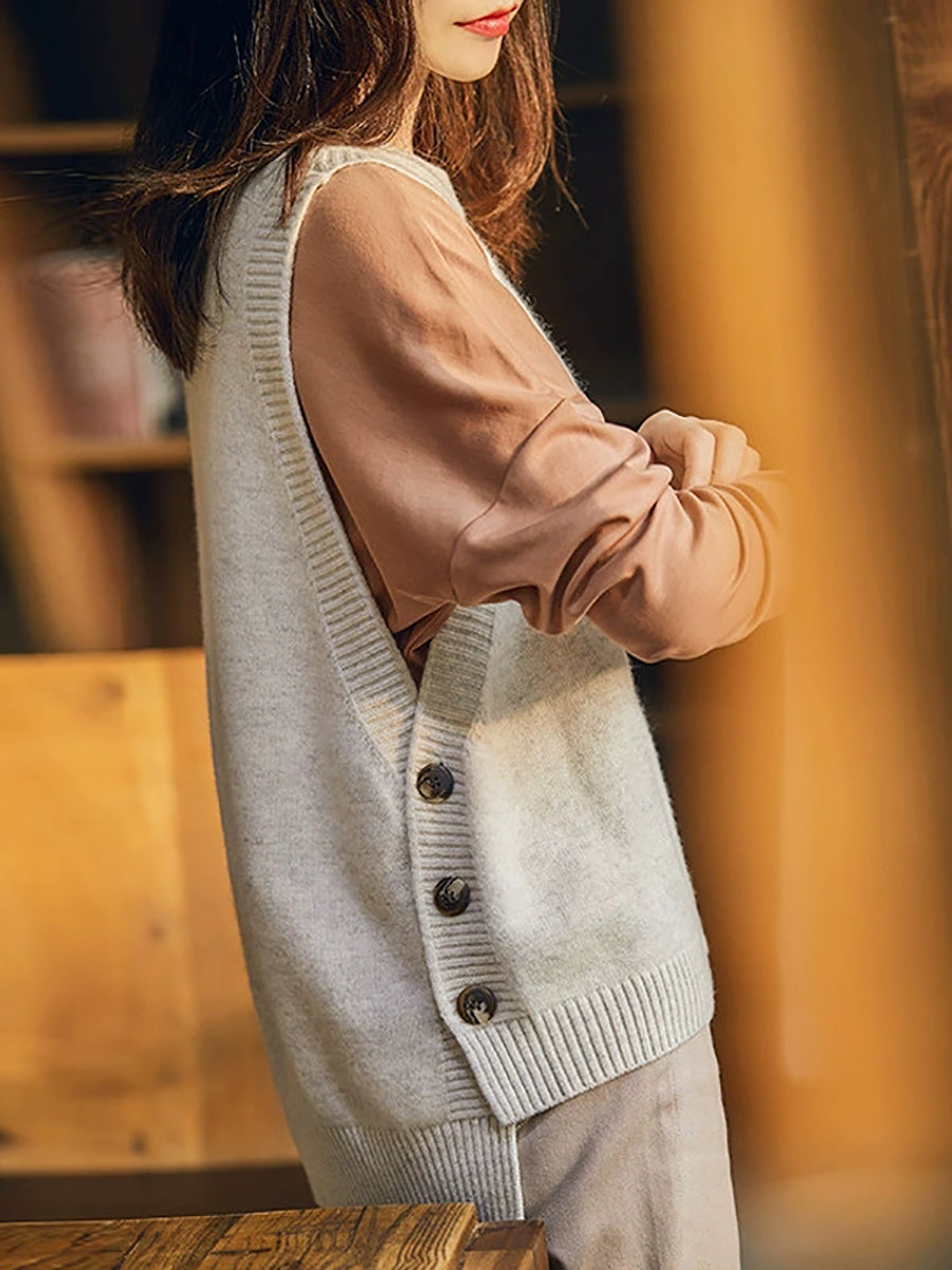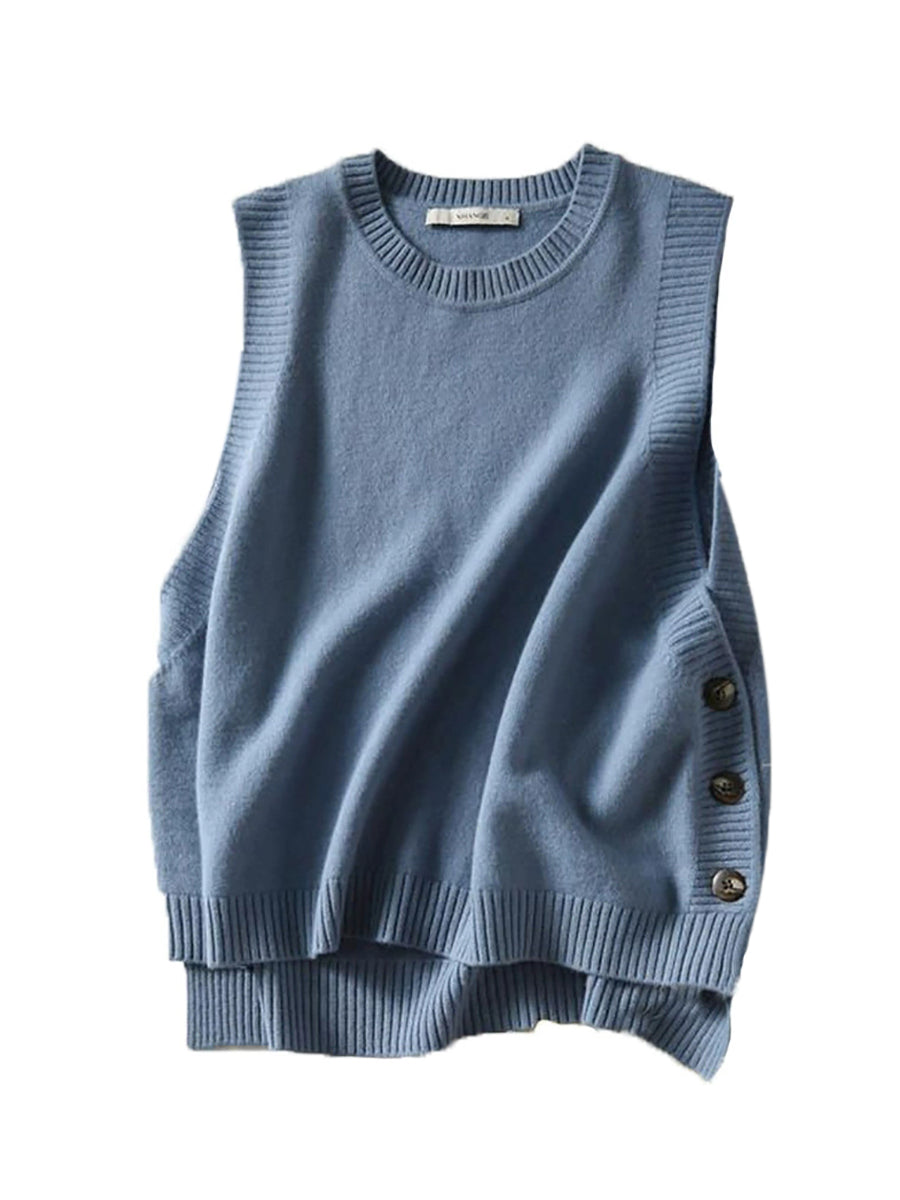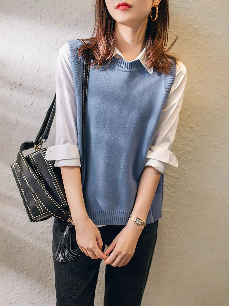 Women Autumn Artsy Pure Color O-Neck Knitted Vest