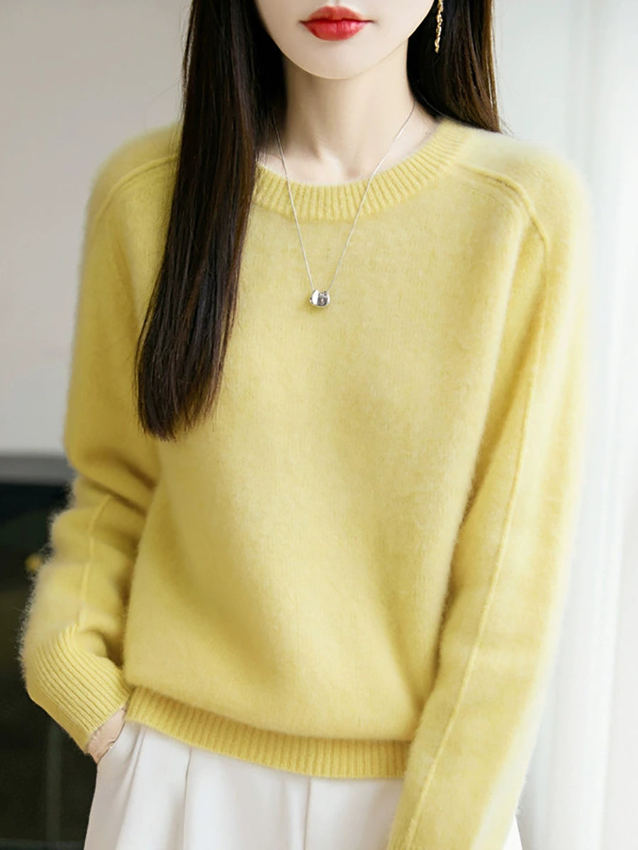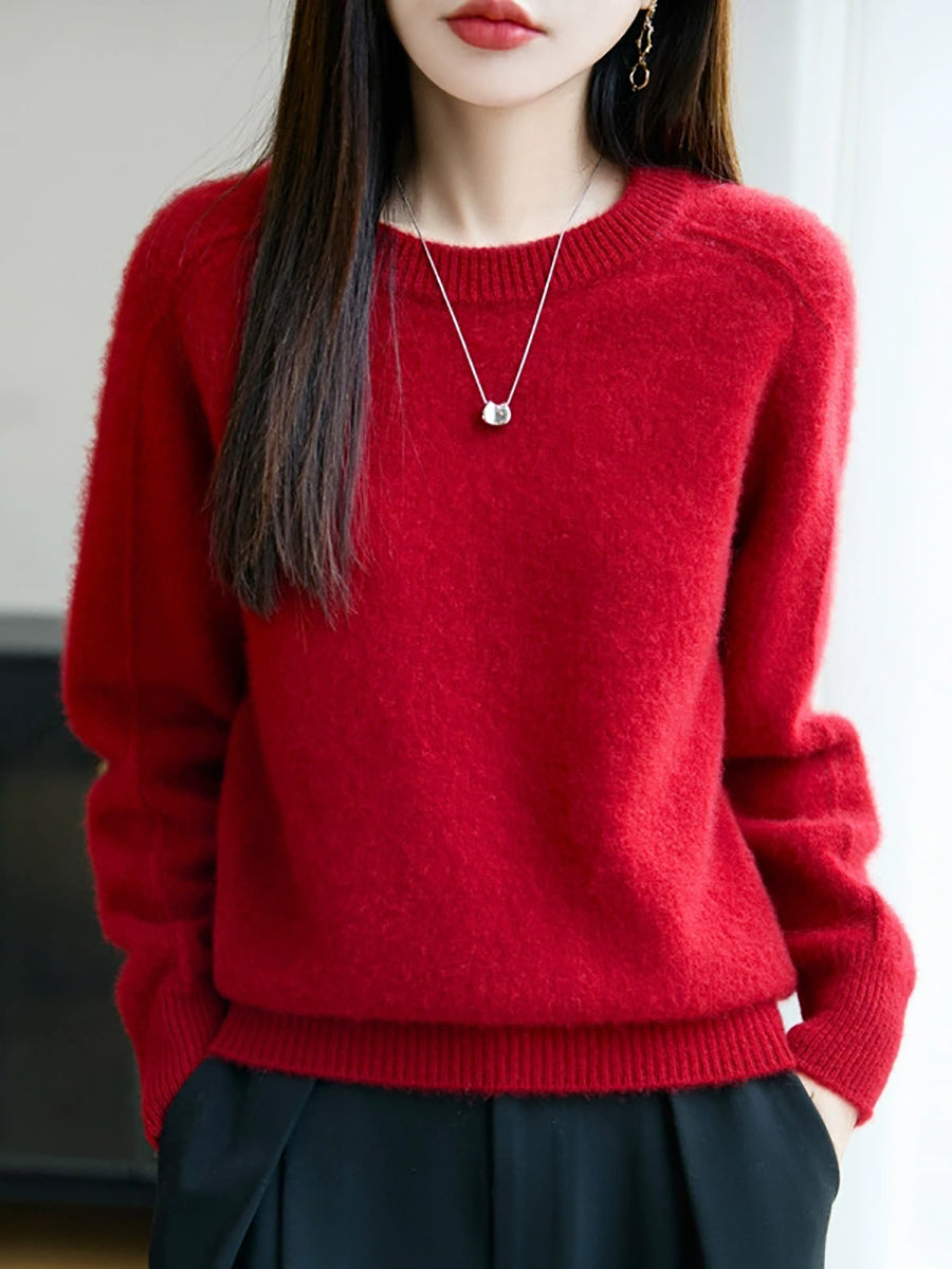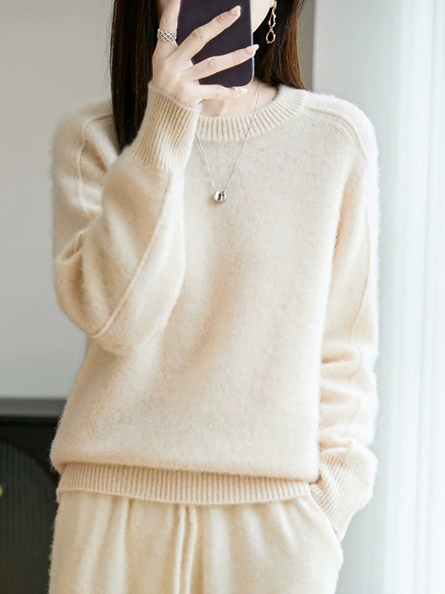 Women Autumn Artsy Pure Color O-Neck Wool Sweater