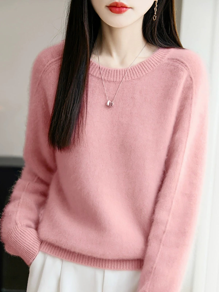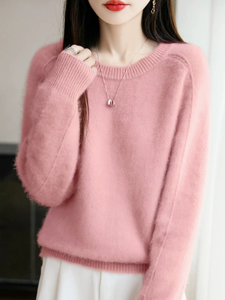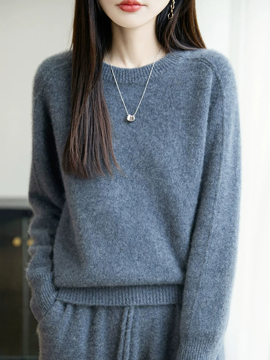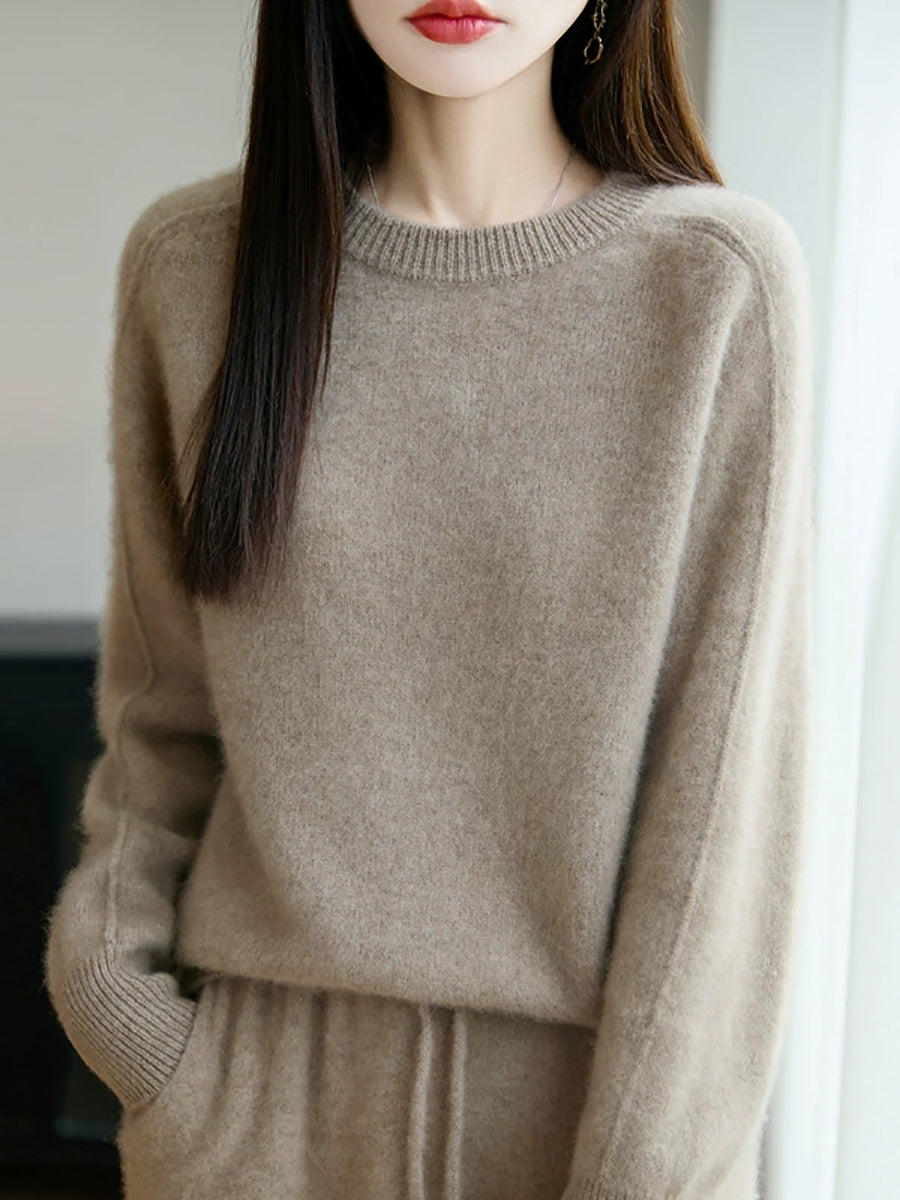 Women Autumn Artsy Pure Color O-Neck Wool Sweater