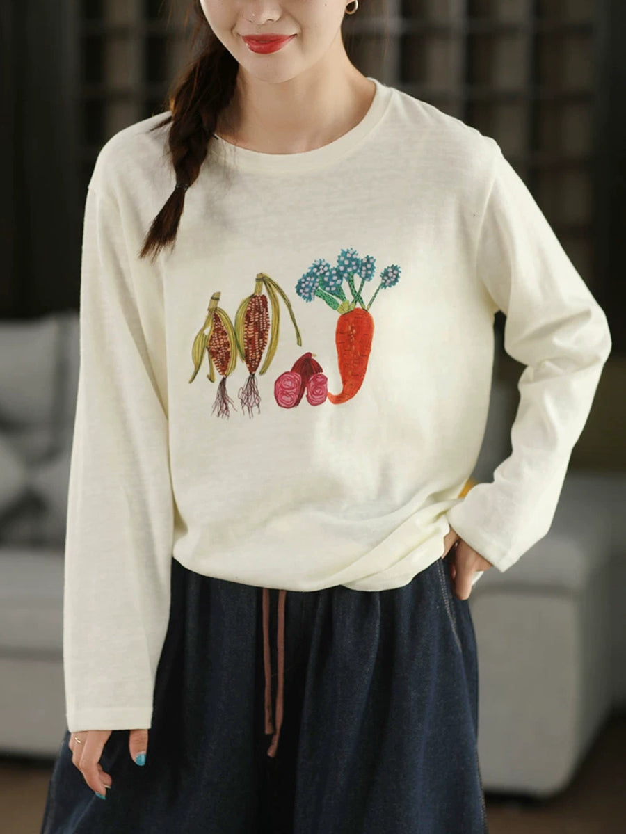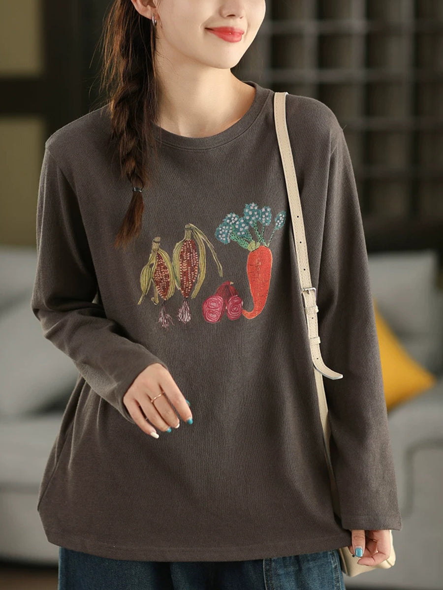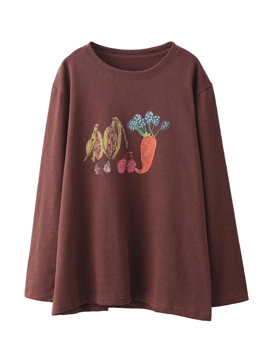 Women Autumn Artsy Vegetables O-Neck Cotton Blouse
