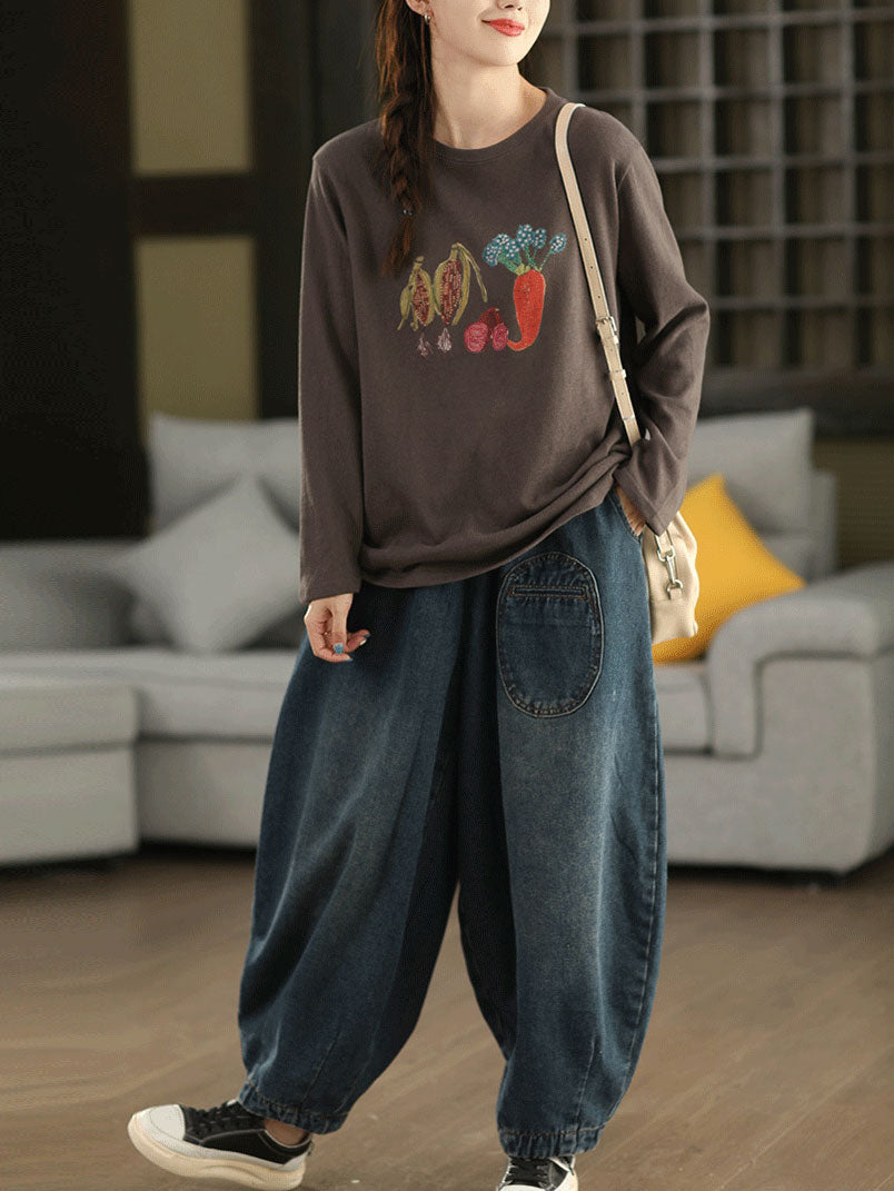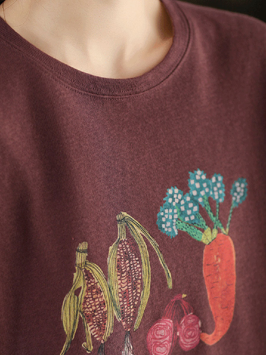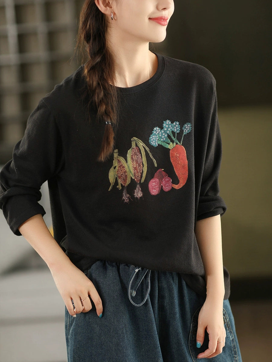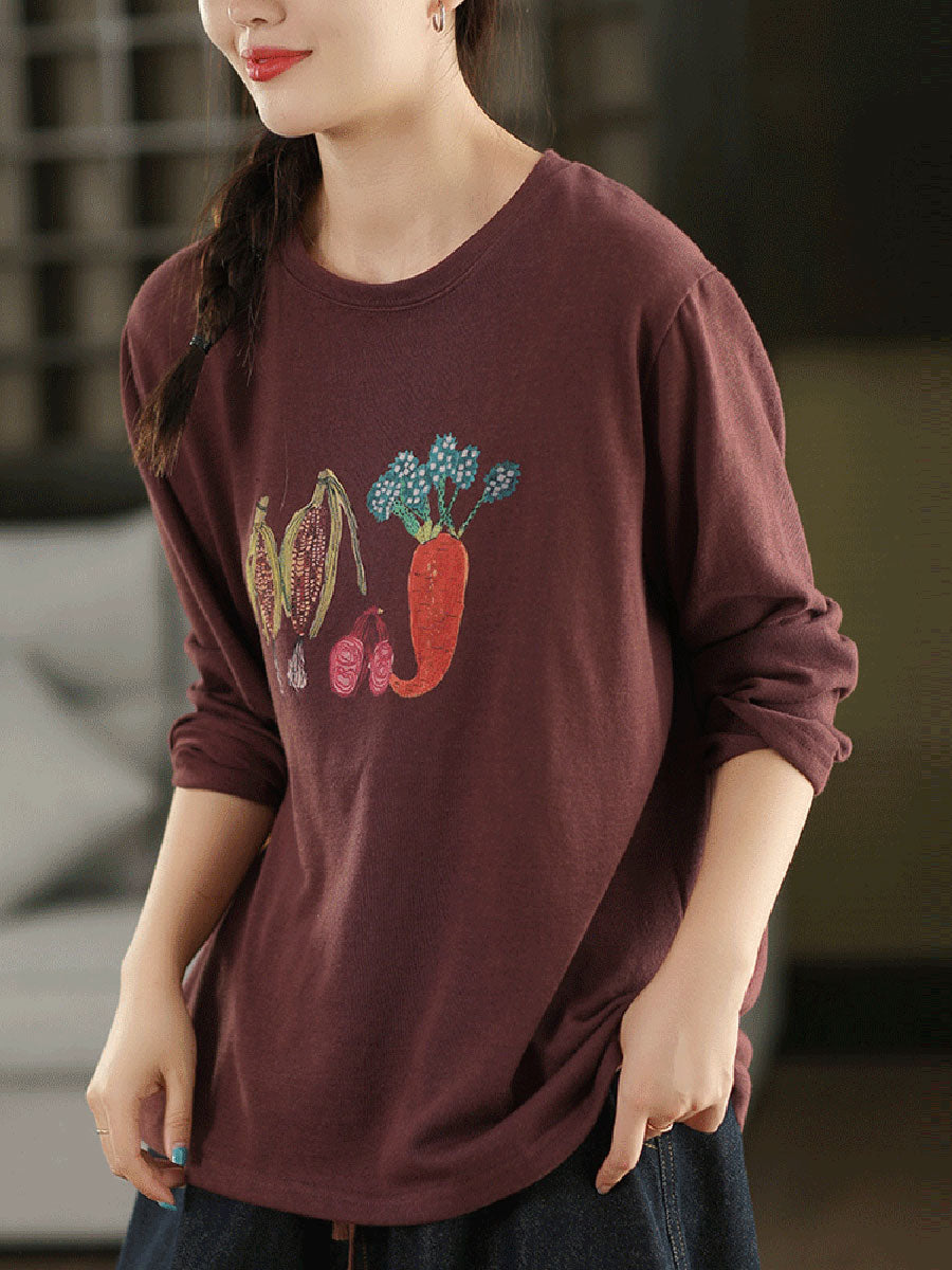 Women Autumn Artsy Vegetables O-Neck Cotton Blouse