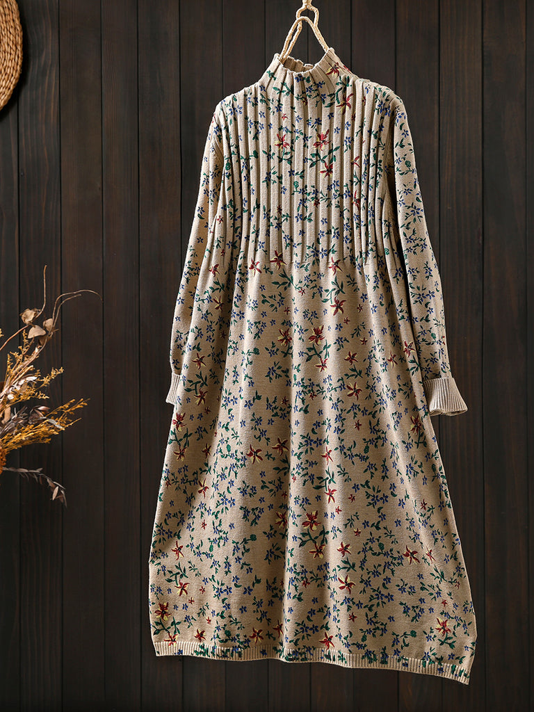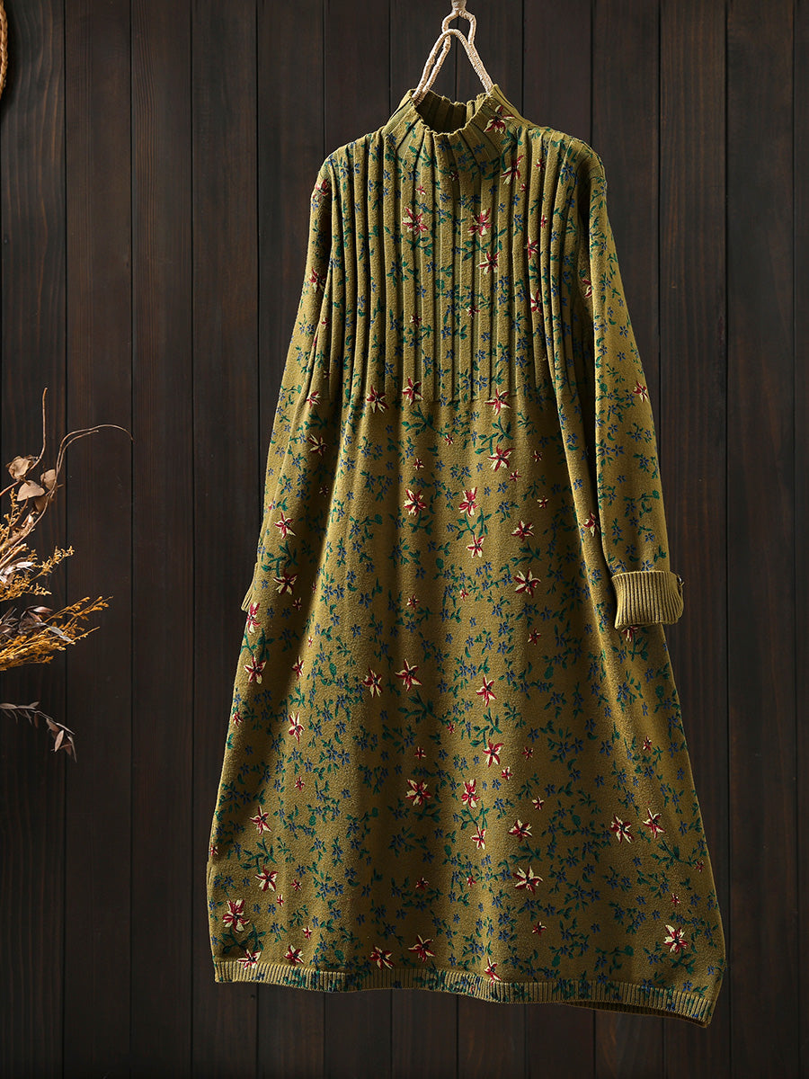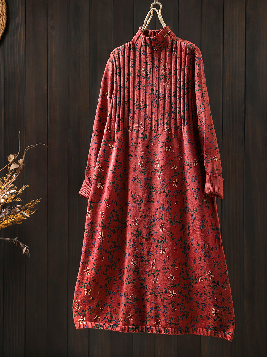 Women Autumn Vintage Floral Half-Turtleneck Knitted Dress