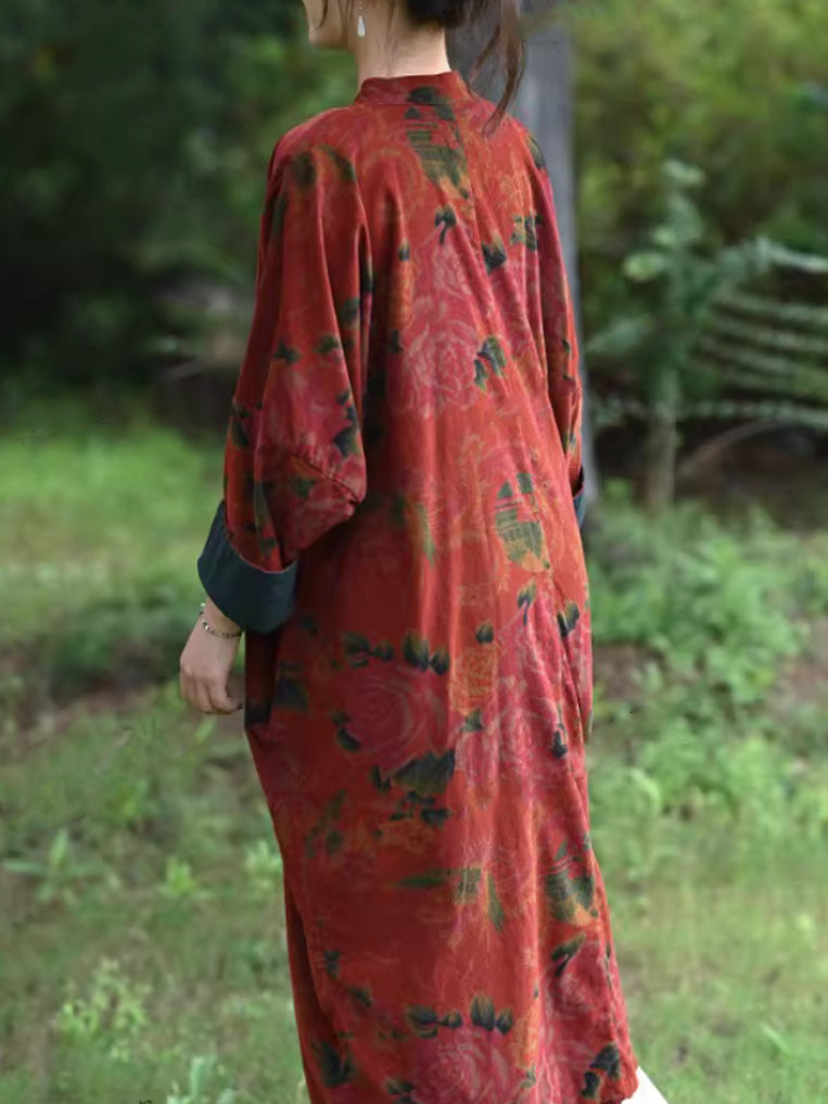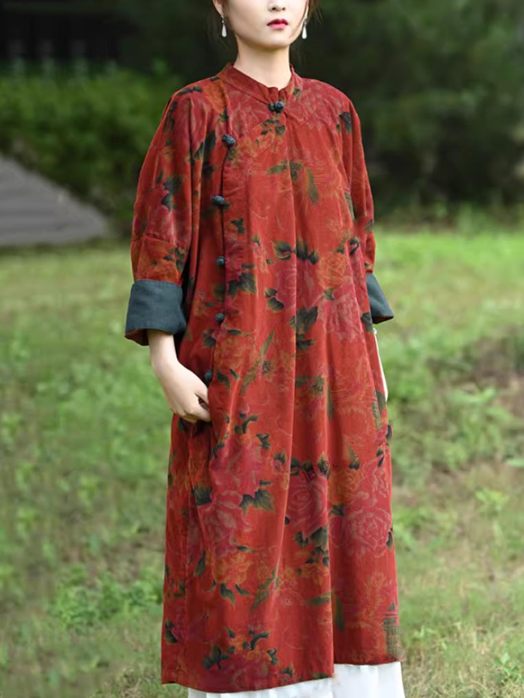 Women Autumn Vintage Flower Stand Collar 100%Cotton Dress