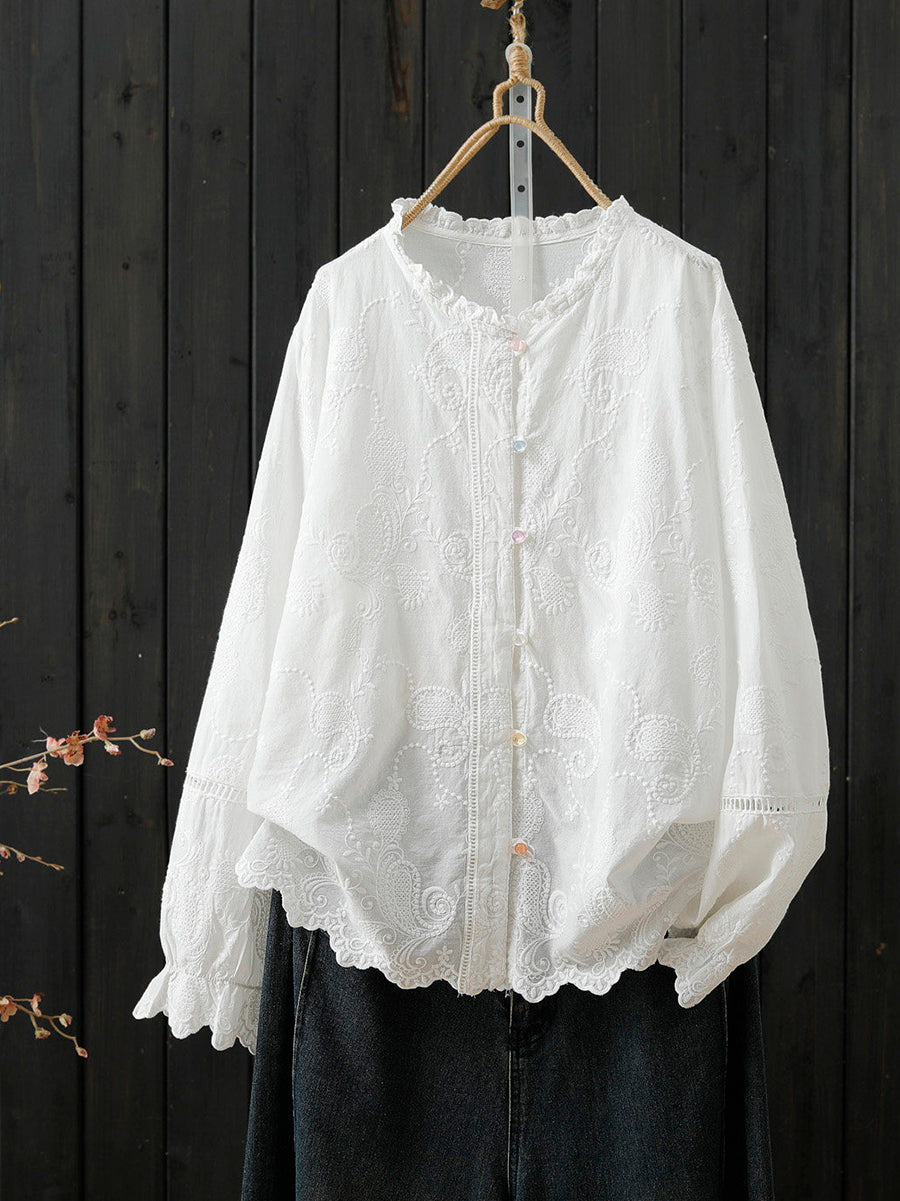 Women Spring Artsy Embroidery 100%Cotton Stand Collar Shirt