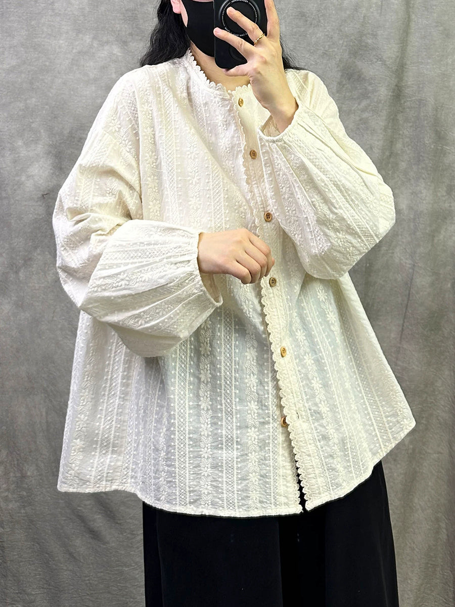 Women Spring Artsy Embroidery Cotton Stand Collar Shirt