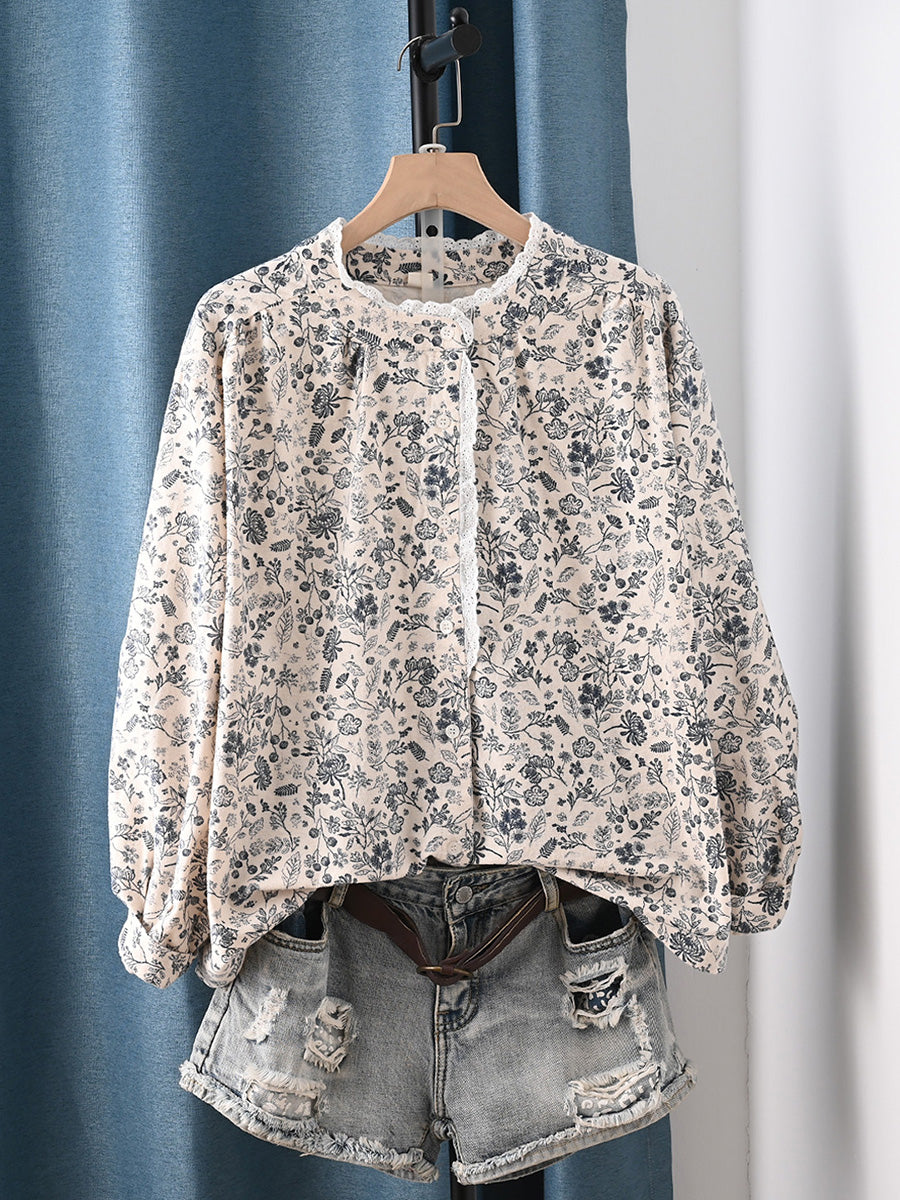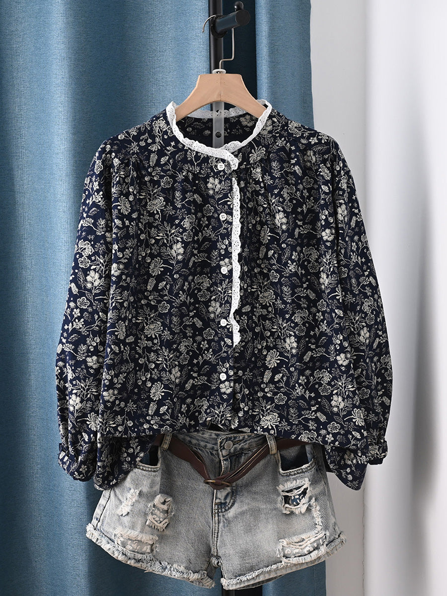 Women Spring Artsy Floral 100%Cotton Stand Collar Shirt