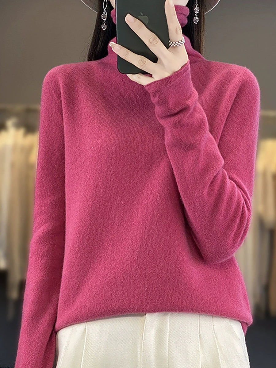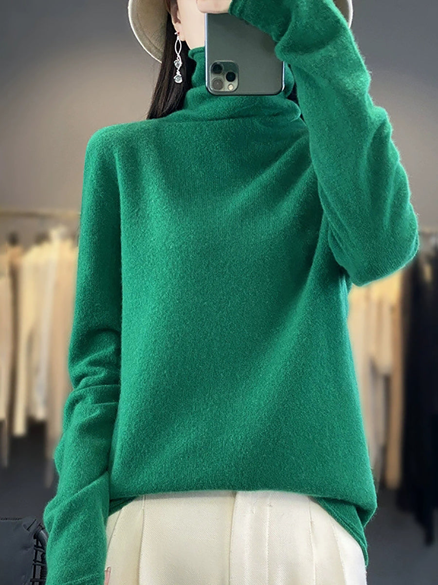 Women Spring Casual Pure Color Turtleneck Wool Sweater