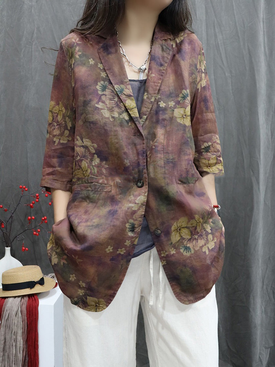 Women Spring Flower 100%Ramie Turn-down Collar Coat