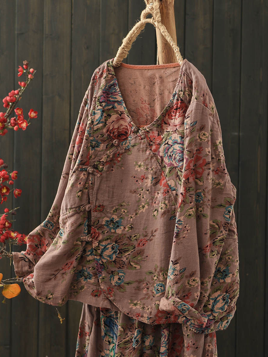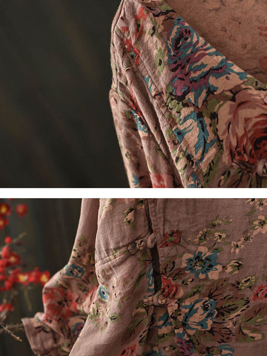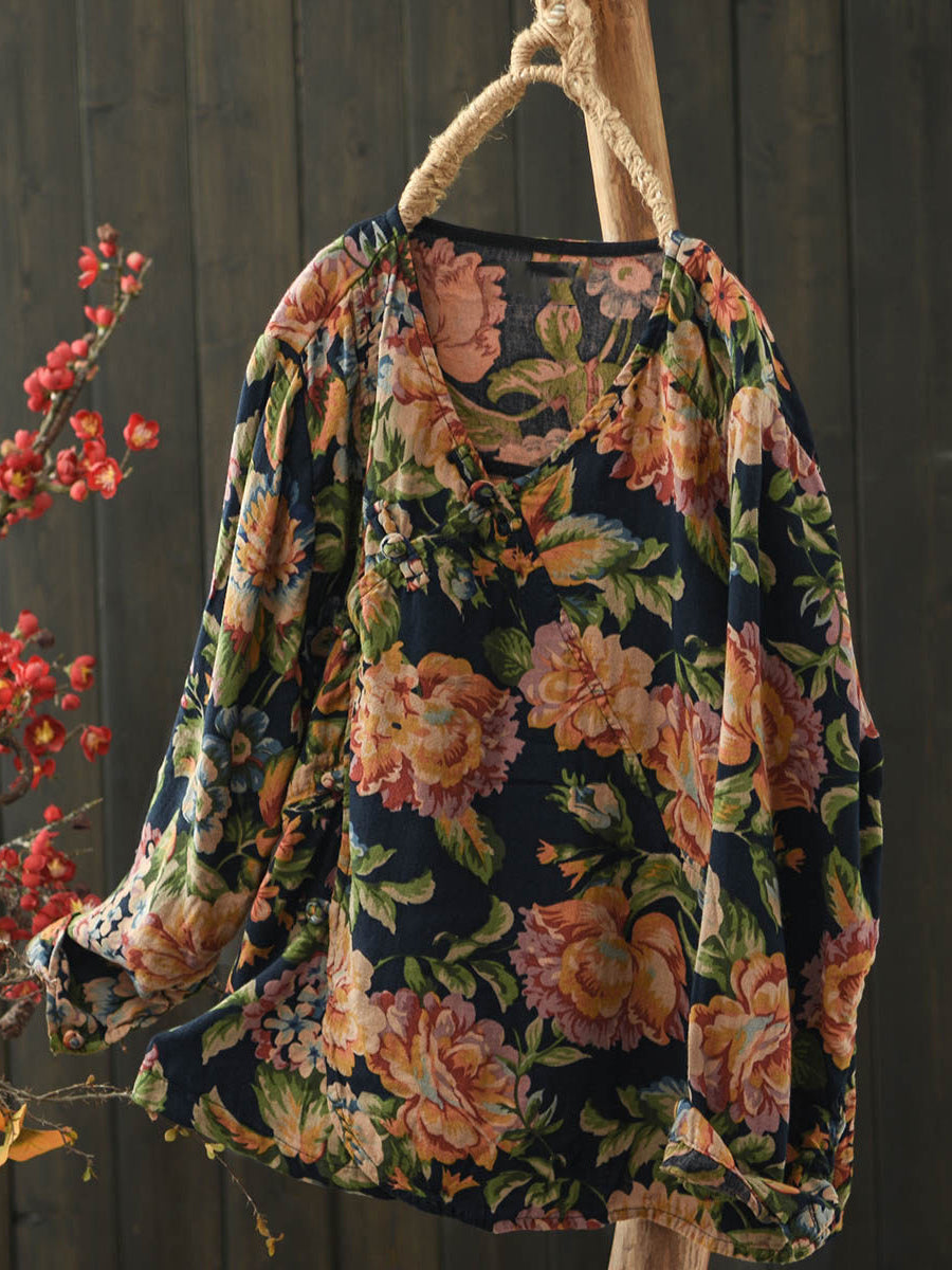 Women Spring Retro Flower V-Neck Cotton Blouse