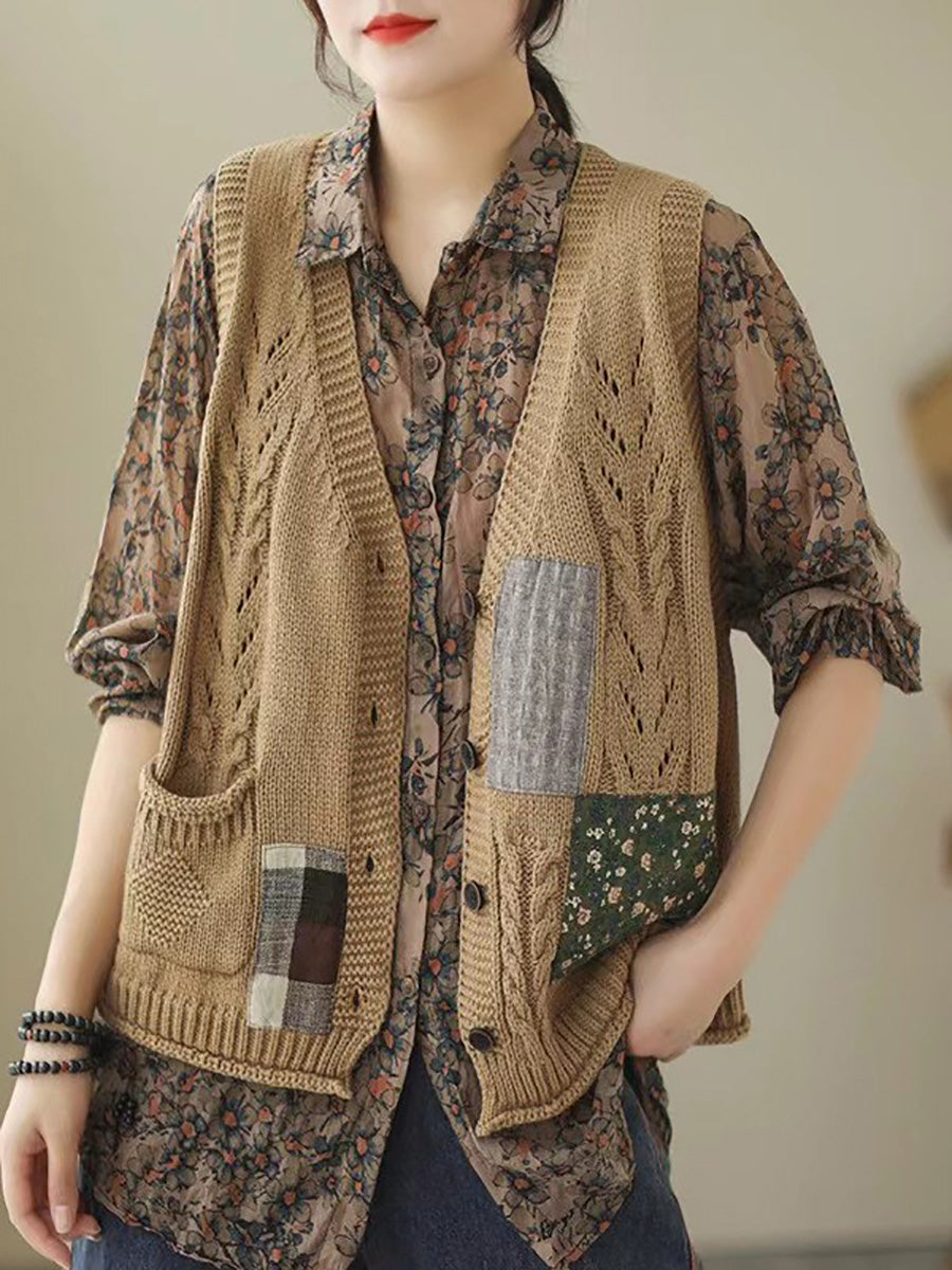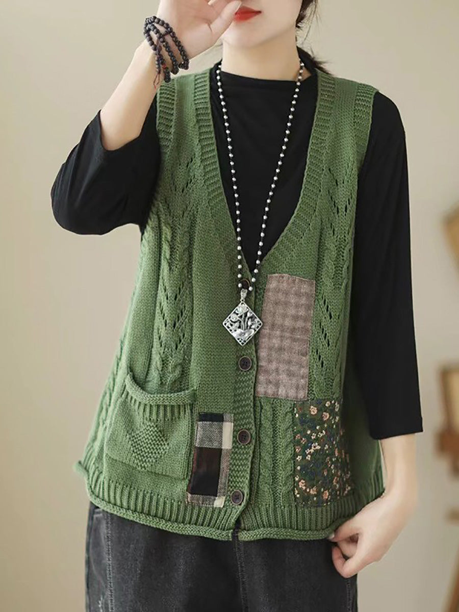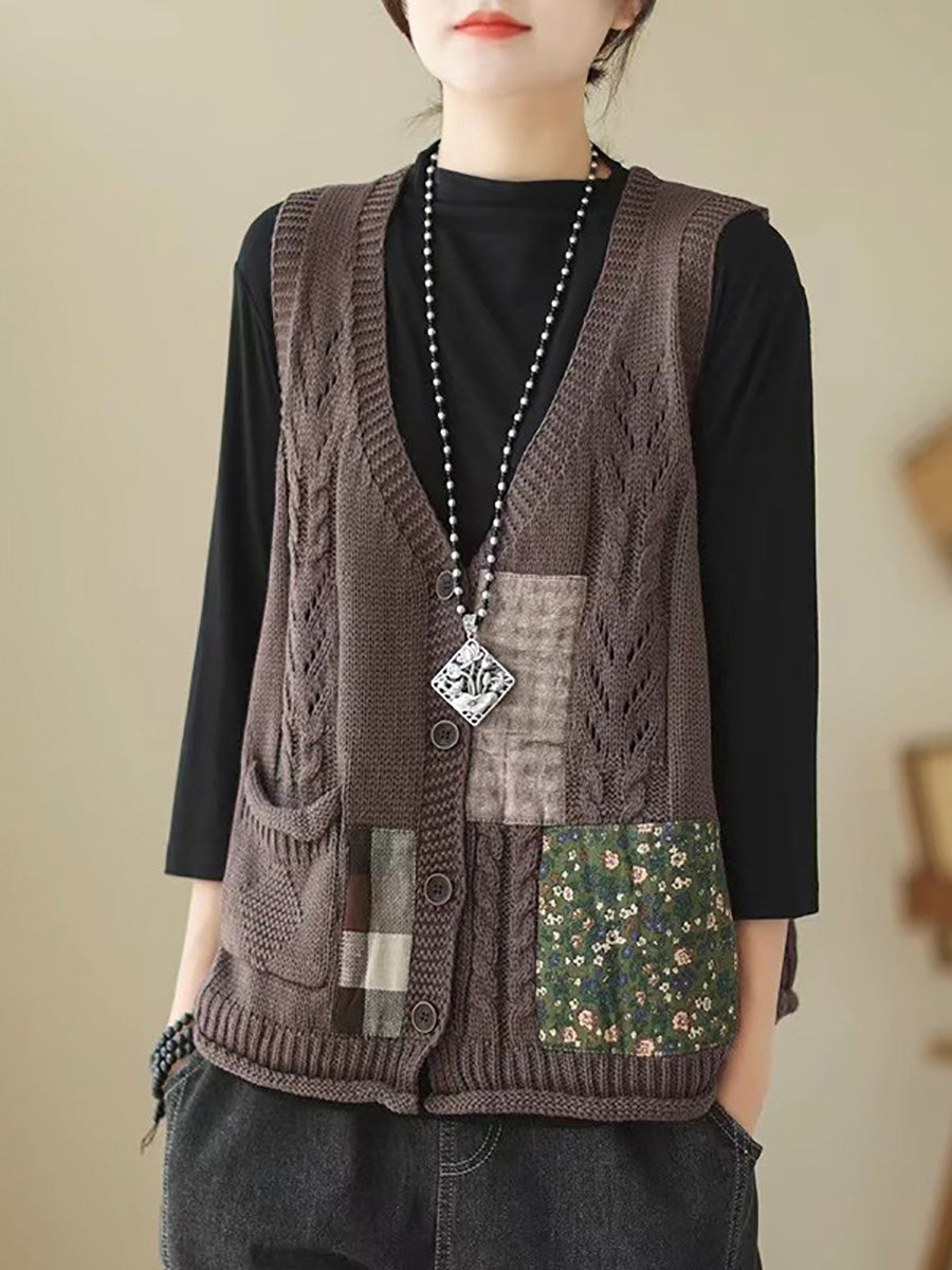 This knitted vest features a patchwork design and a classic V-neck collar, giving it a retro feel. Perfect for the autumn and winter seasons.