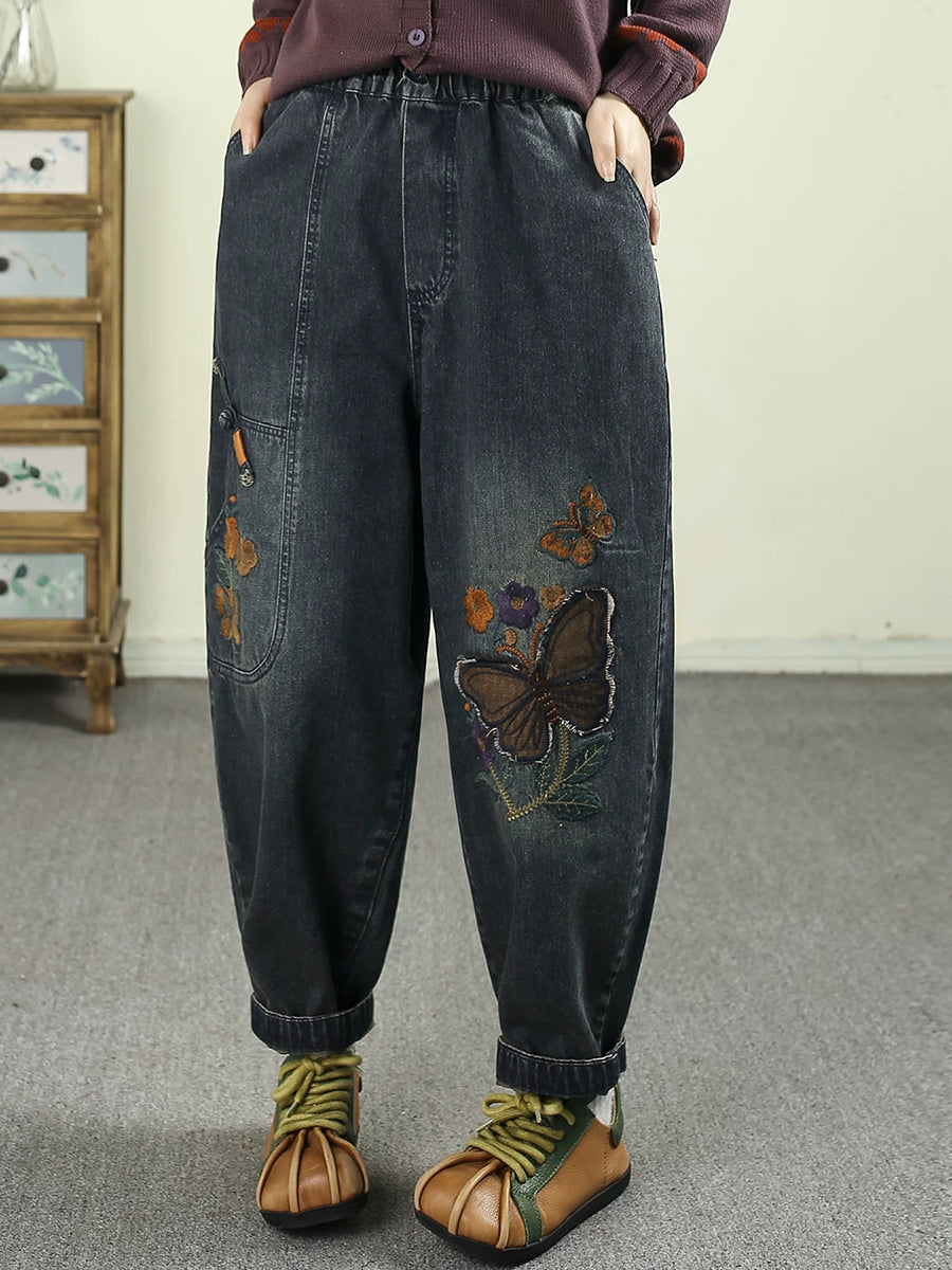Women Spring Vintage Denim Butterfly Patchwork Harem Pants