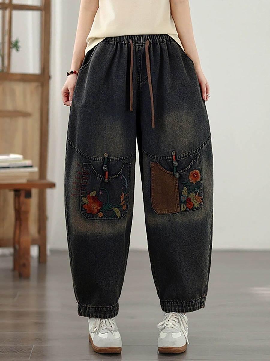 Women Spring Vintage Embroidery Patchwork Denim Harem Pants
