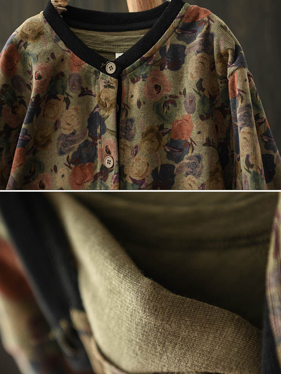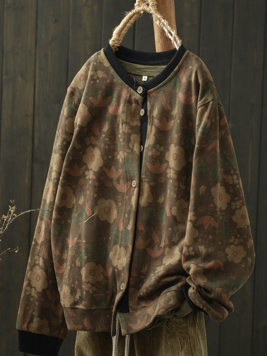 Women Spring Vintage Flower O-Neck Cotton Coat