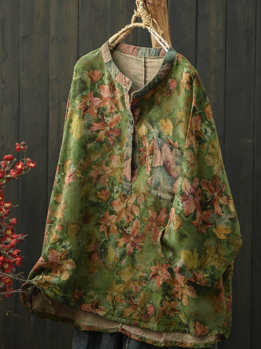 Women Summer Retro Flower Stand Collar Blouse