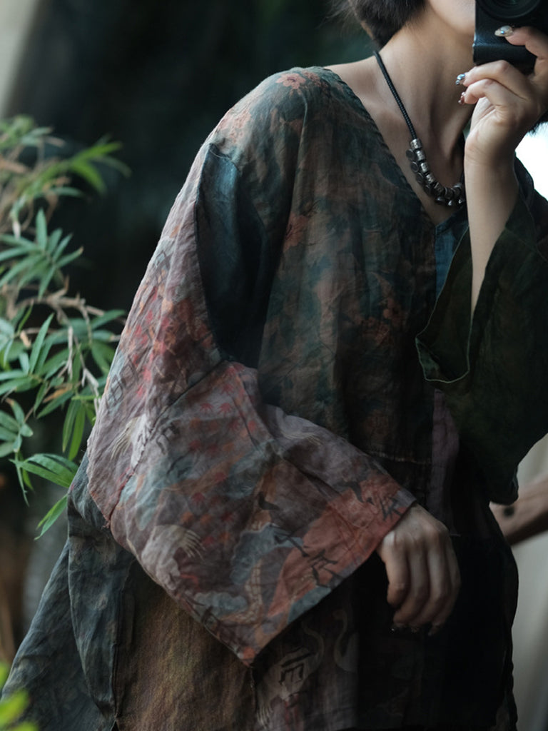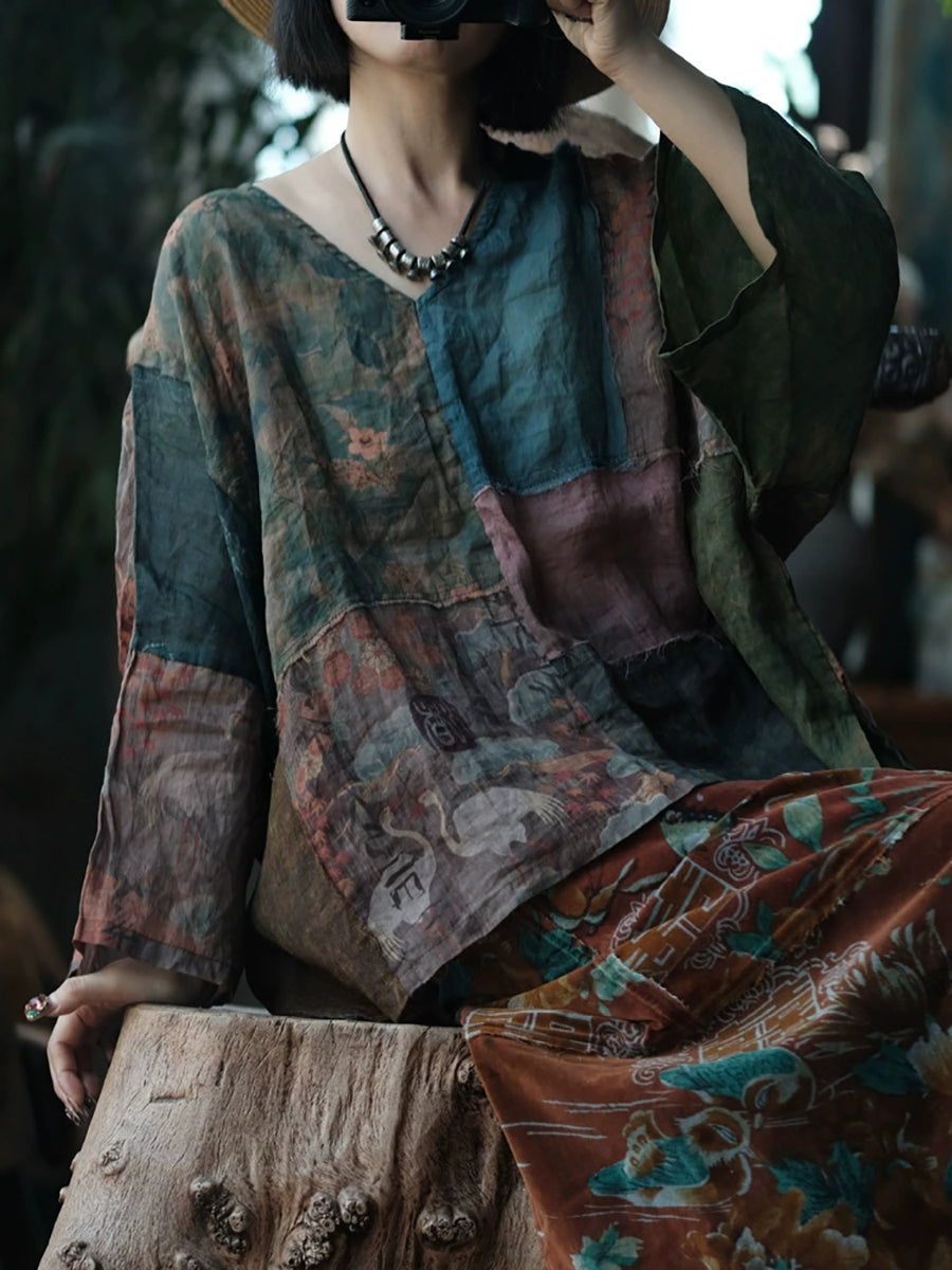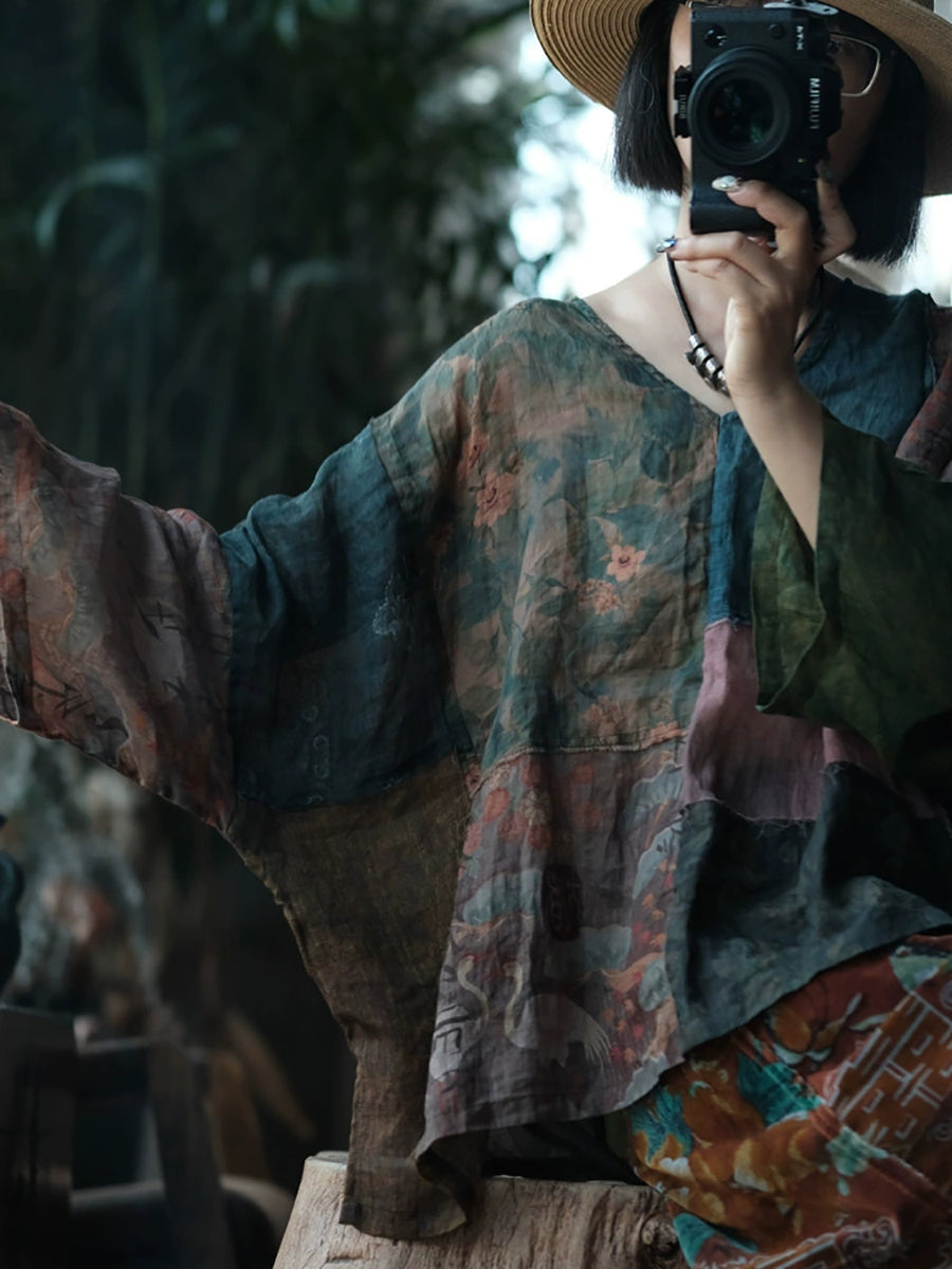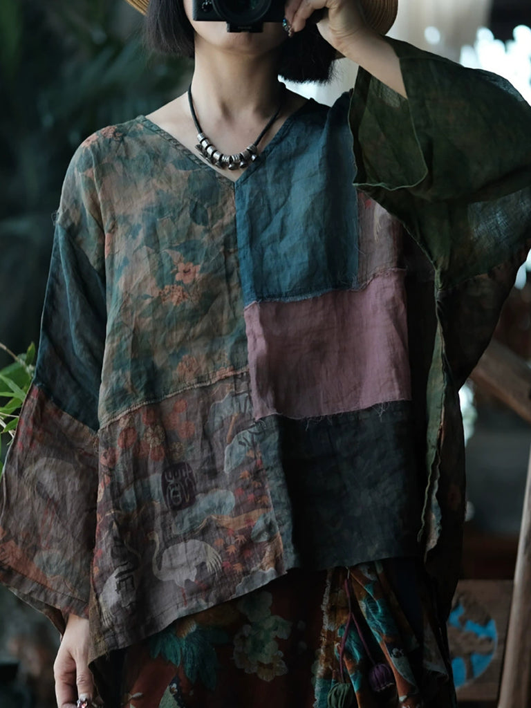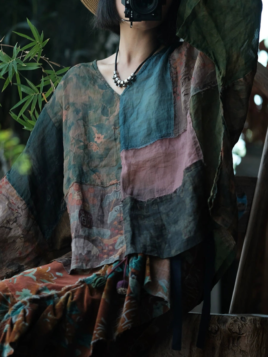 Women Summer Vintage Flower Patchwork Ramie Shirt