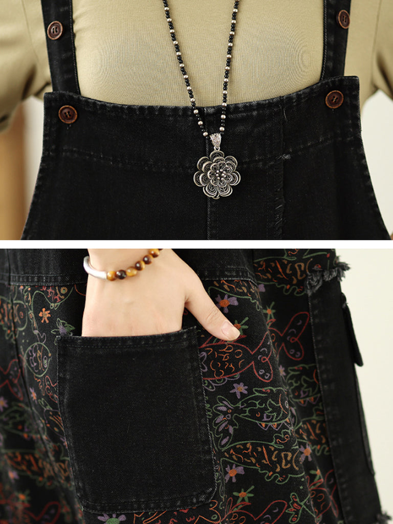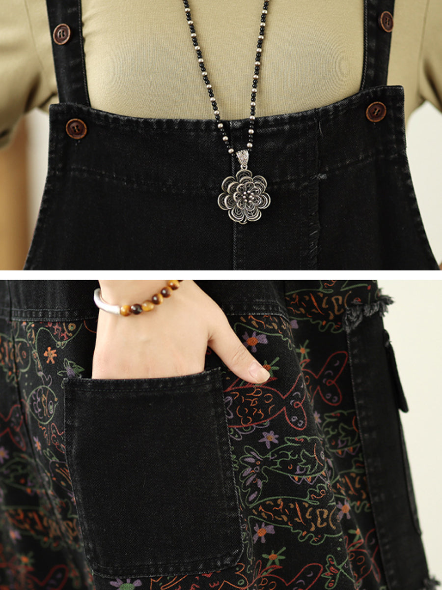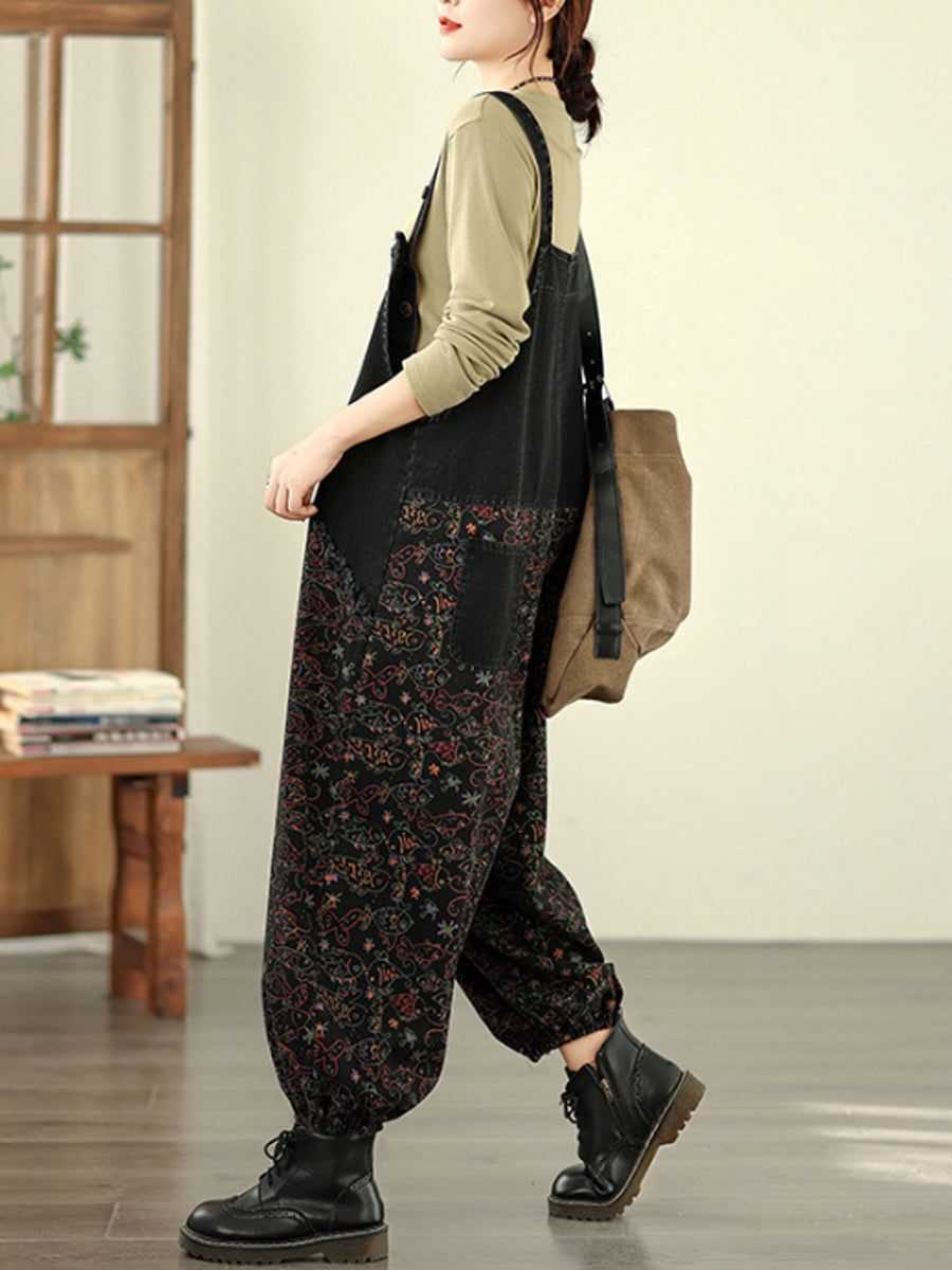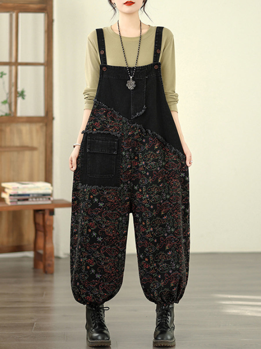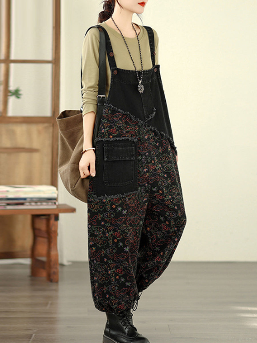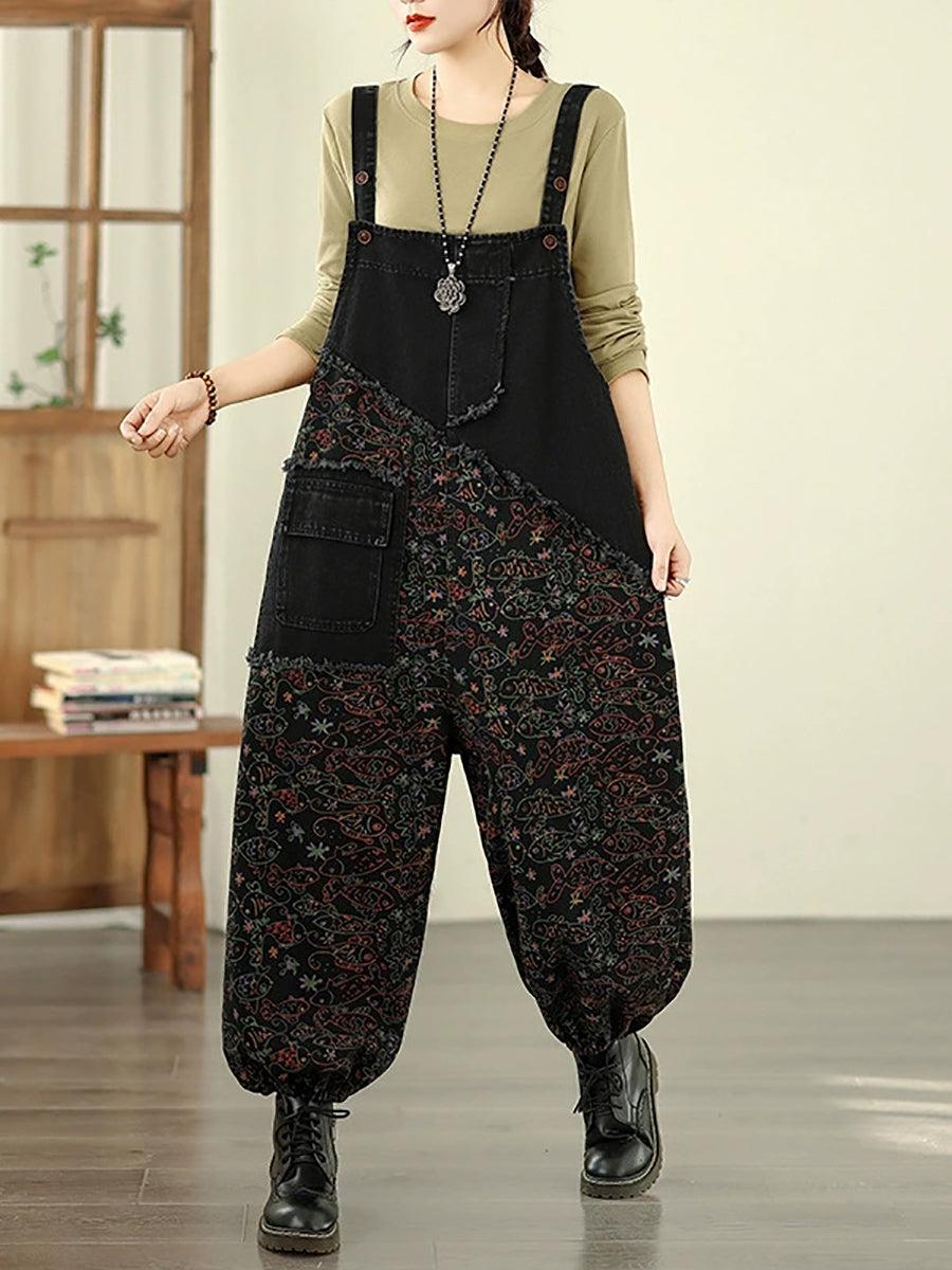 Women Vintage Floral Spliced Cotton Loose Denim Jumpsuits