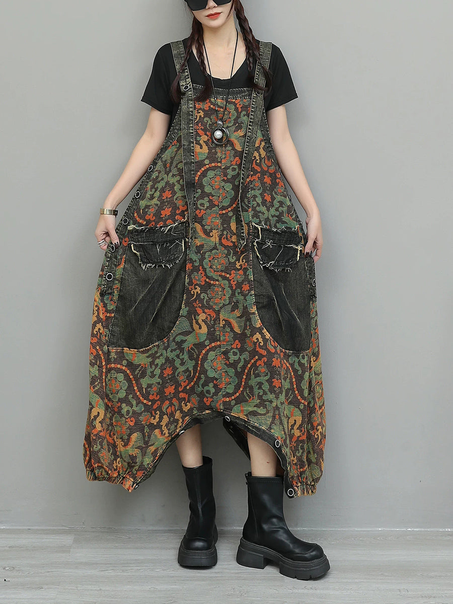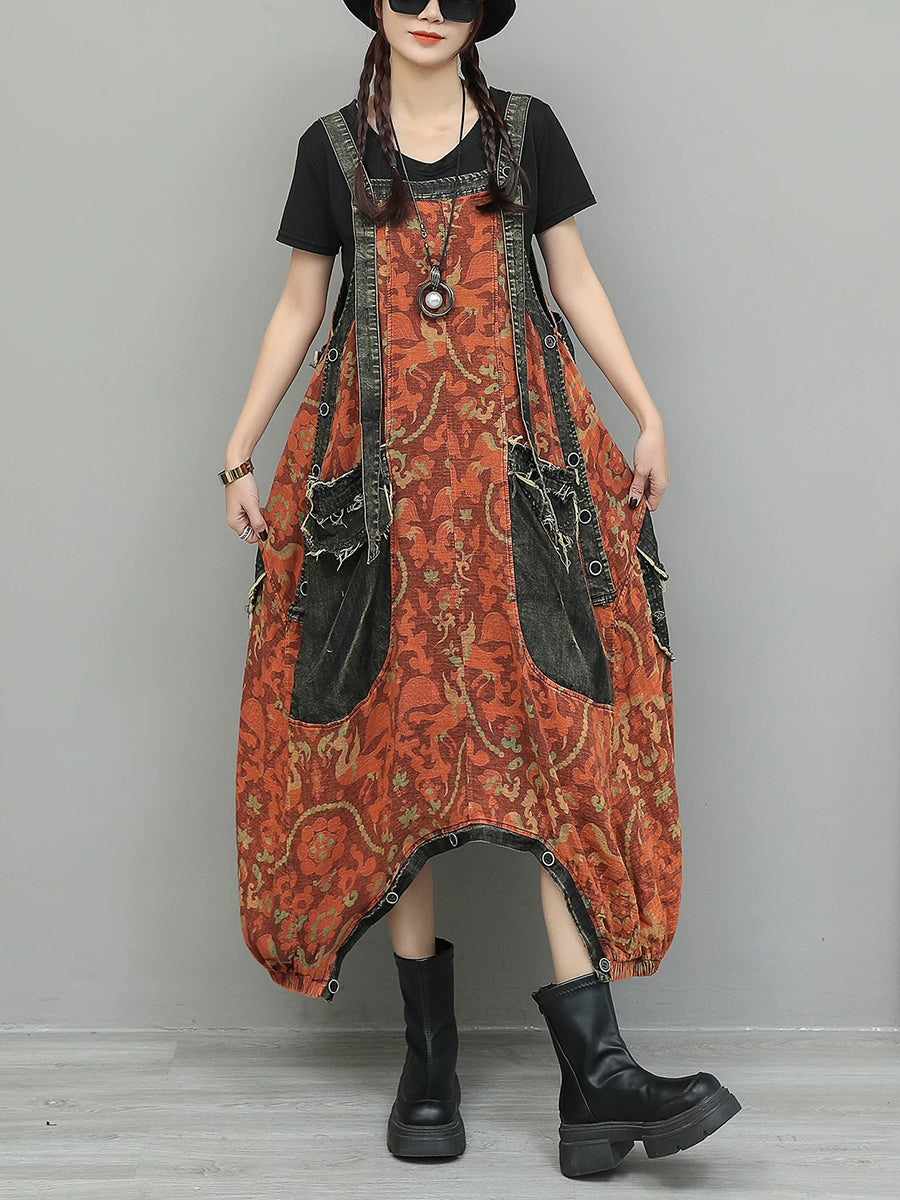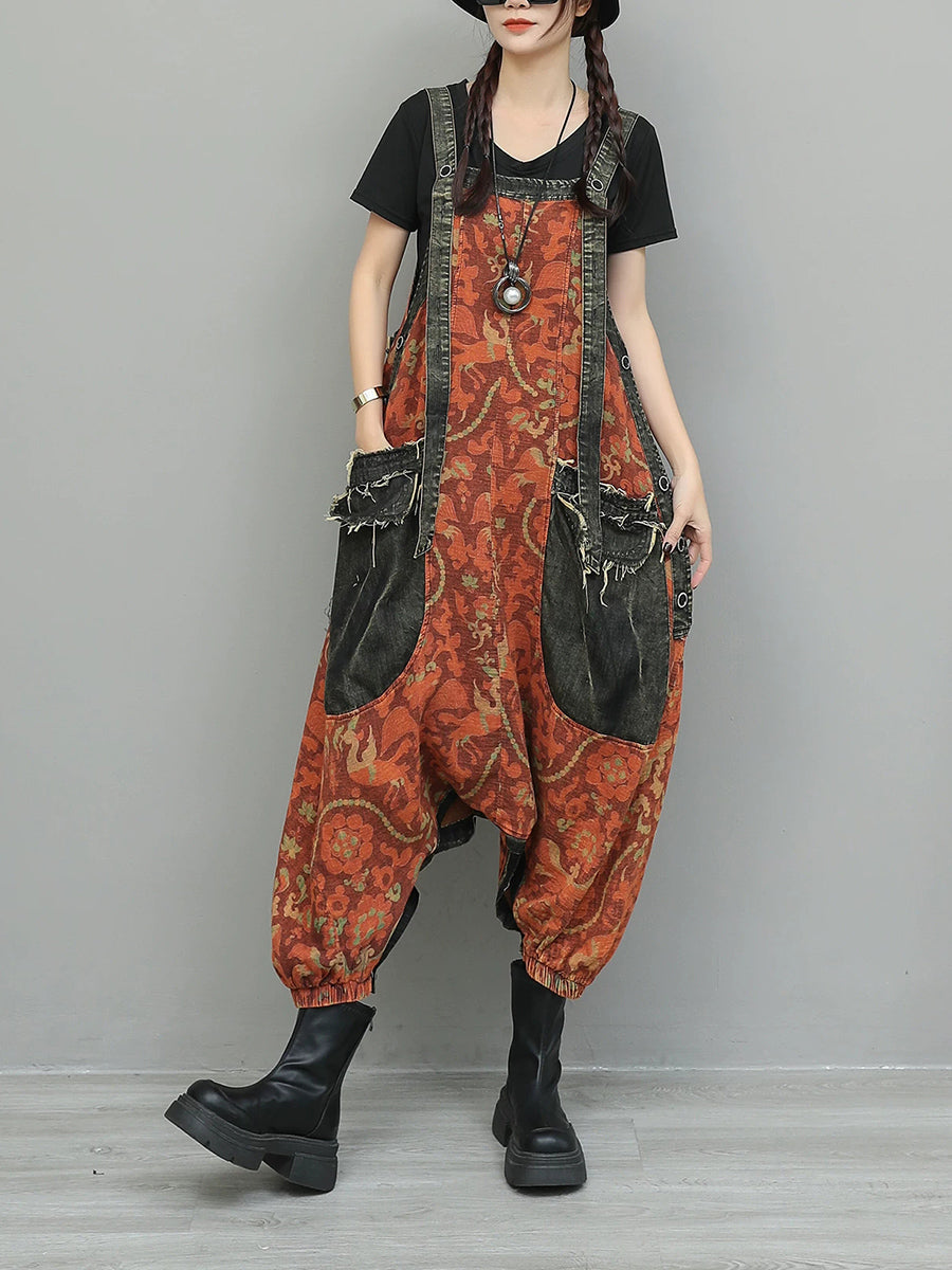 Women Vintage Flower Spliced Denim Jumpsuits