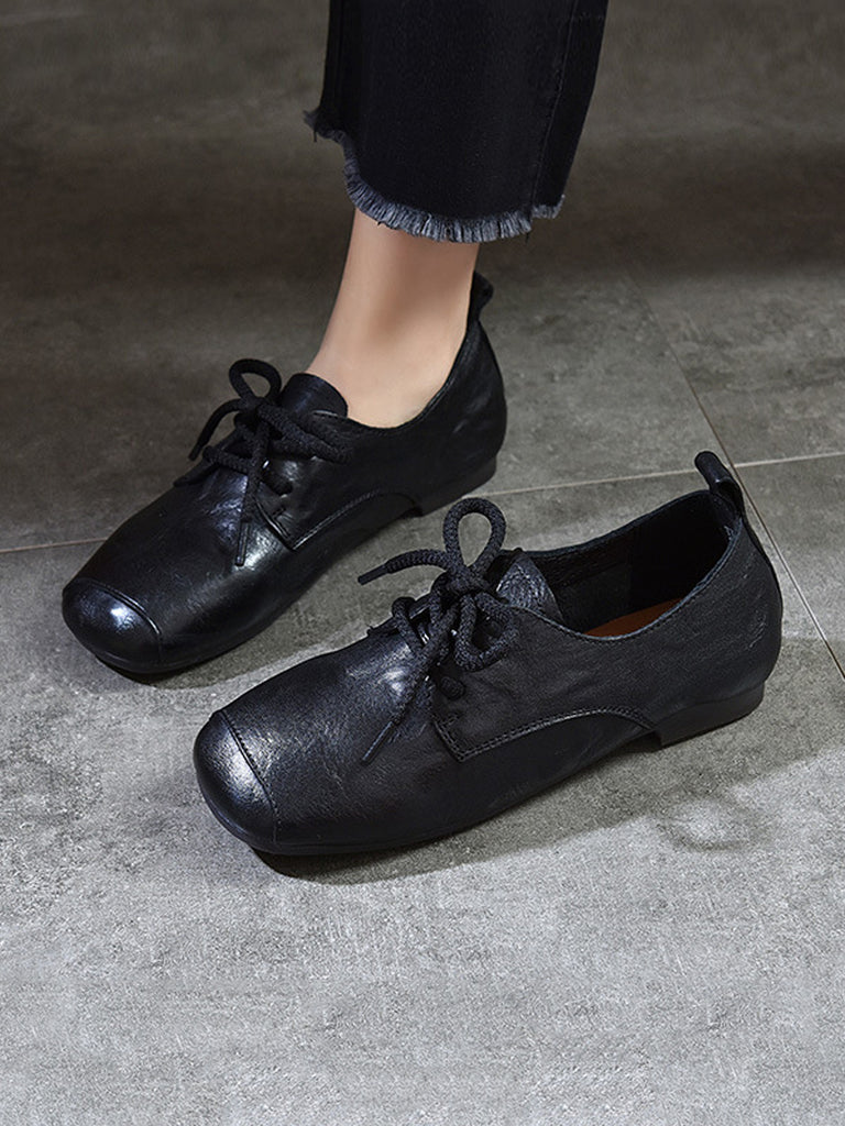 Women Vintage Genuine Leather Square-toe Low Heel Shoes