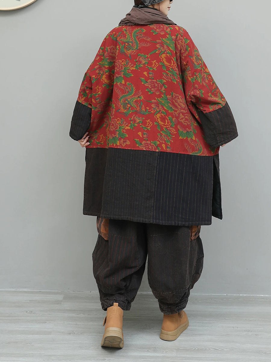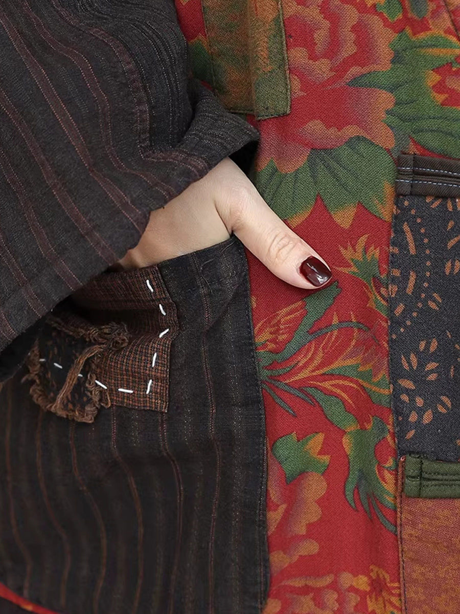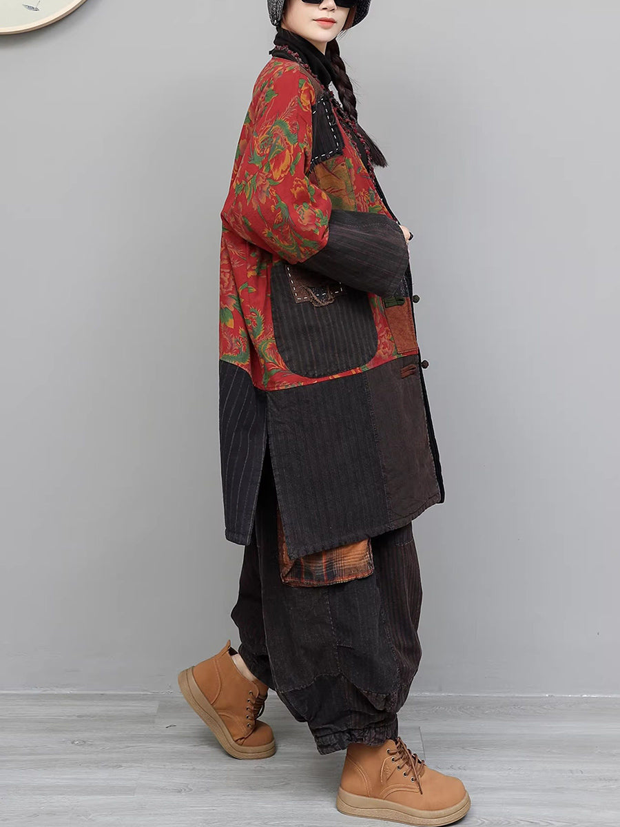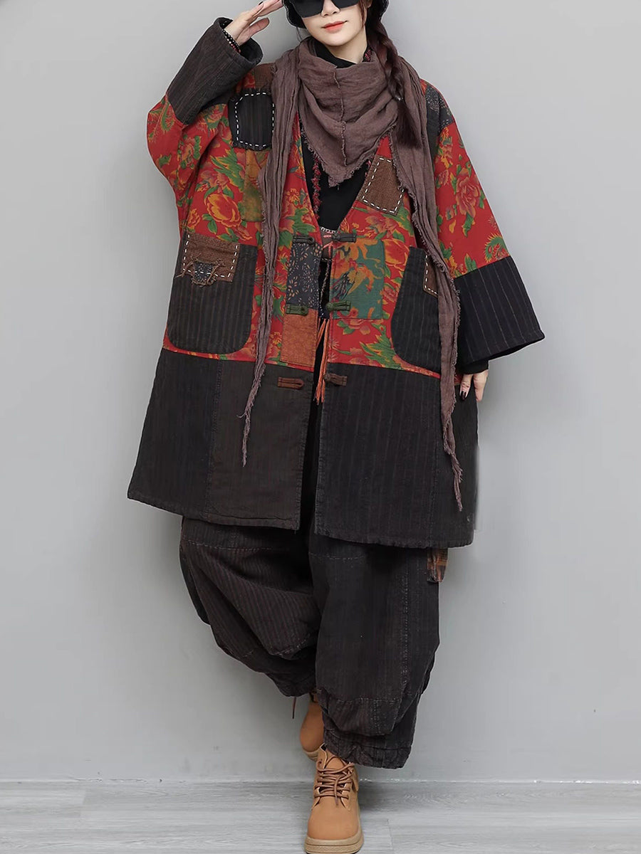 Women Winter Ethnic Patch Spliced V-Neck Padded Suits