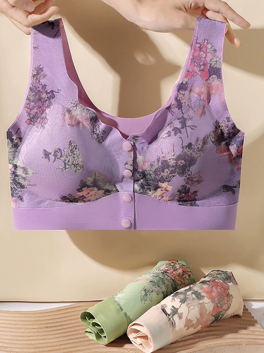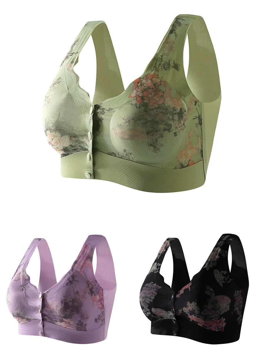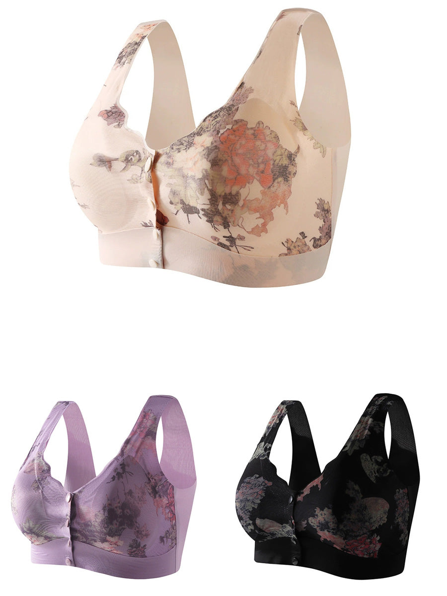 طقم حمالة صدر نسائية مكون من 3 قطع بتصميم زهور فنية، مزودة بإبزيم أمامي وبدون أسلاك.