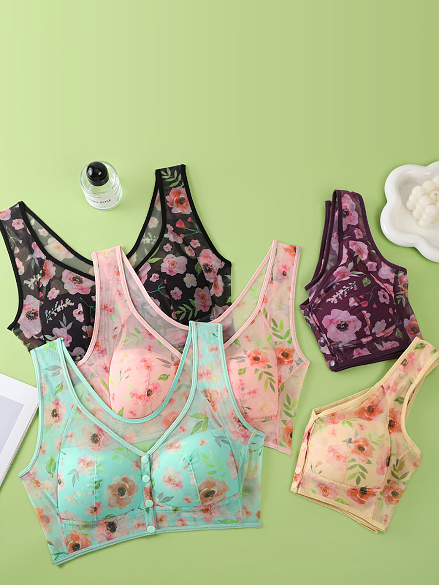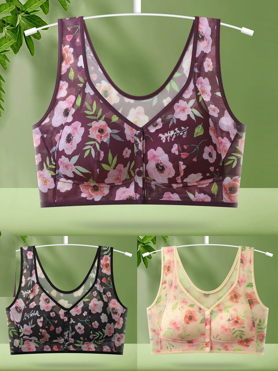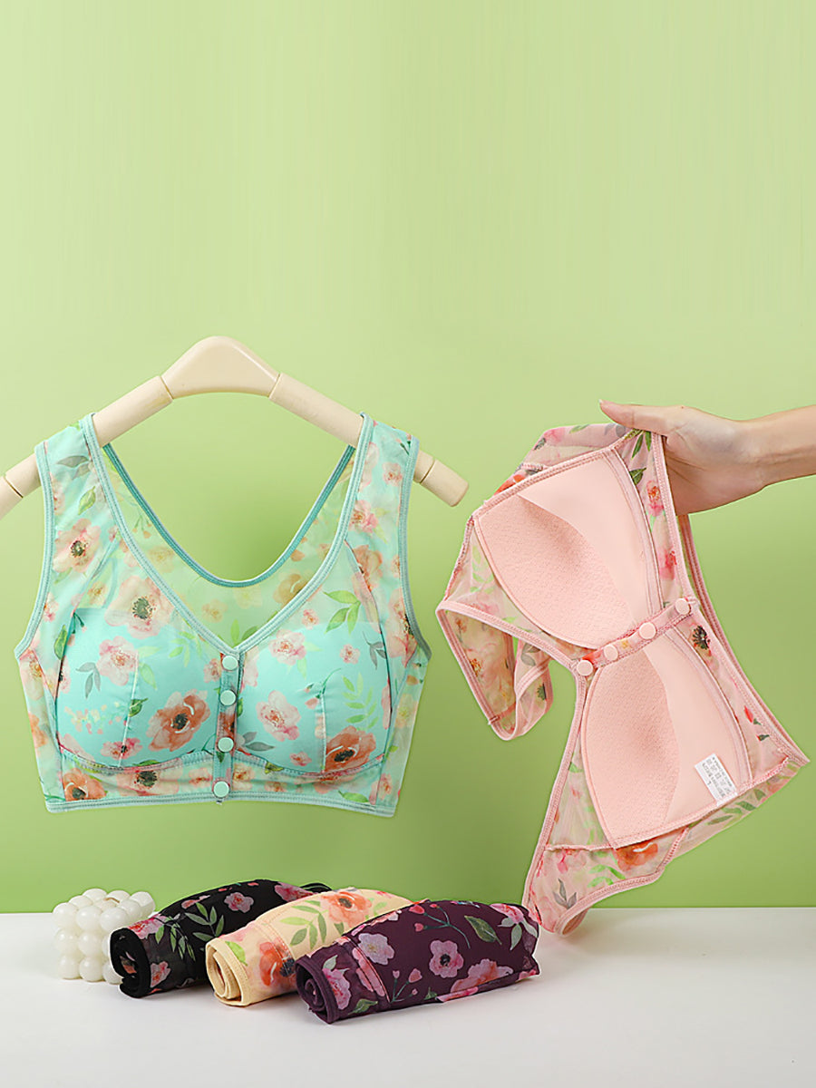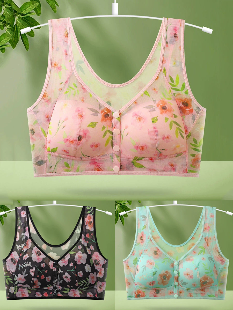 طقم حمالة صدر نسائية مكون من 3 قطع، بتصميم زهور فنية، مزودة بإبزيم أمامي، بدون أسلاك.