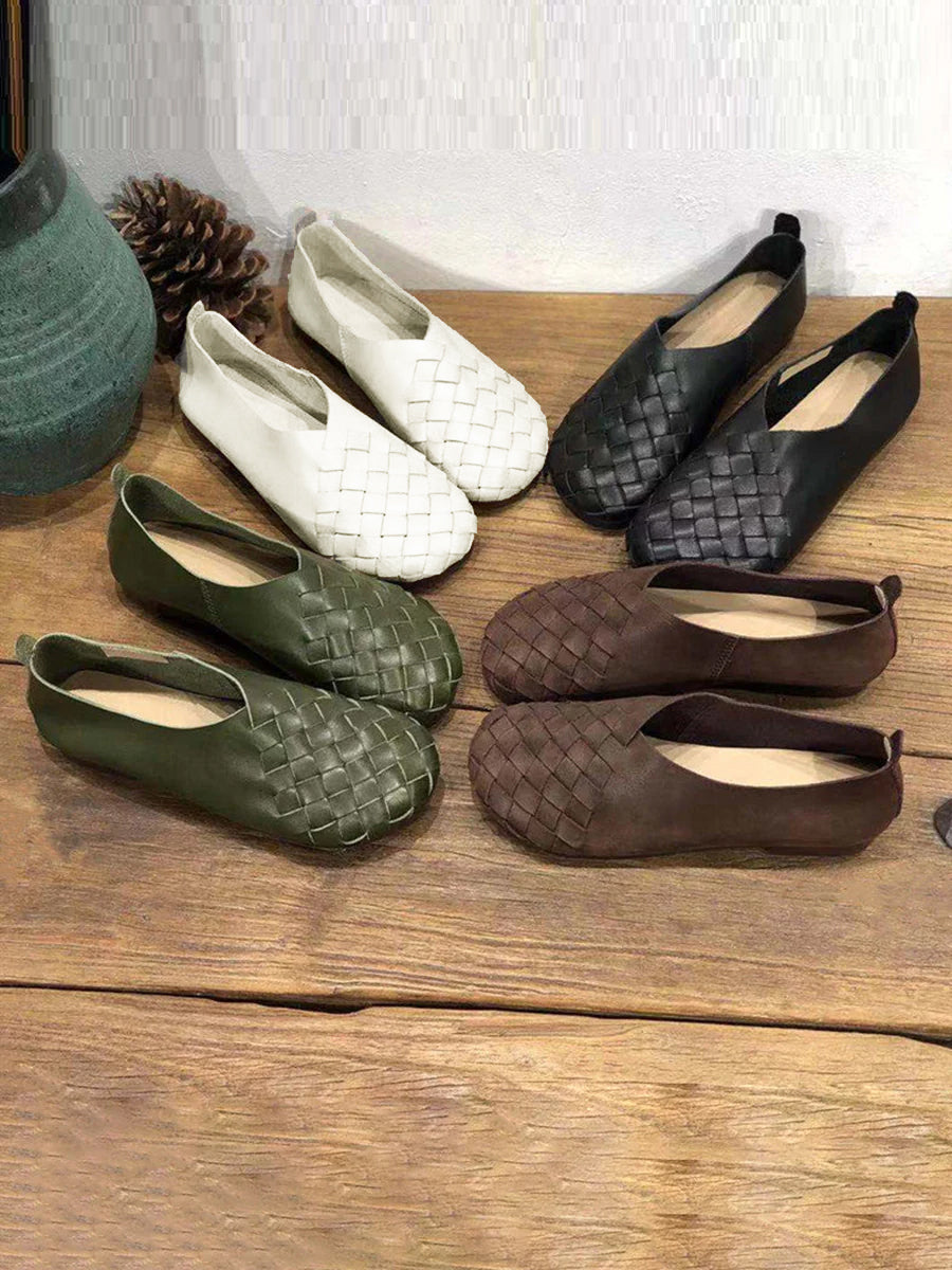 حذاء مسطح نسائي من الجلد بلون سادة بأصابع مستديرة