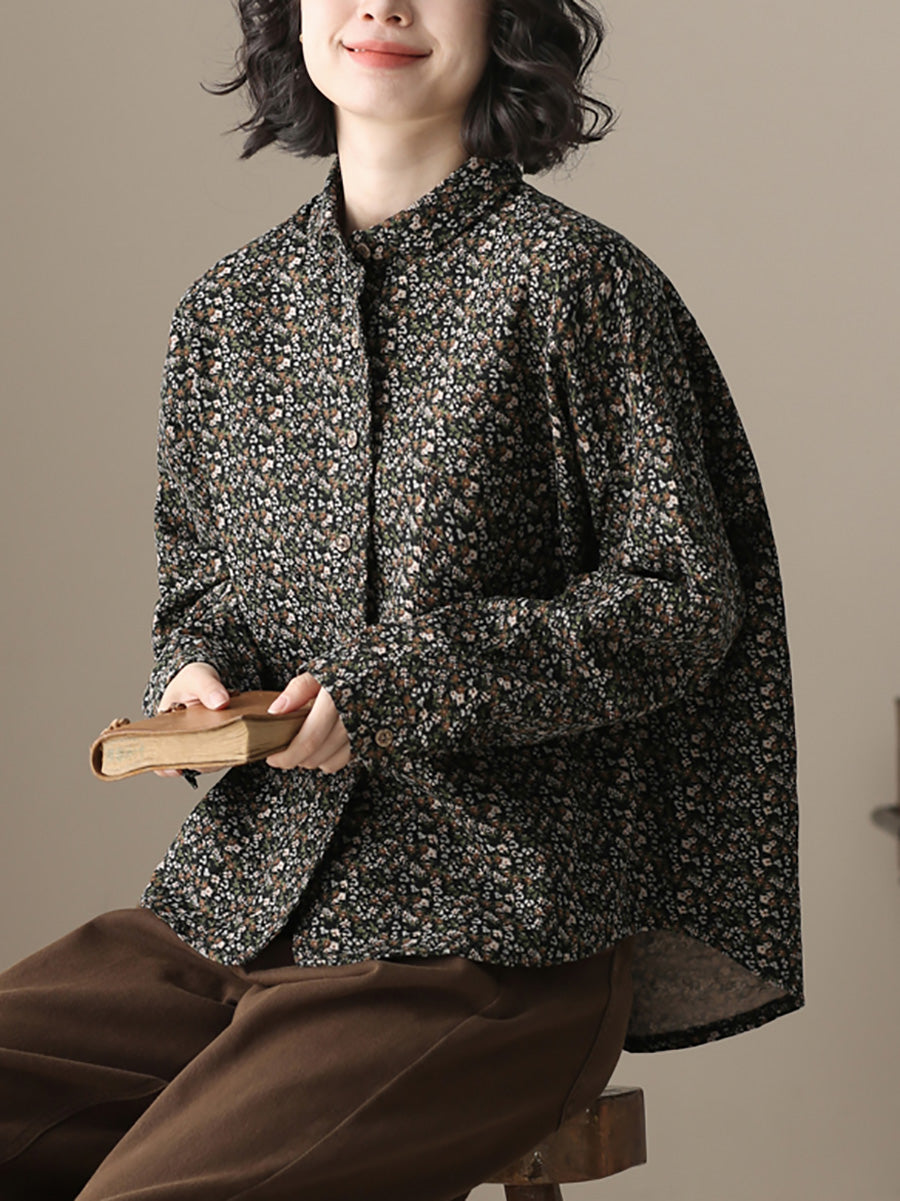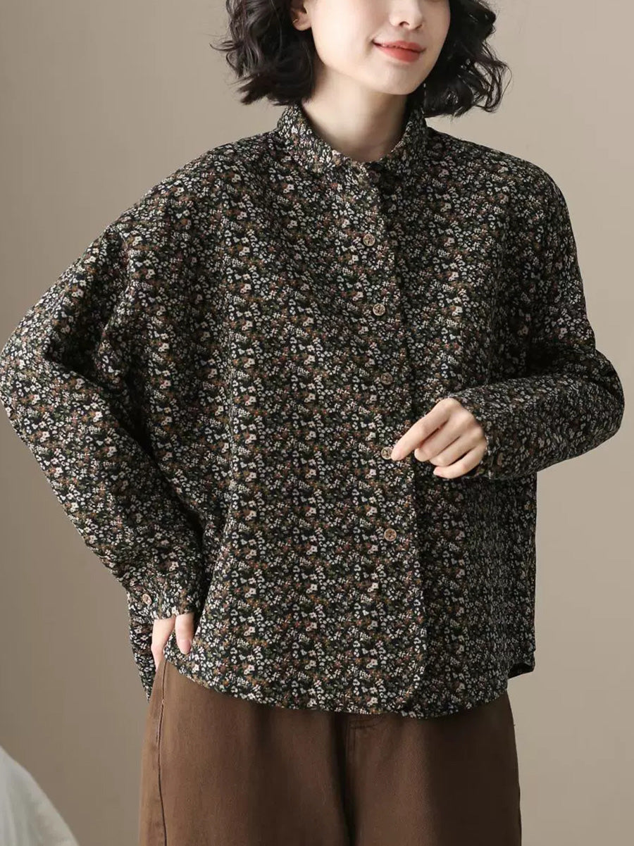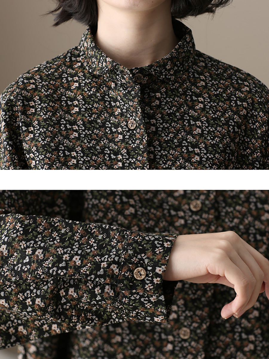 قميص نسائي أنيق بنقشة زهور خريفية من القطن بياقة مطوية