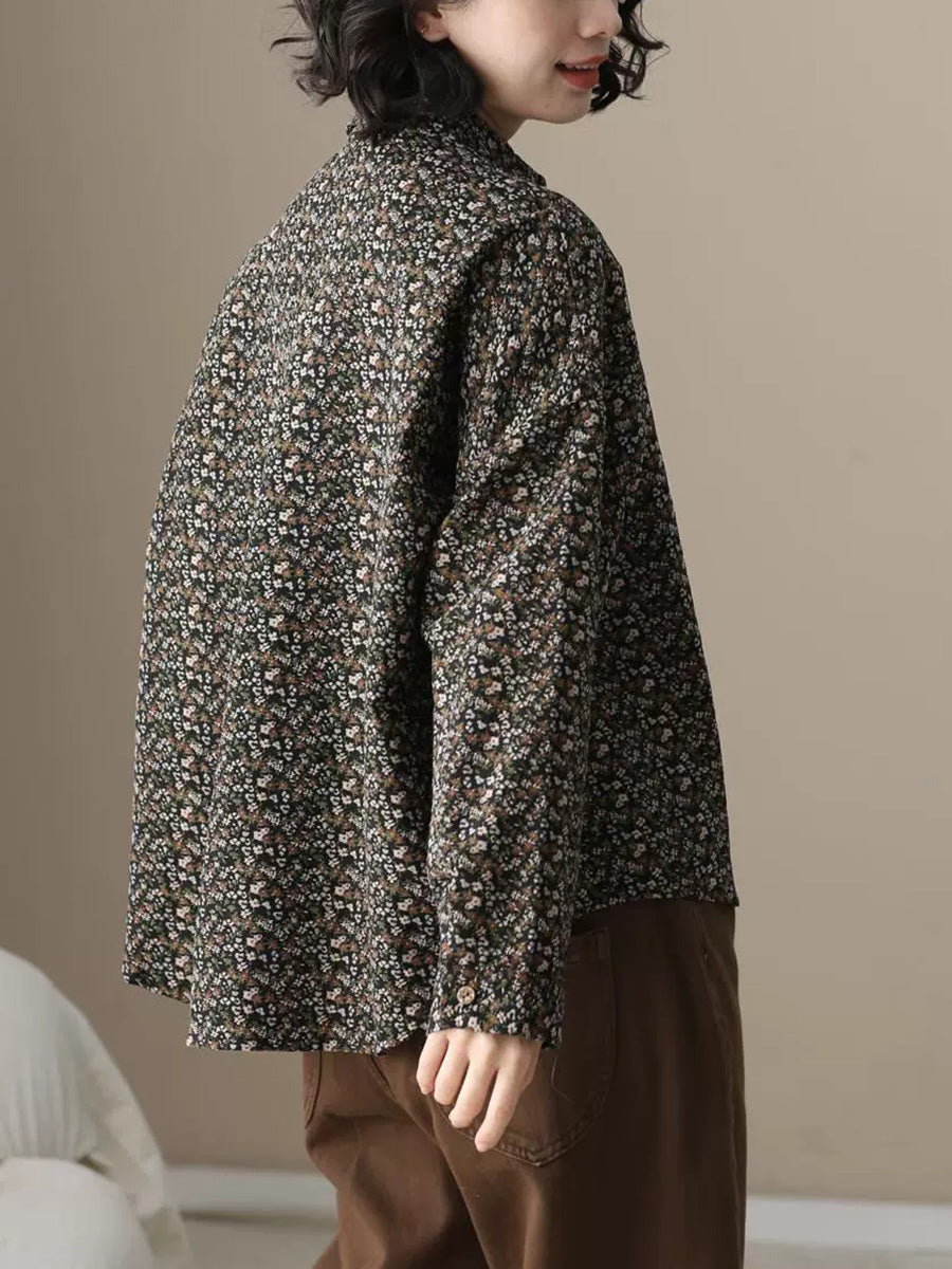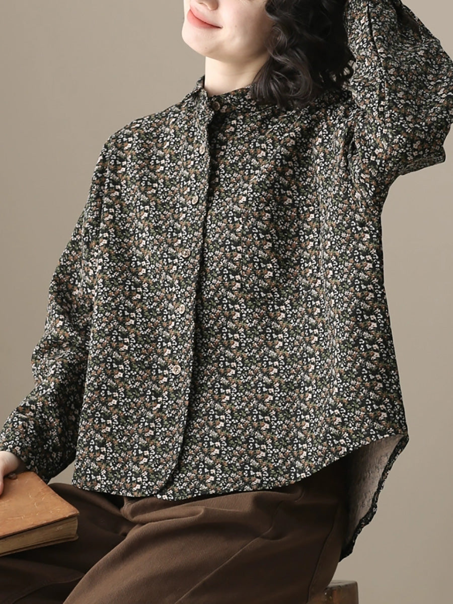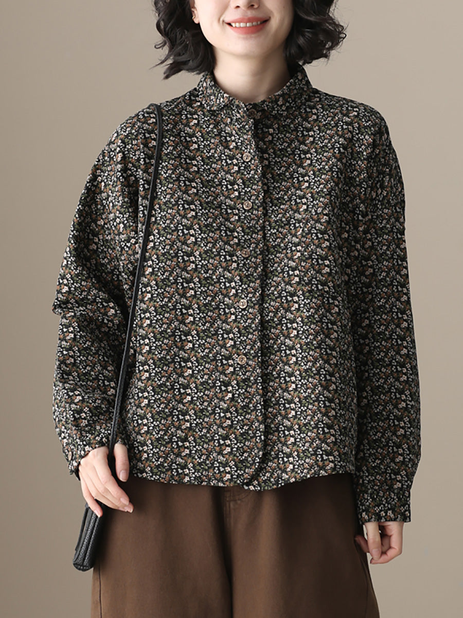 قميص نسائي أنيق بنقشة زهور خريفية من القطن بياقة مطوية