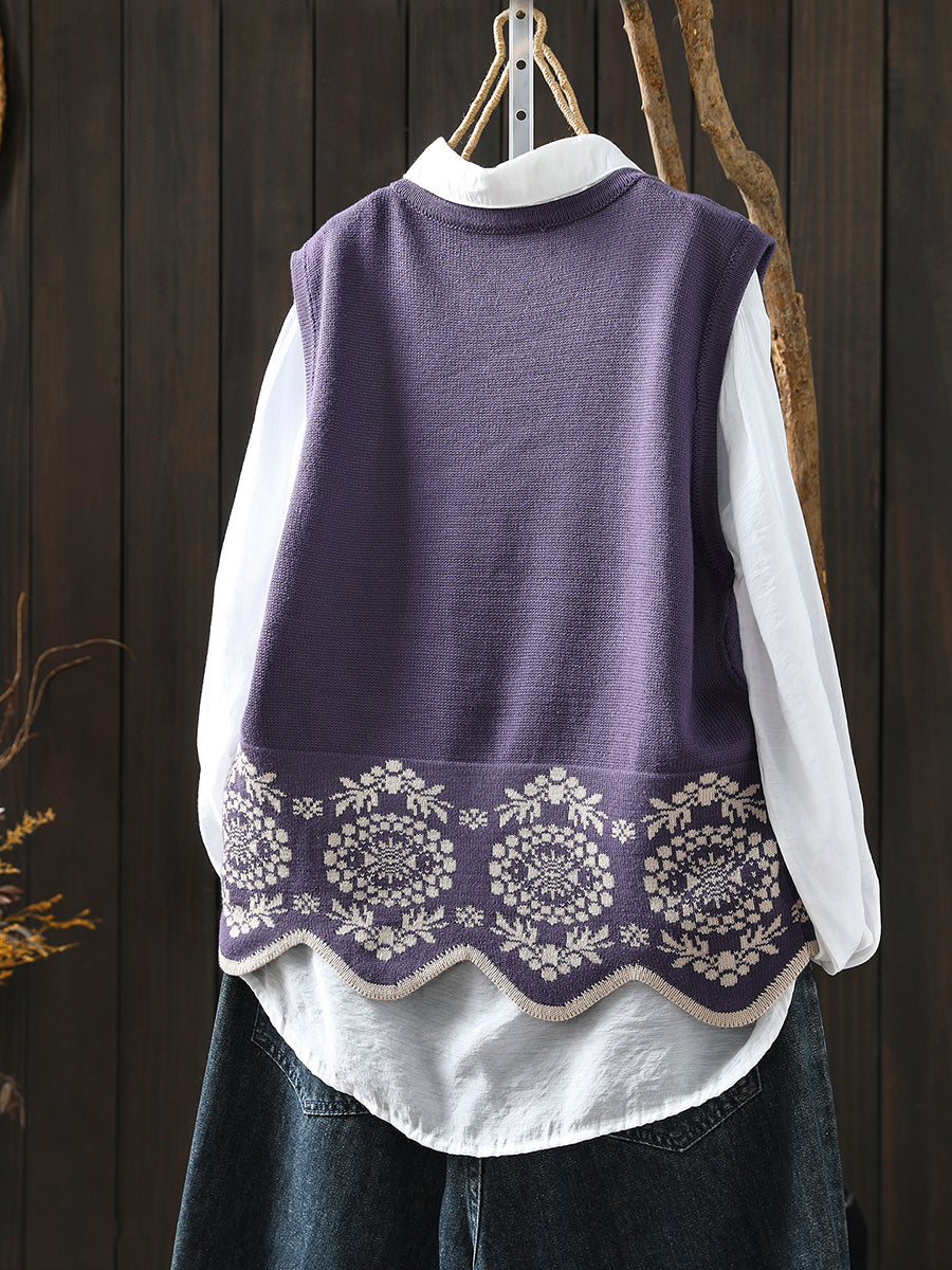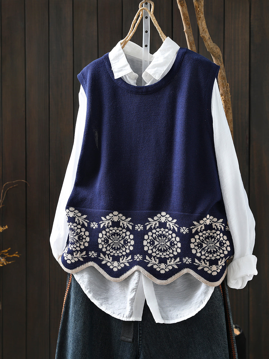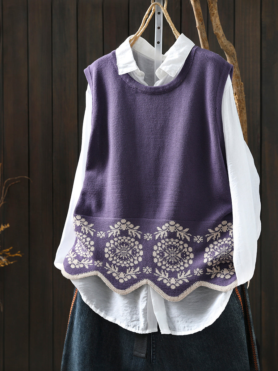 صدرية نسائية محبوكة بياقة دائرية وحافة مموجة مزينة بالزهور