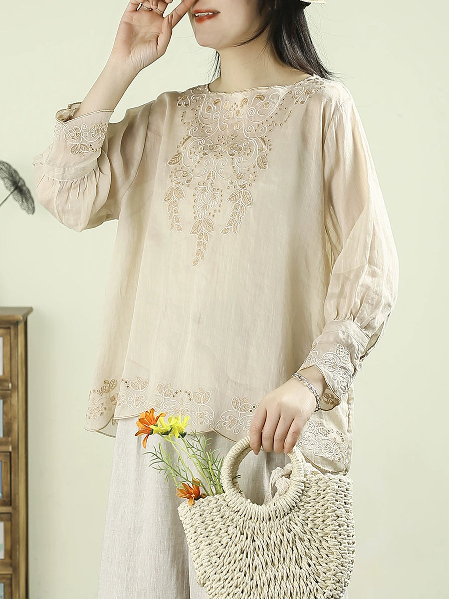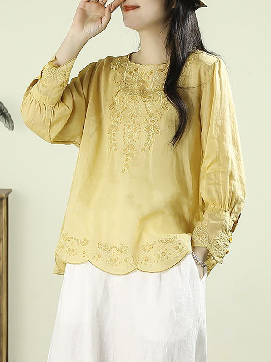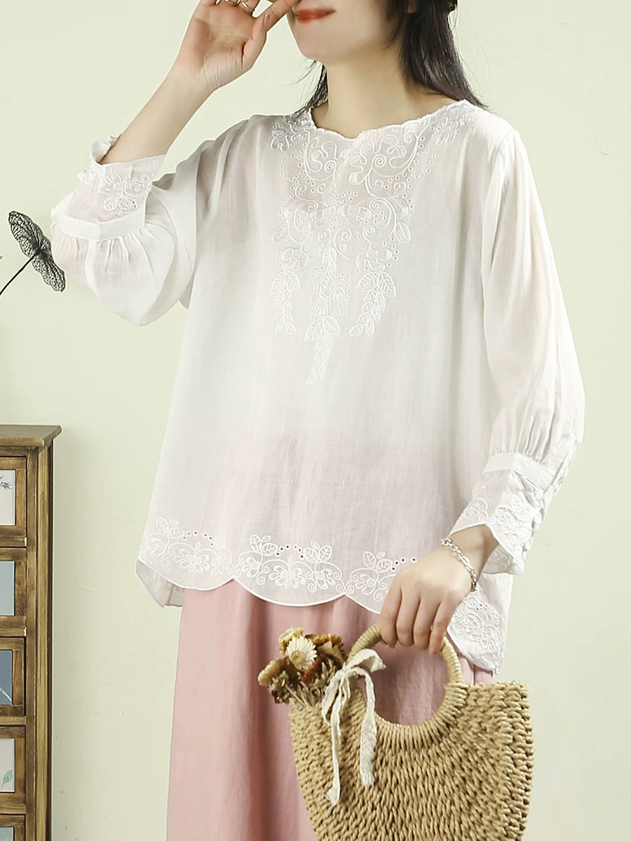 بلوزة نسائية ربيعية مطرزة برقبة دائرية مصنوعة من قماش الرامي بنسبة 100%