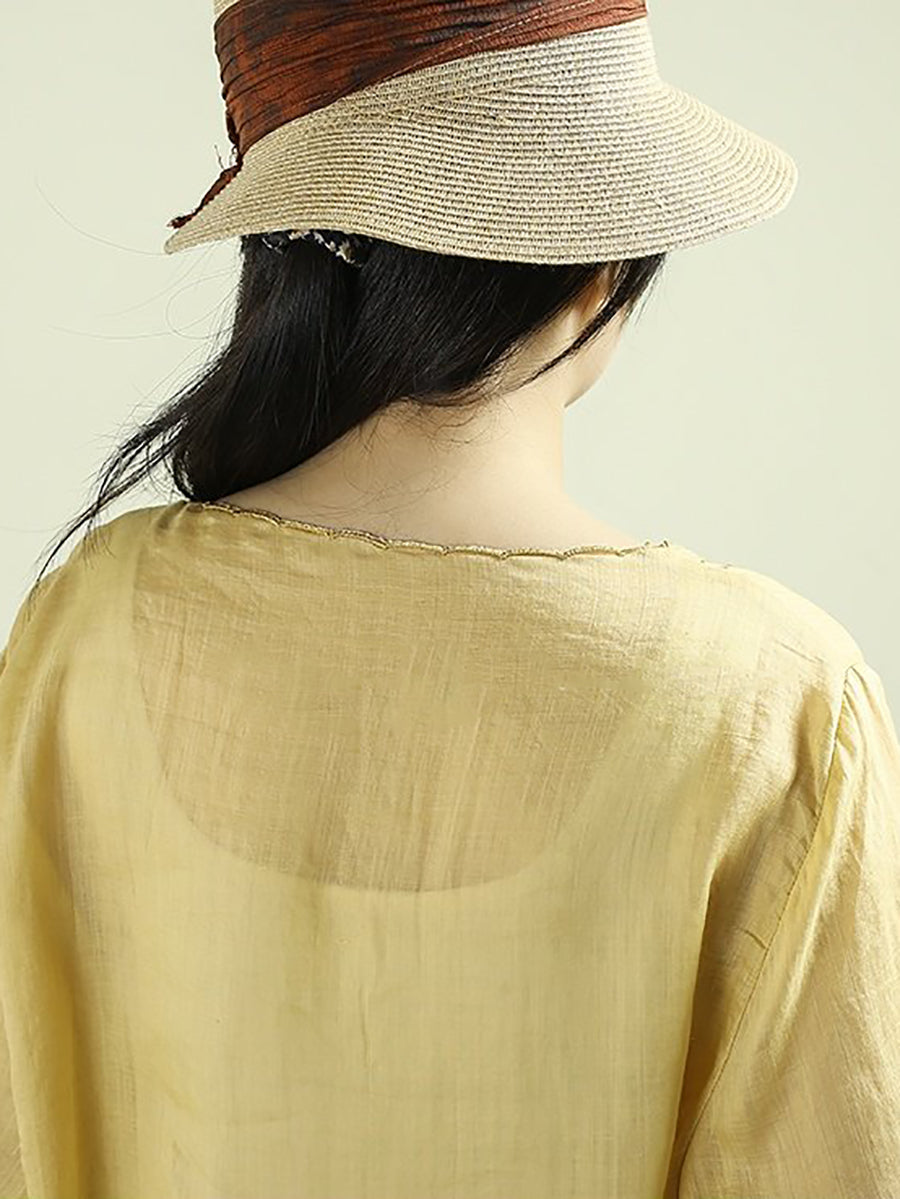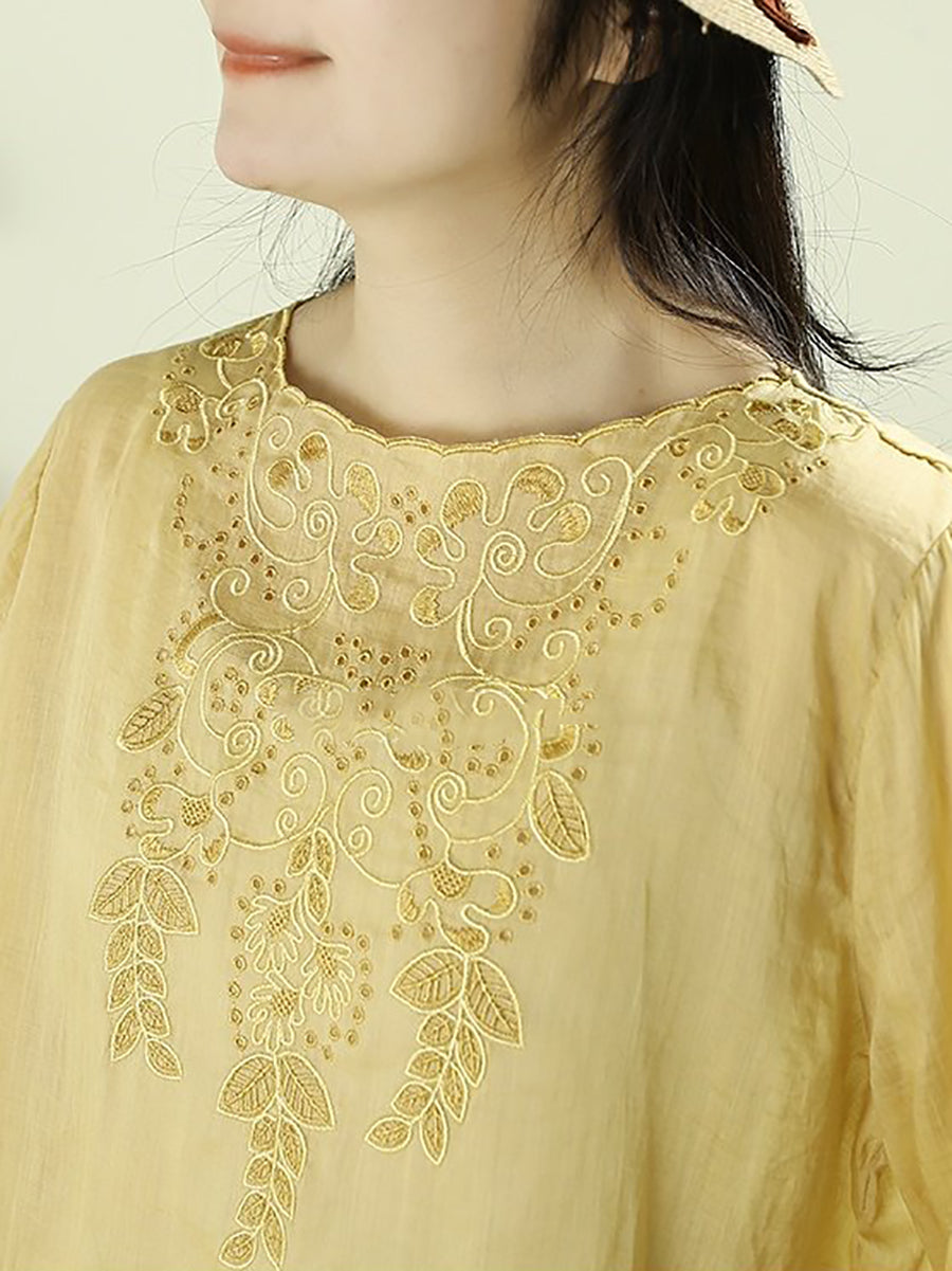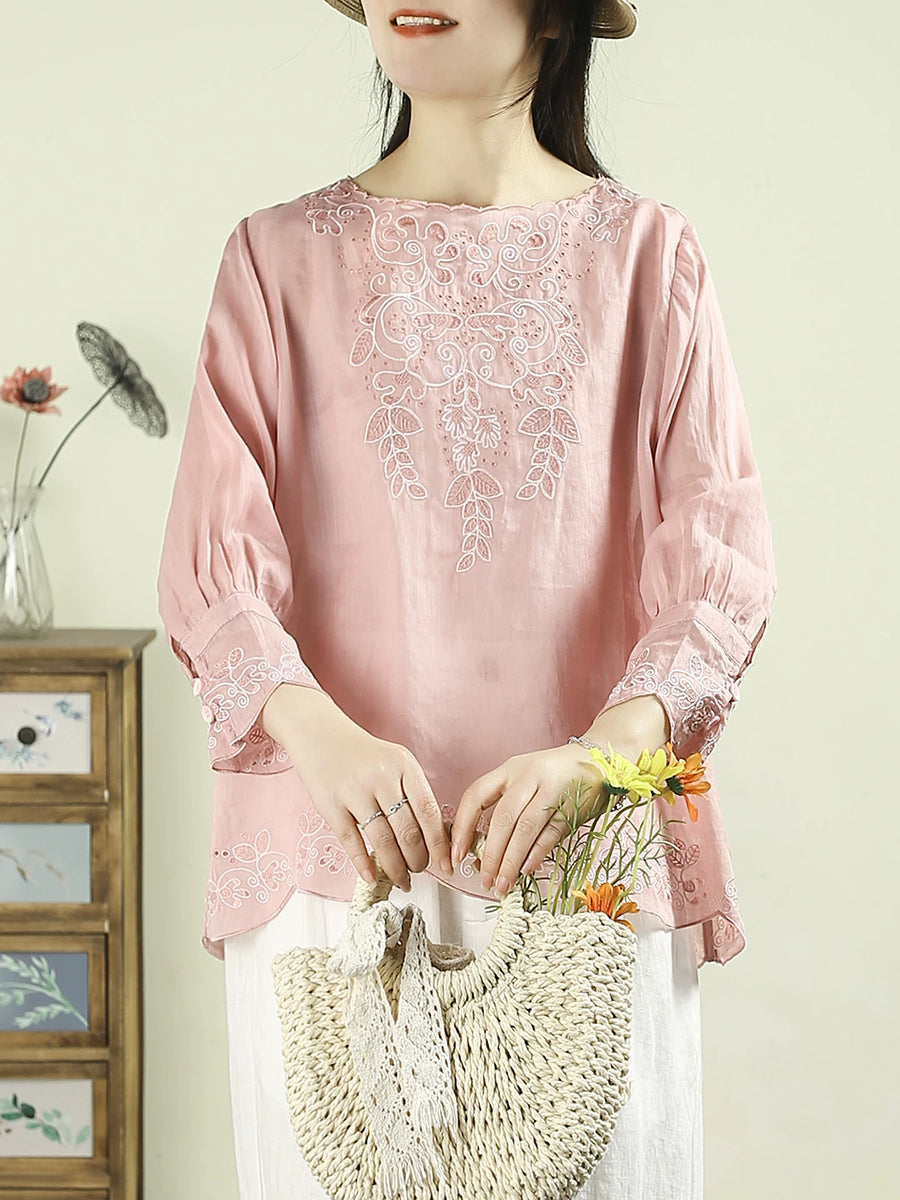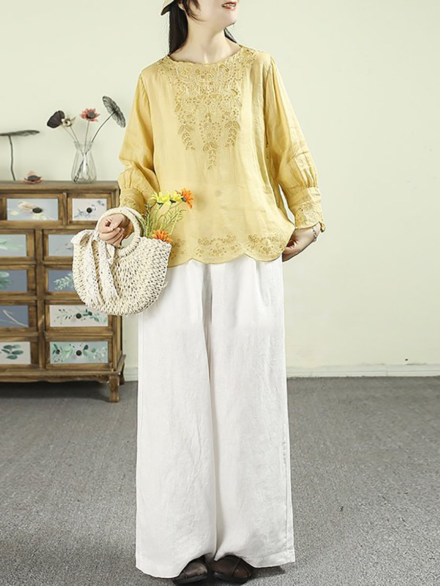 بلوزة نسائية ربيعية مطرزة برقبة دائرية مصنوعة من قماش الرامي بنسبة 100%