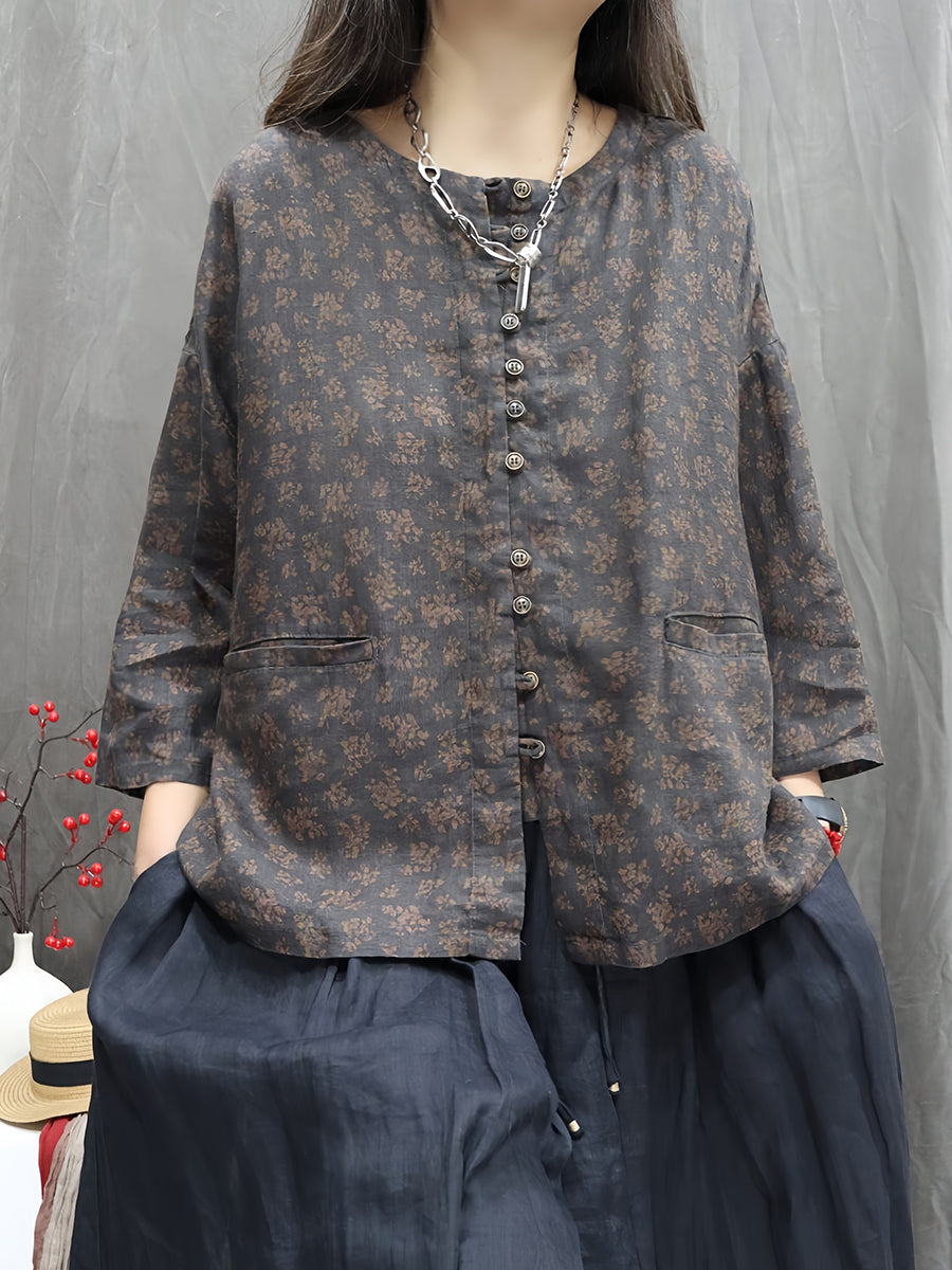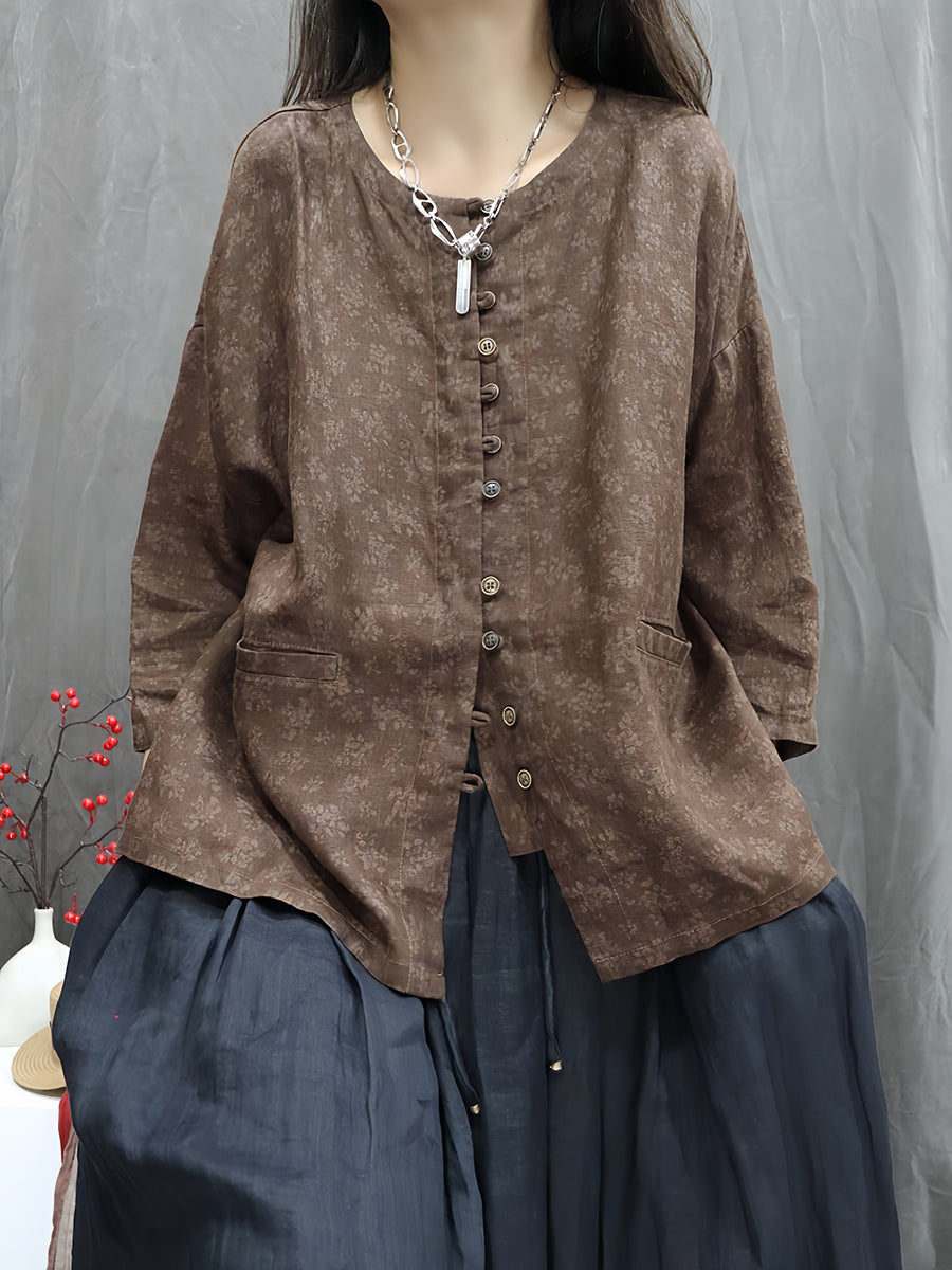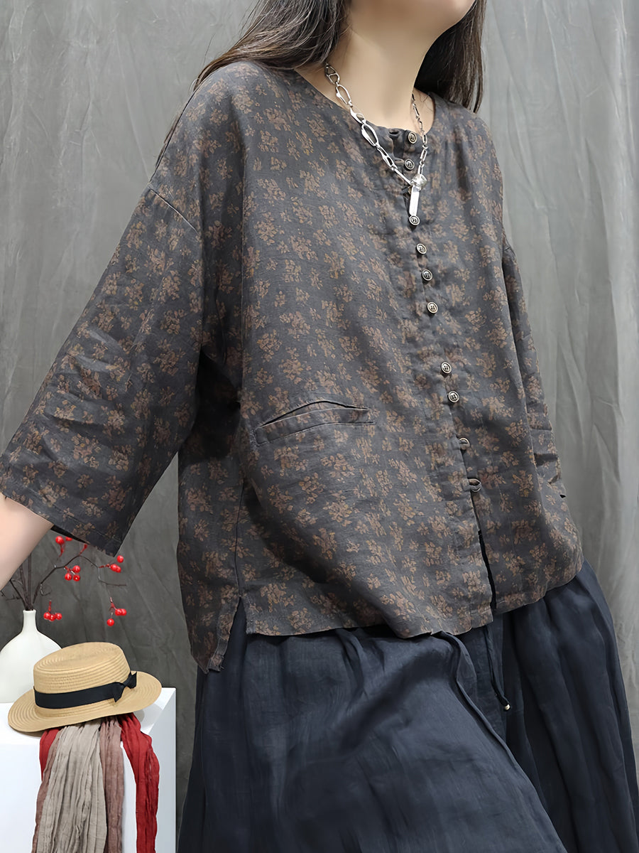 قميص نسائي ربيعي مزين بنقوش زهور، مصنوع من الكتان بنسبة 100%، بياقة دائرية
