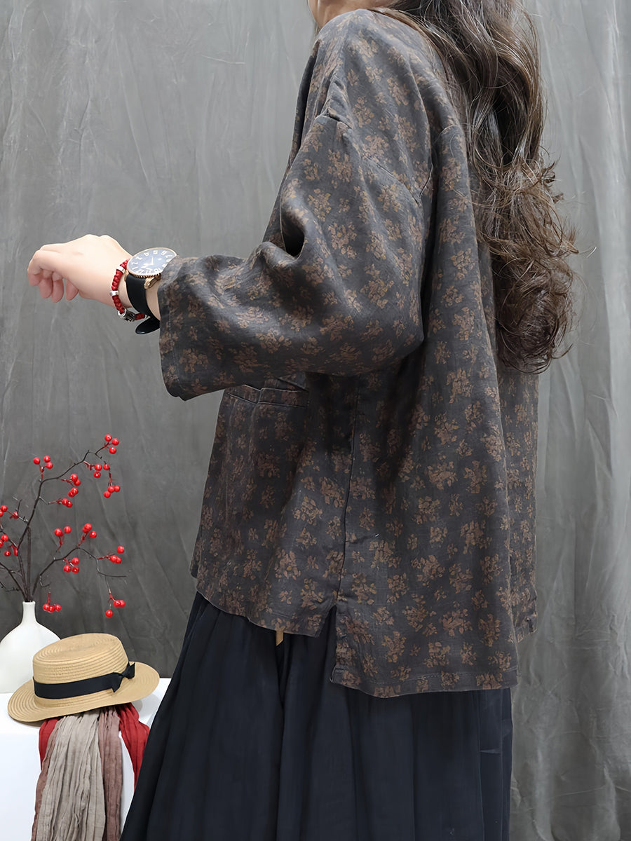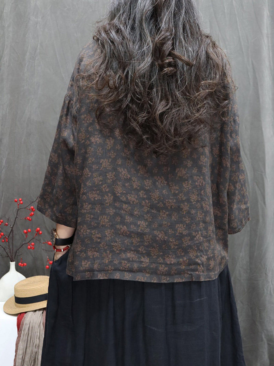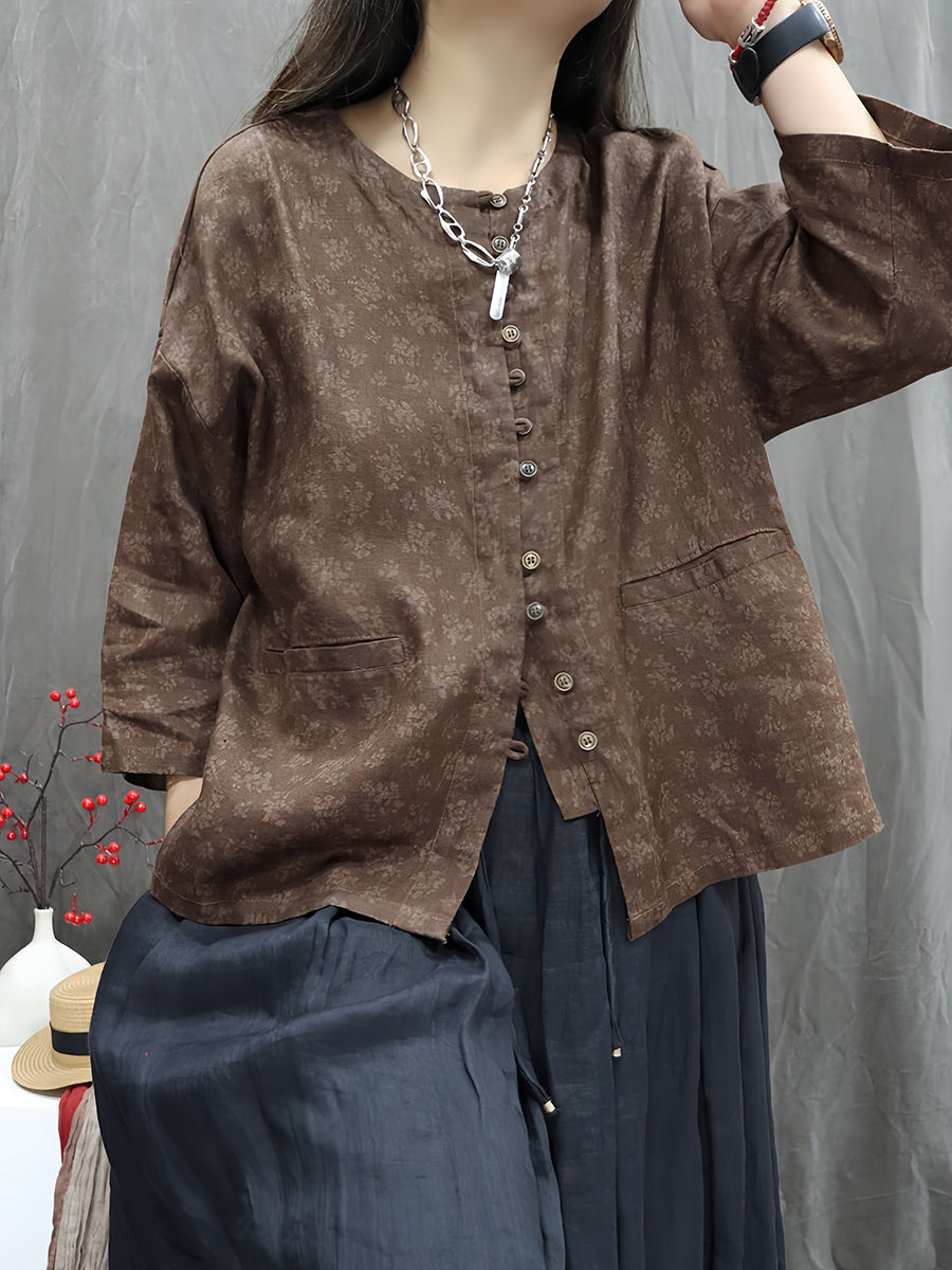قميص نسائي ربيعي مزين بنقوش زهور، مصنوع من الكتان بنسبة 100%، بياقة دائرية