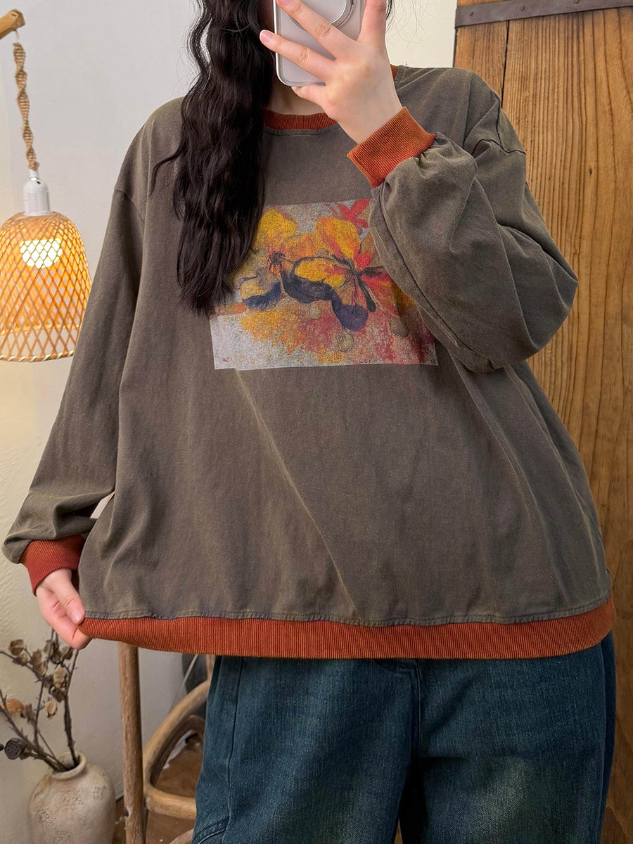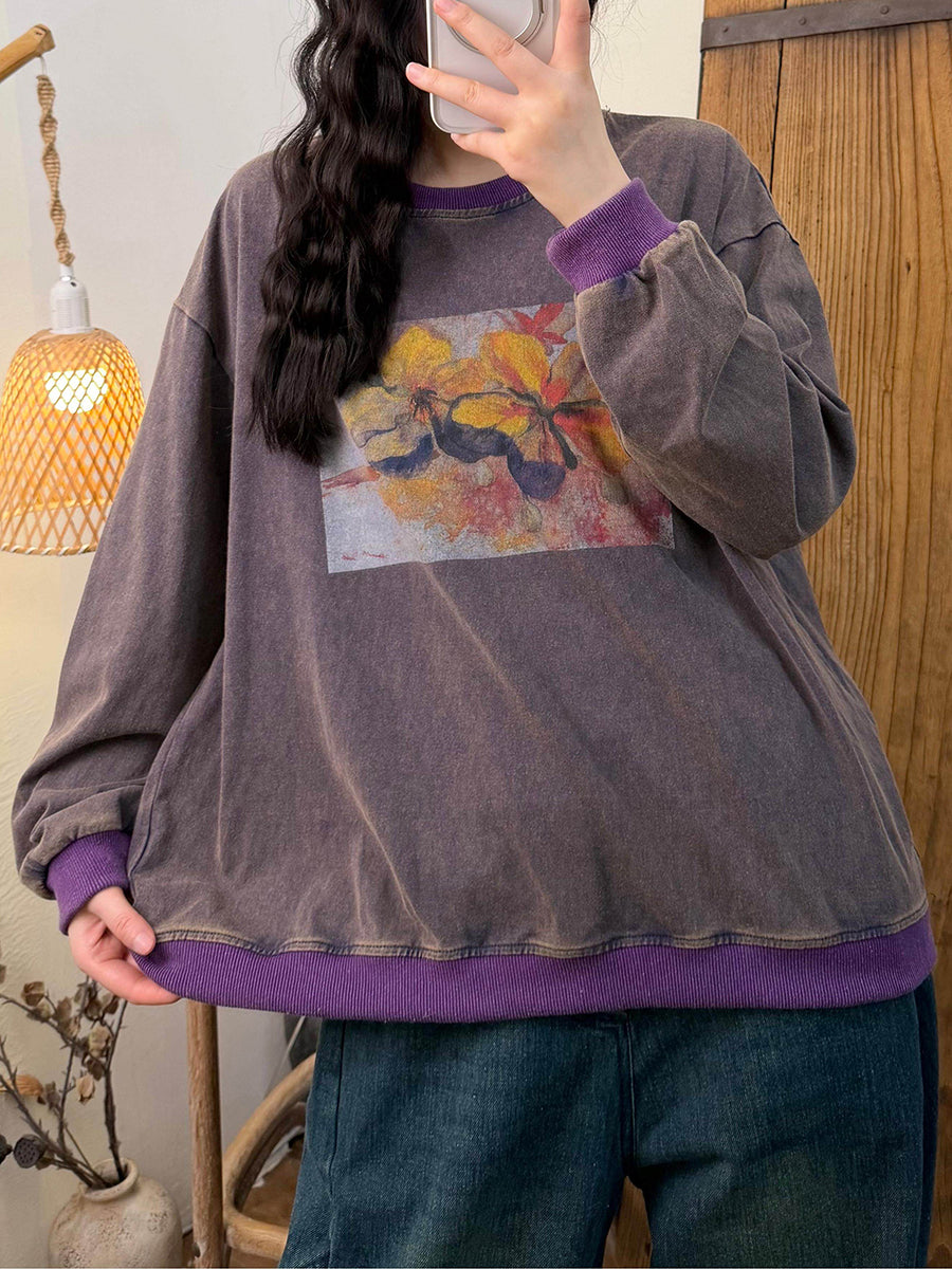 بلوزة نسائية فنية من القطن بألوان متداخلة بنقشة زهور الربيع، بياقة دائرية