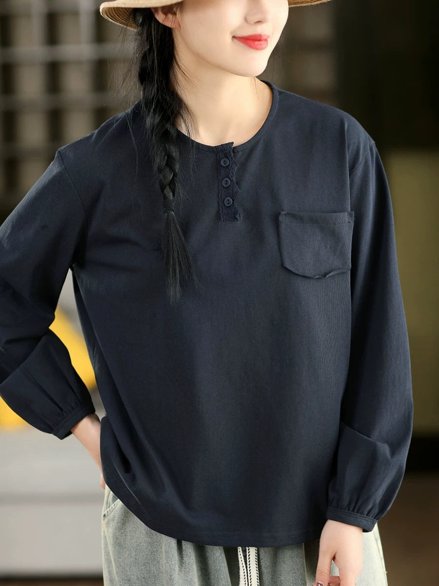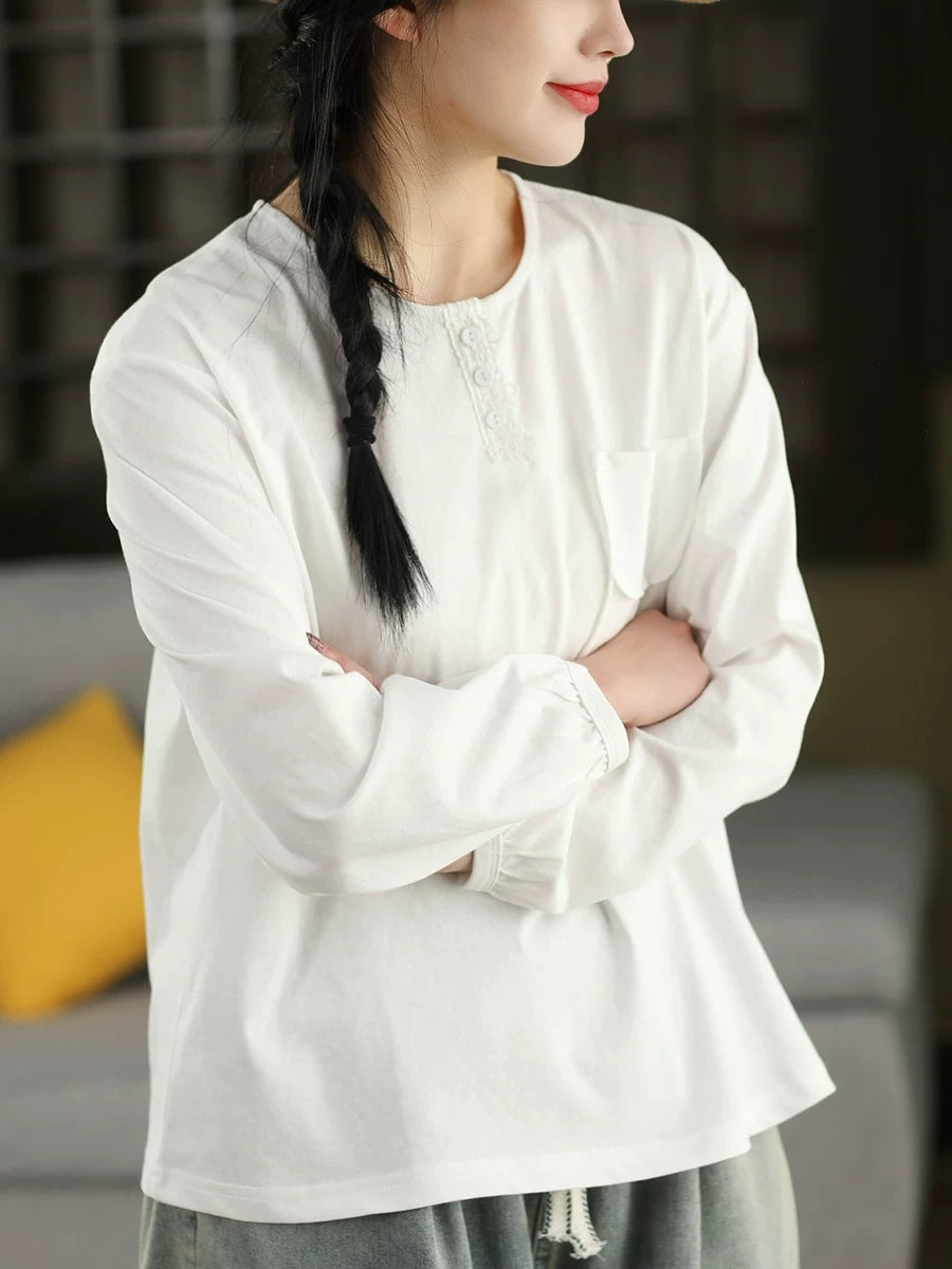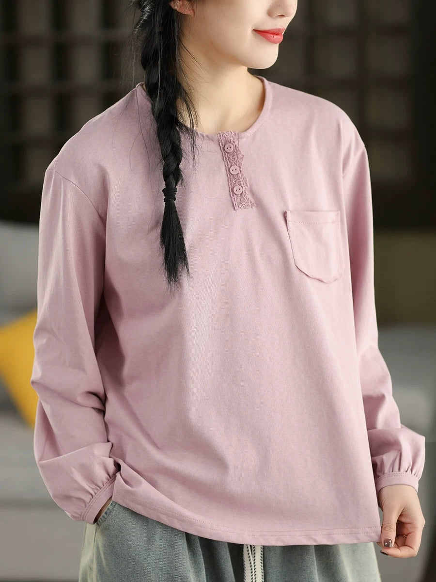 بلوزة نسائية ربيعية فنية من القطن بلون موحد بياقة دائرية