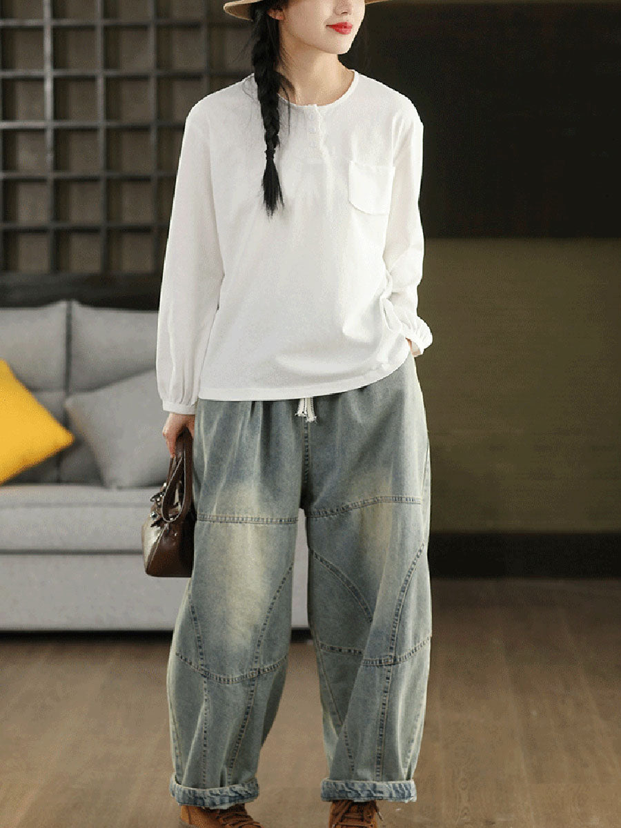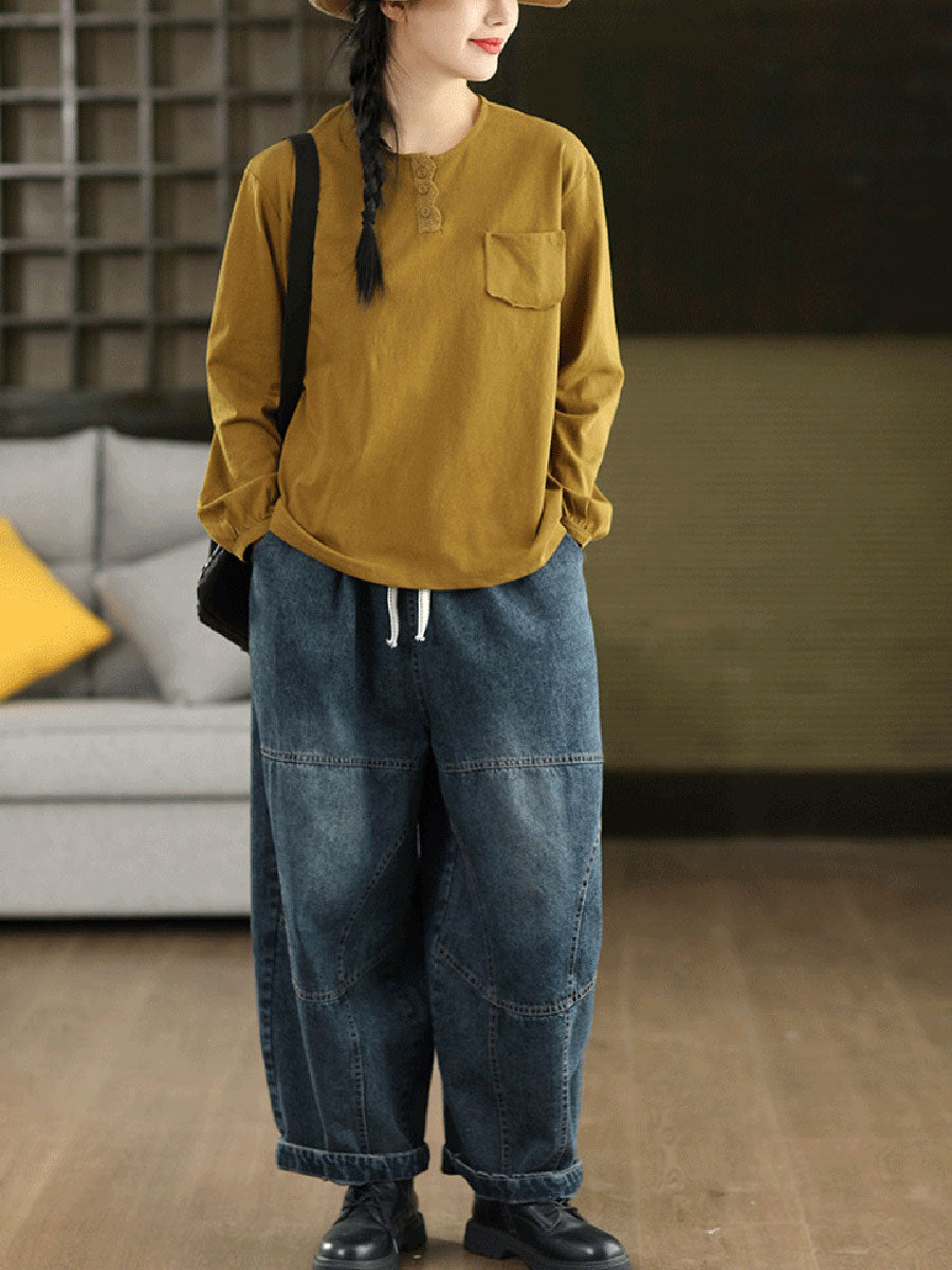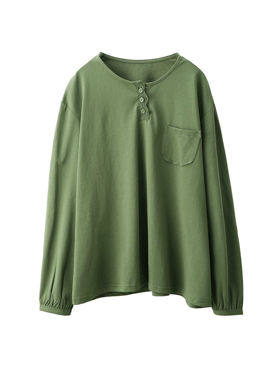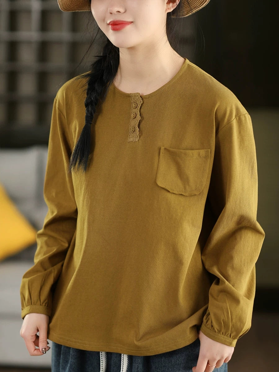 بلوزة نسائية ربيعية فنية من القطن بلون موحد بياقة دائرية