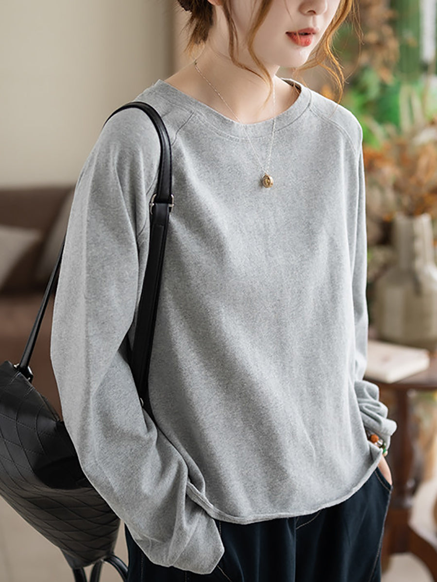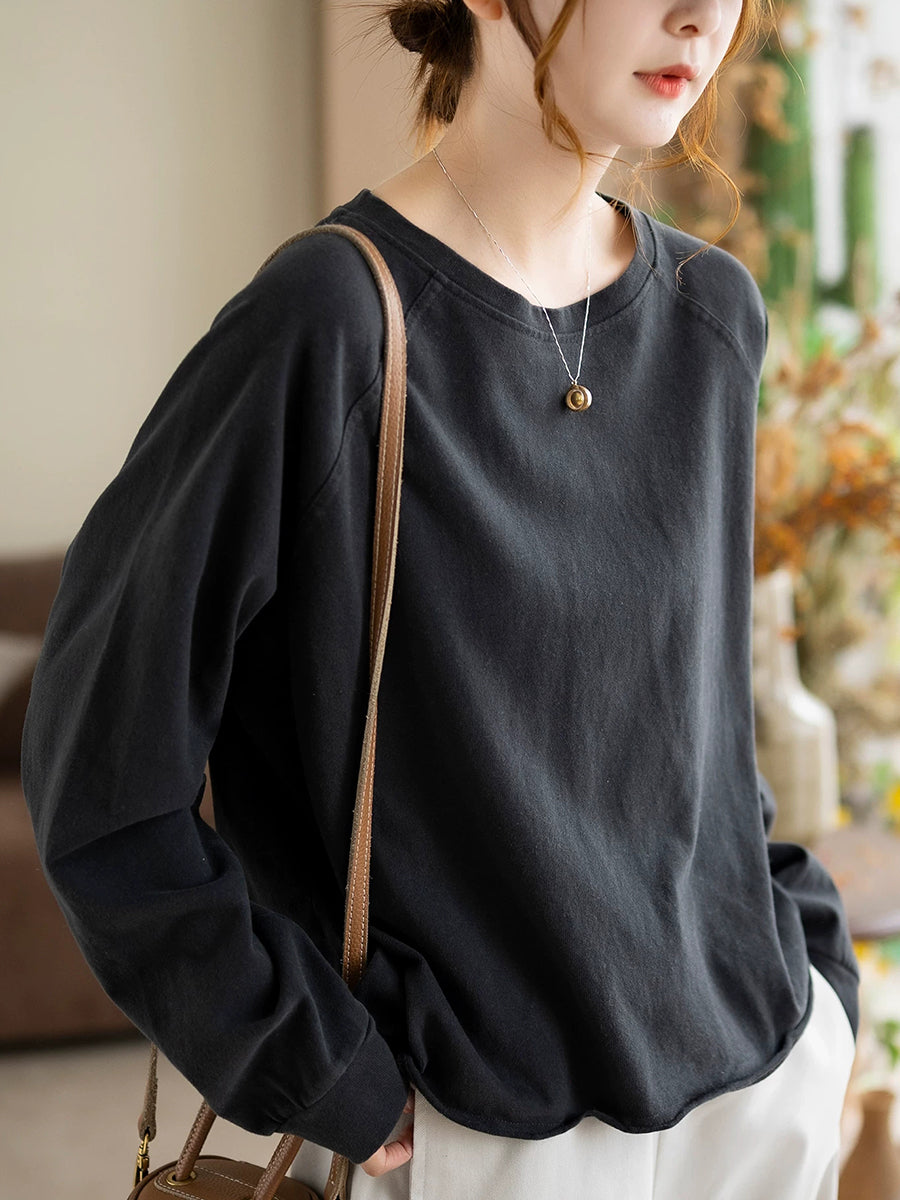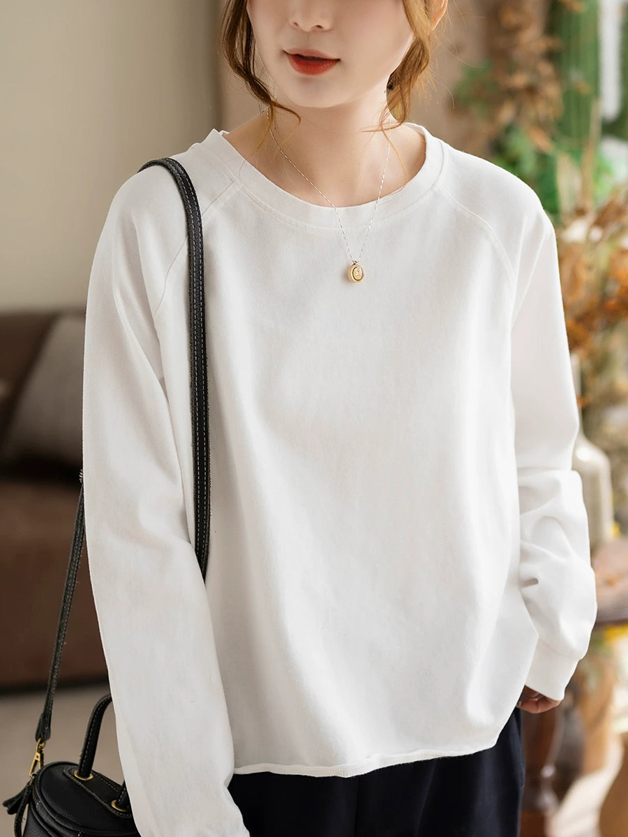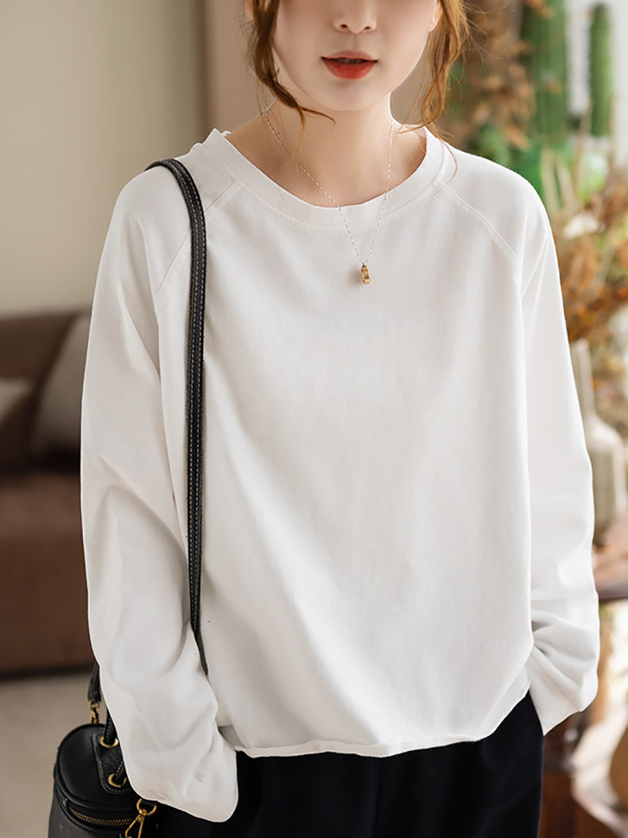 بلوزة قطنية نسائية ربيعية أنيقة بلون موحد وياقة دائرية